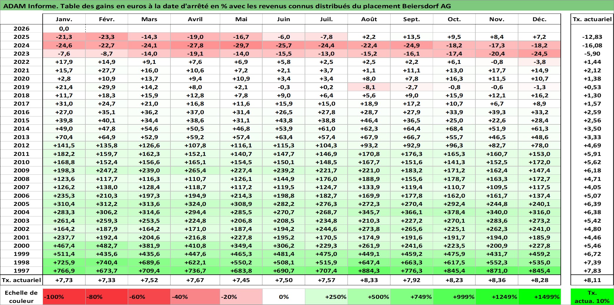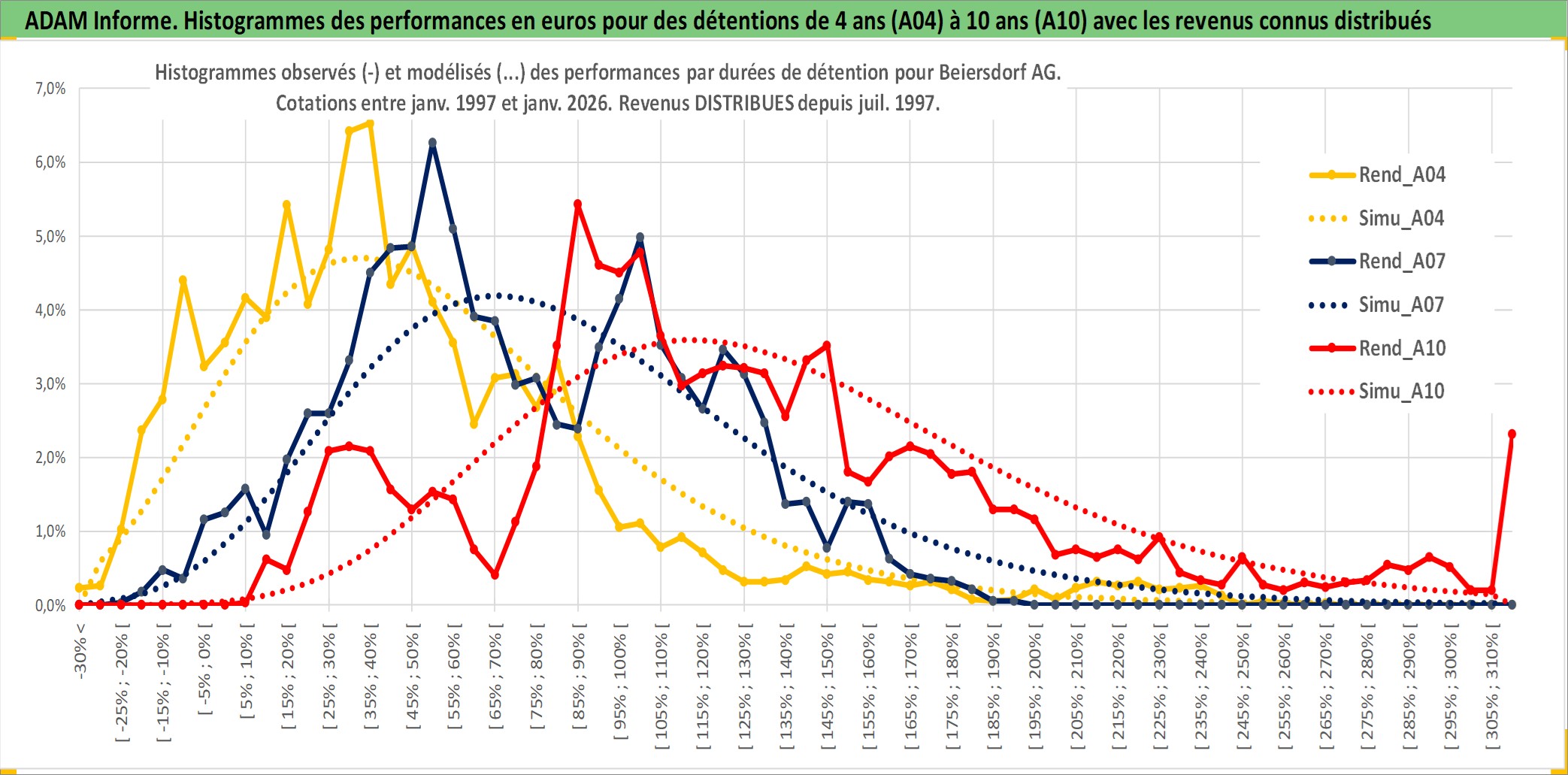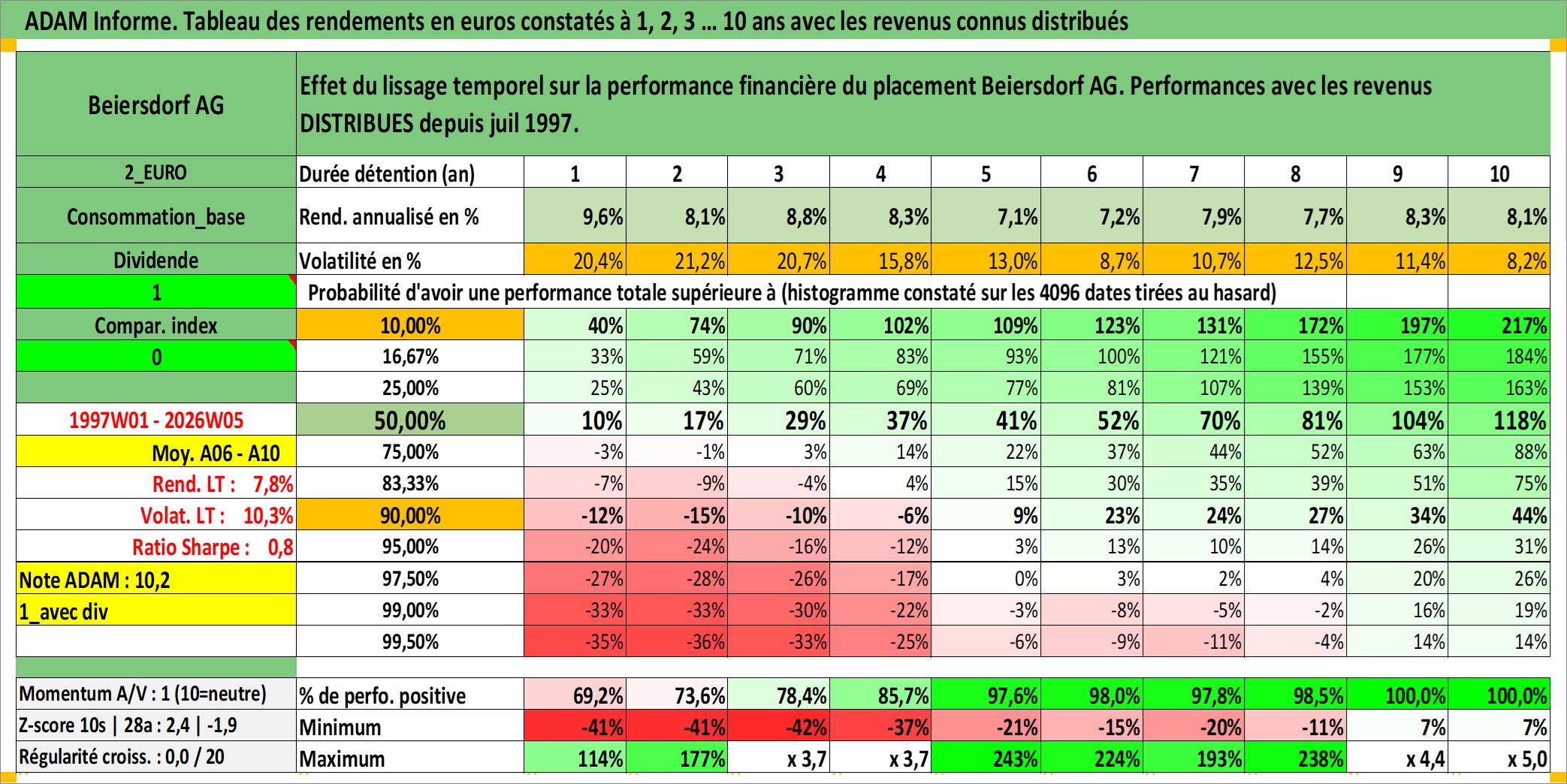 Site dédié aux investisseursPage dédiée sur site financeAnalyse des valorisations hebdomadaires de l'action Beiersdorf AG. Cet actif est cote en EUR. Les valorisations couvrent les semaines 1997W01 a 2026W05. Les revenus de cet actif financier sont pris en compte depuis la semaine 1997W27. La note globale ESG de cet actif est estimee a 6.0 (apres rebasage entre 0 et 20).