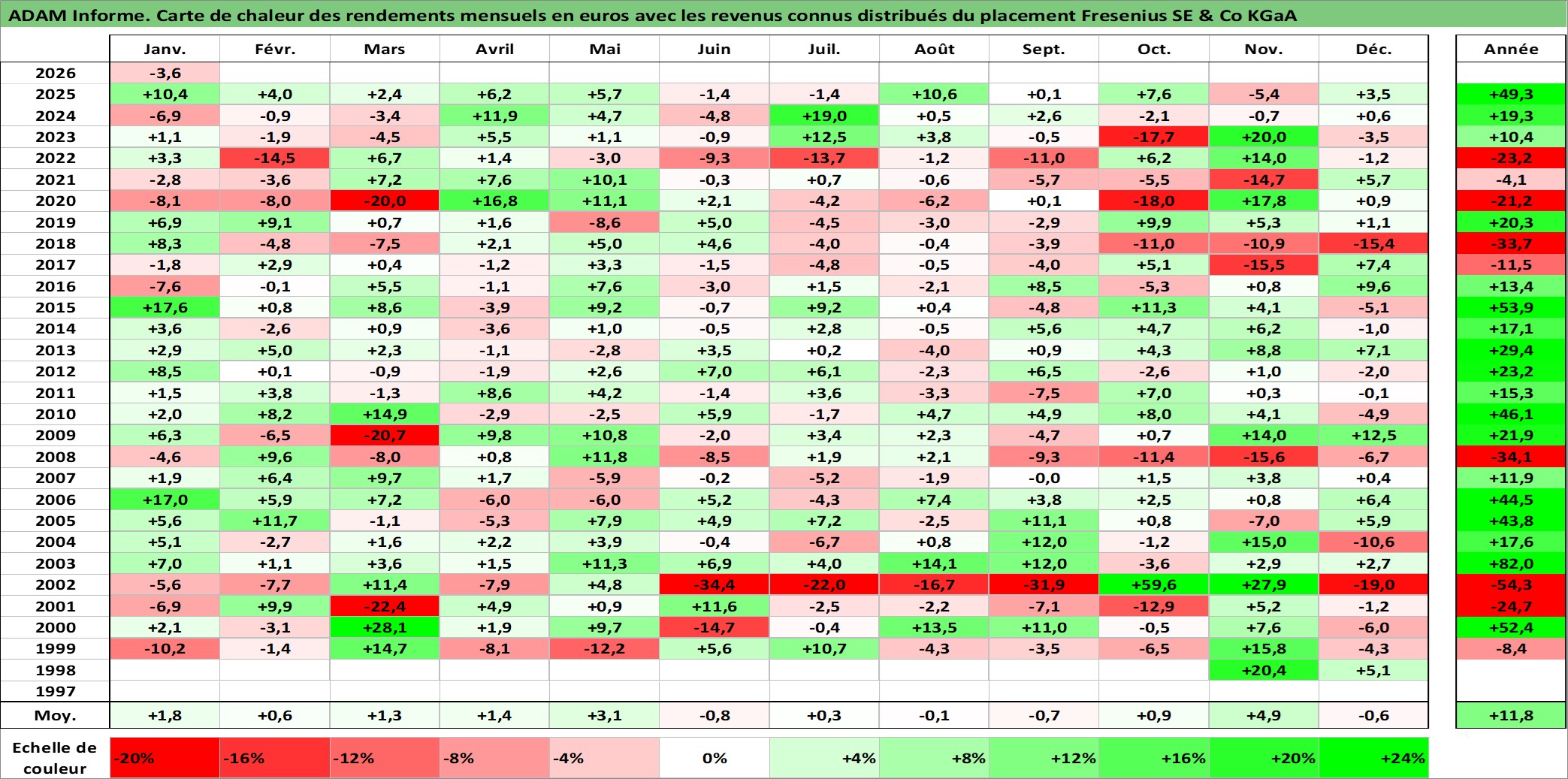 Site dédié aux investisseursPage dédiée sur site financeAnalyse des valorisations hebdomadaires de l'action Fresenius SE & Co KGaA. Cet actif est cote en EUR. Les valorisations couvrent les semaines 1998W42 a 2026W05. Les revenus de cet actif financier sont pris en compte depuis la semaine 1999W23. La note globale ESG de cet actif est estimee a 10.0 (apres rebasage entre 0 et 20).