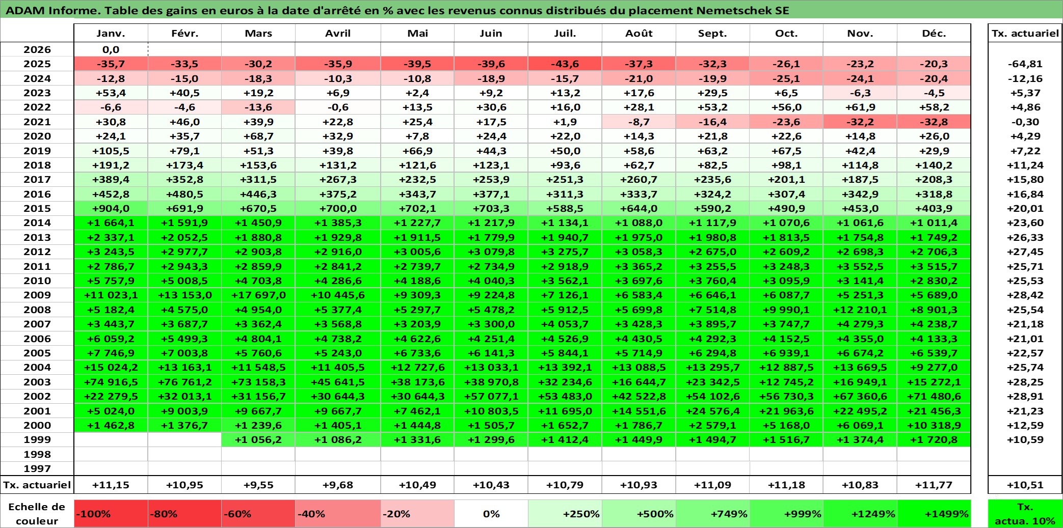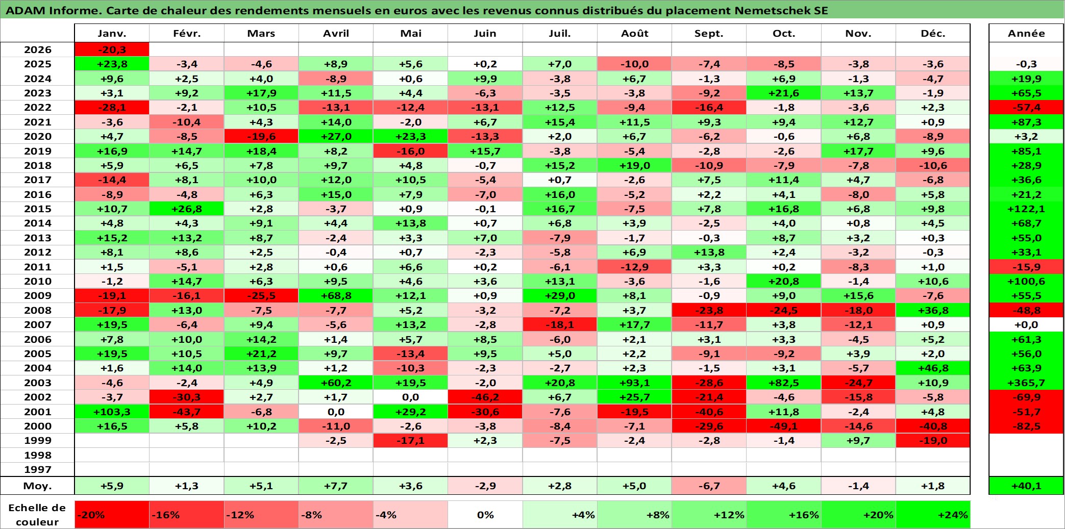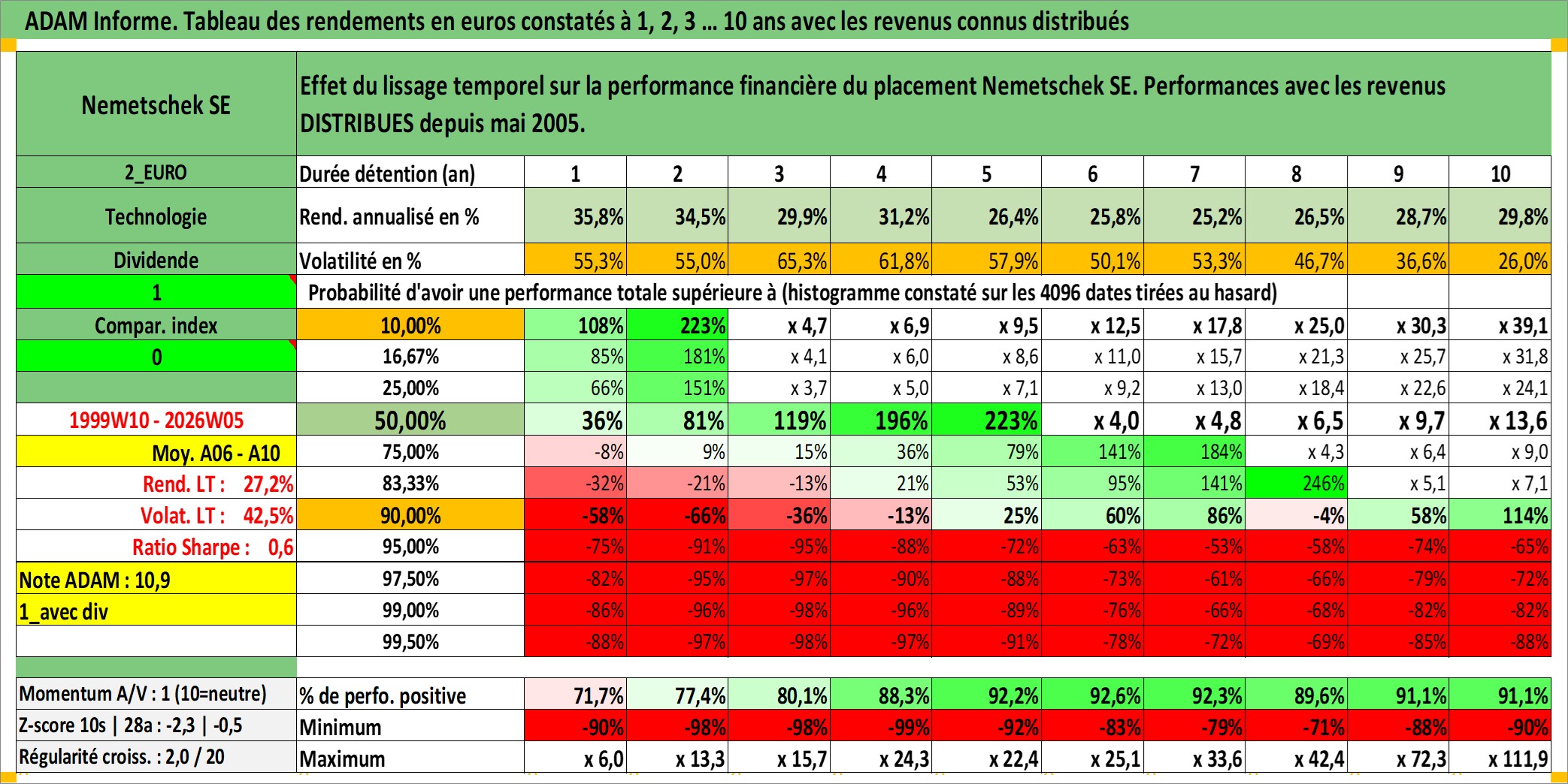 Site dédié aux investisseursPage dédiée sur site financeAnalyse des valorisations hebdomadaires de l'action Nemetschek SE. Cet actif est cote en EUR. Les valorisations couvrent les semaines 1999W10 a 2026W05. Les revenus de cet actif financier sont pris en compte depuis la semaine 2005W21. La note ESG de cet actif n'est pas connue.