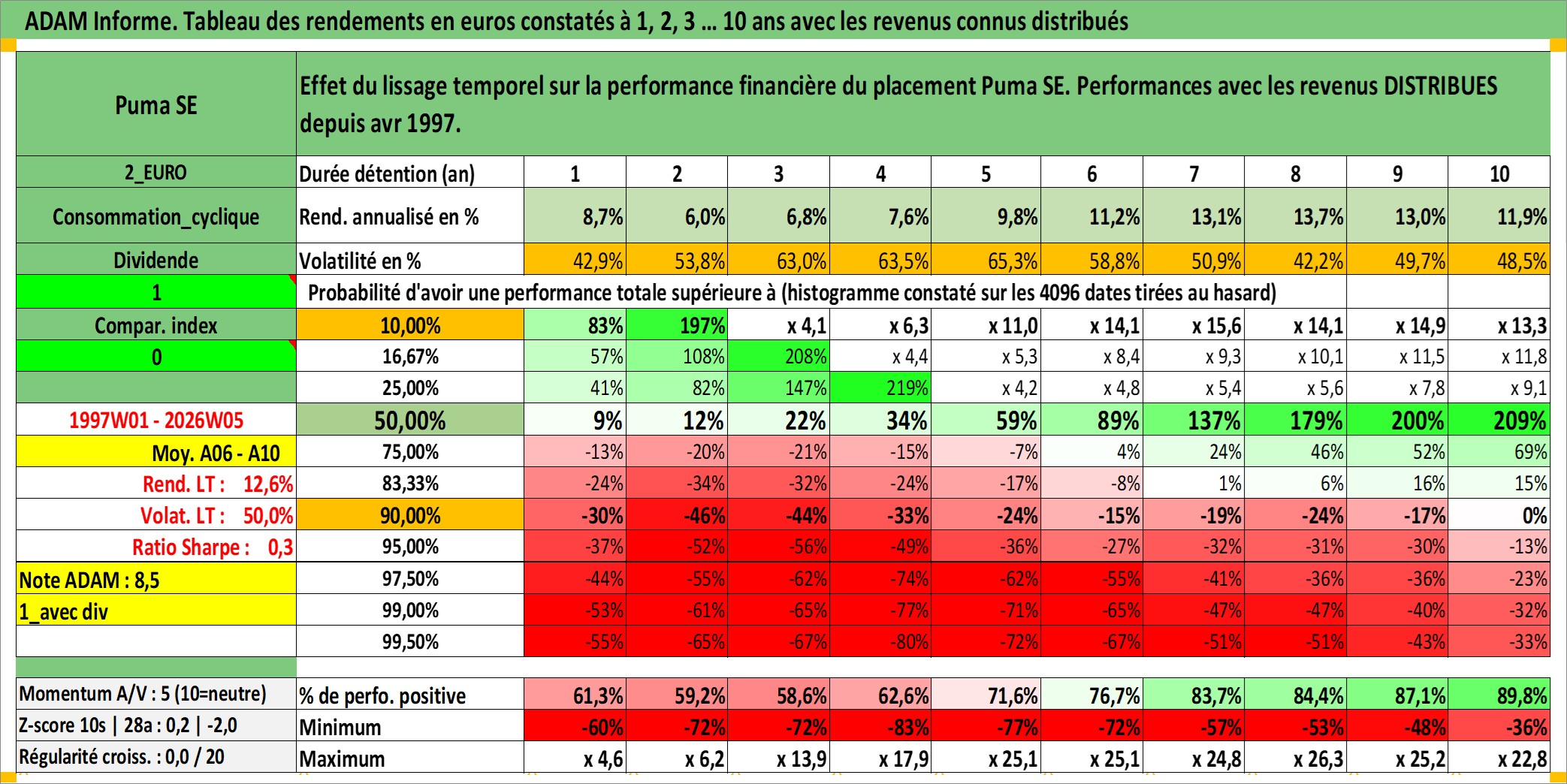 Site dédié aux investisseursPage dédiée sur site financeAnalyse des valorisations hebdomadaires de l'action Puma SE. Cet actif est cote en EUR. Les valorisations couvrent les semaines 1997W01 a 2026W05. Les revenus de cet actif financier sont pris en compte depuis la semaine 1997W17. La note ESG de cet actif n'est pas connue.