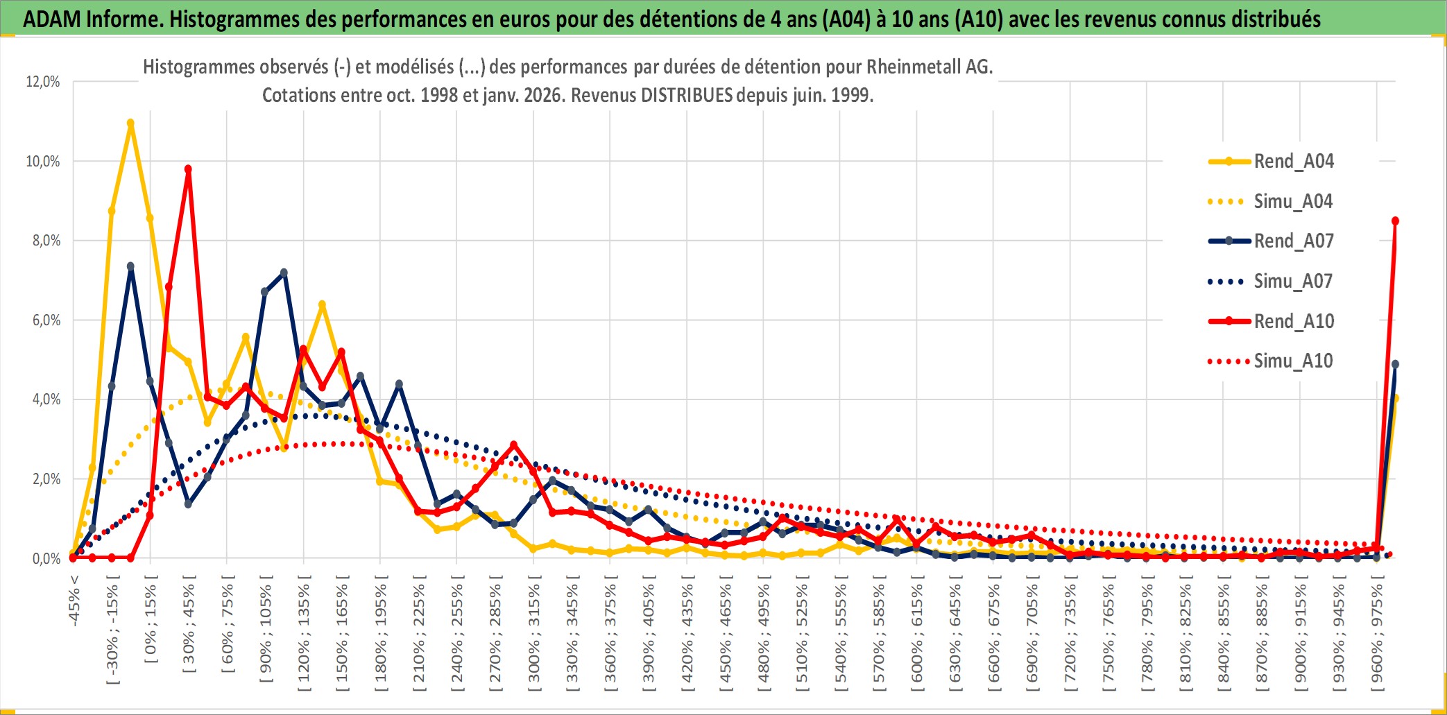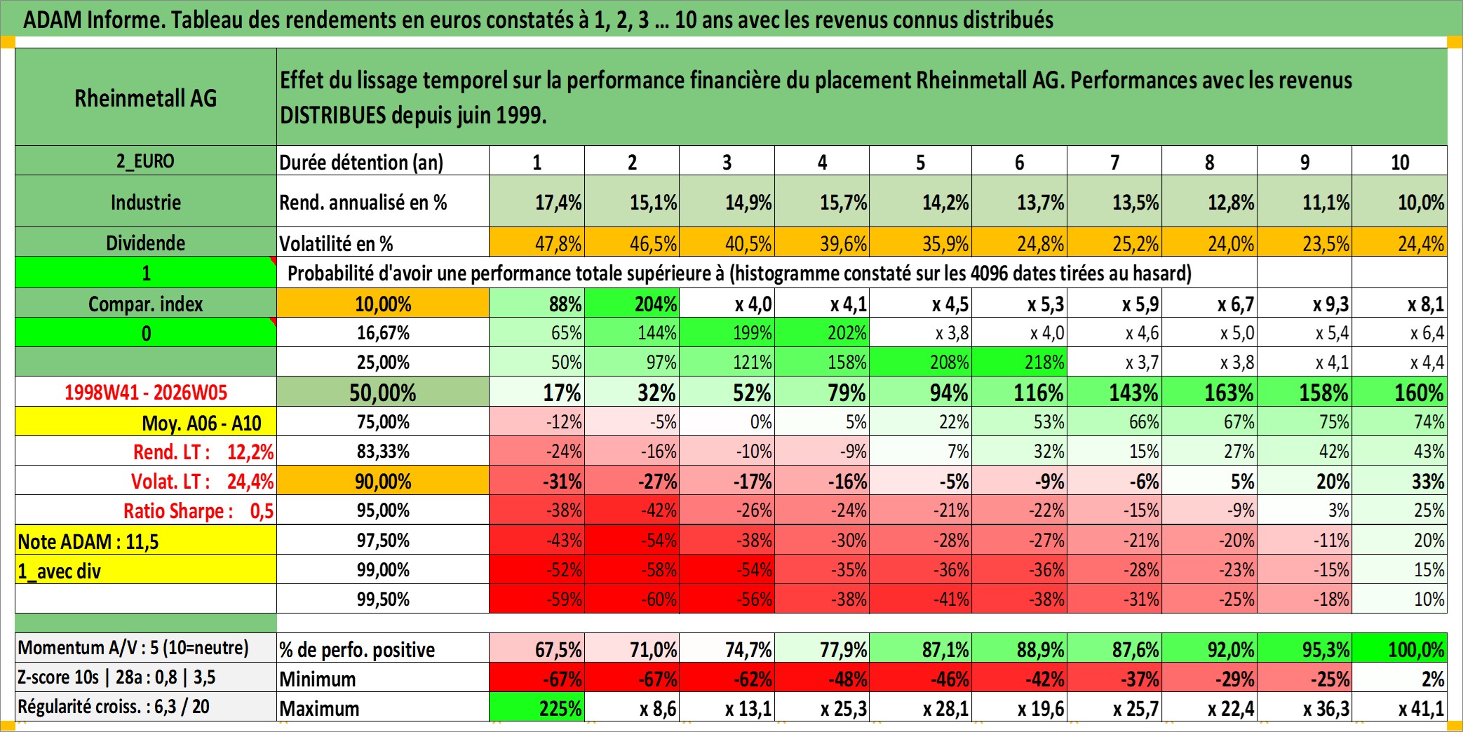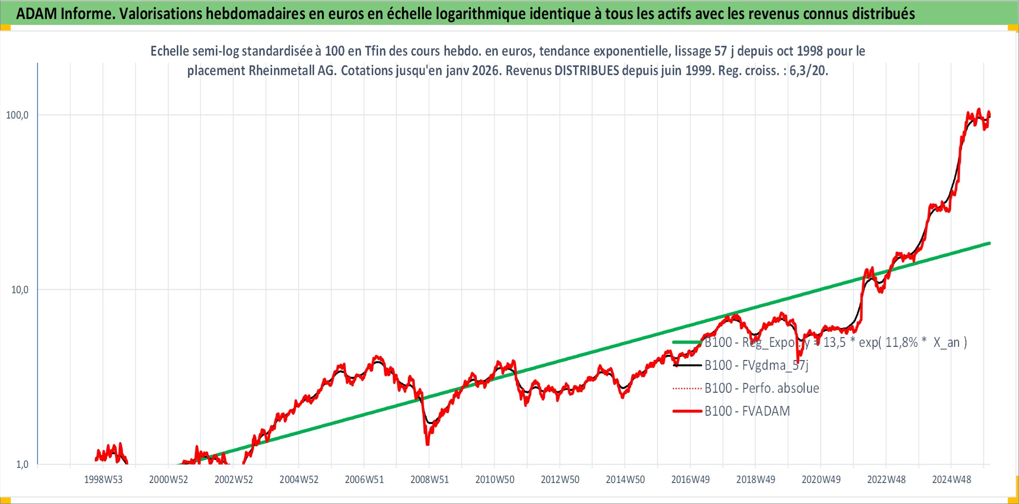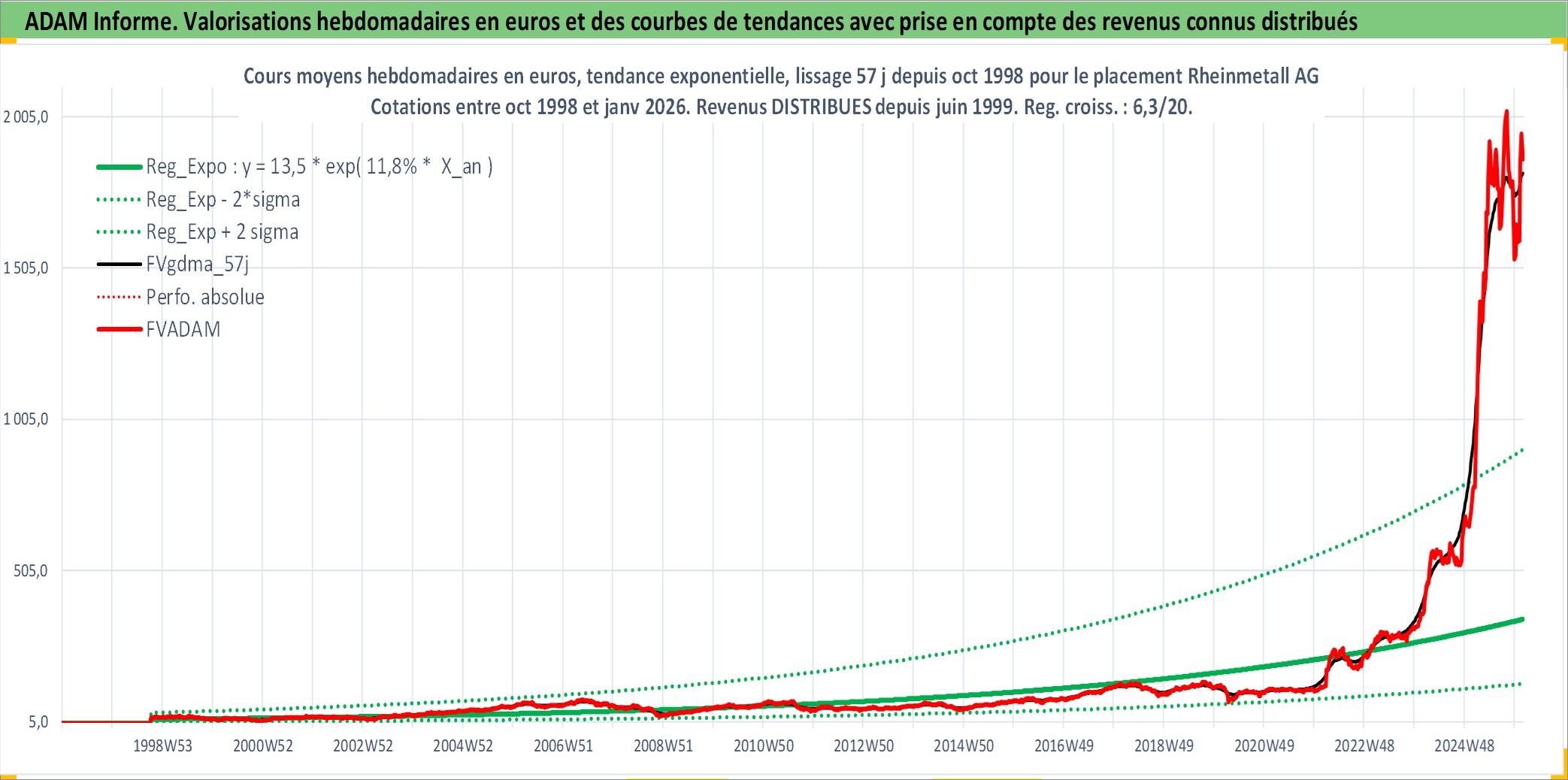 Site dédié aux investisseursPage dédiée sur site financeAnalyse des valorisations hebdomadaires de l'action Rheinmetall AG. Cet actif est cote en EUR. Les valorisations couvrent les semaines 1998W41 a 2026W05. Les revenus de cet actif financier sont pris en compte depuis la semaine 1999W25. La note ESG de cet actif n'est pas connue.