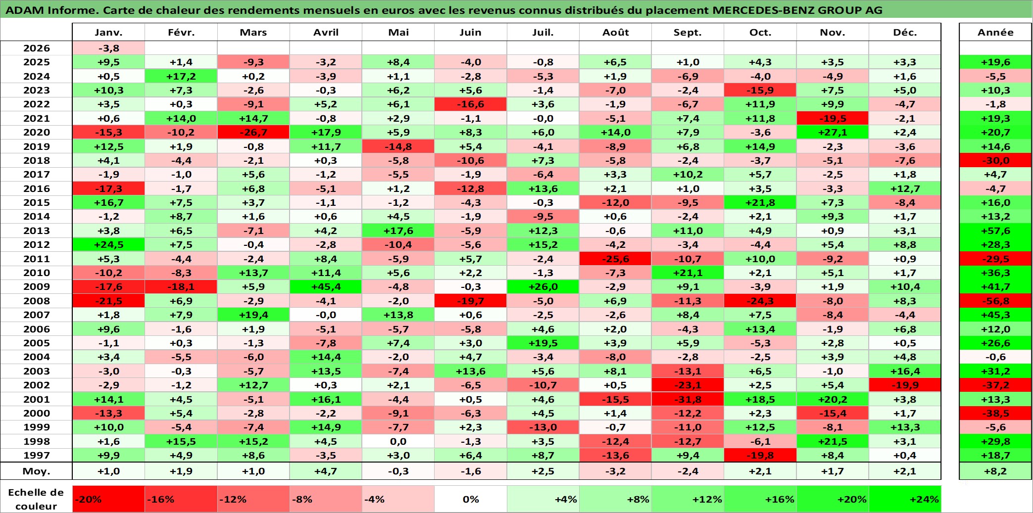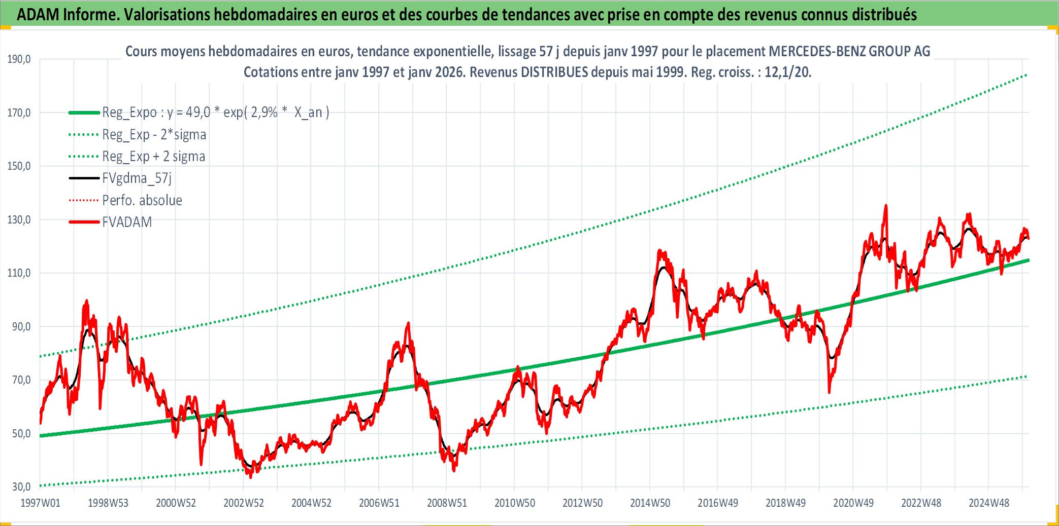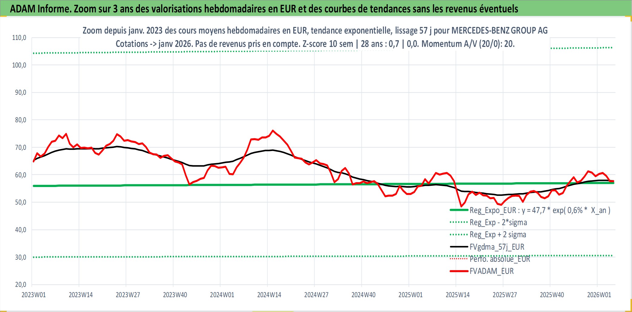 Site dédié aux investisseursPage dédiée sur site financeAnalyse des valorisations hebdomadaires de l'action MERCEDES-BENZ GROUP AG. Cet actif est cote en EUR. Les valorisations couvrent les semaines 1997W01 a 2026W05. Les revenus de cet actif financier sont pris en compte depuis la semaine 1999W20. La note globale ESG de cet actif est estimee a 9.0 (apres rebasage entre 0 et 20).
