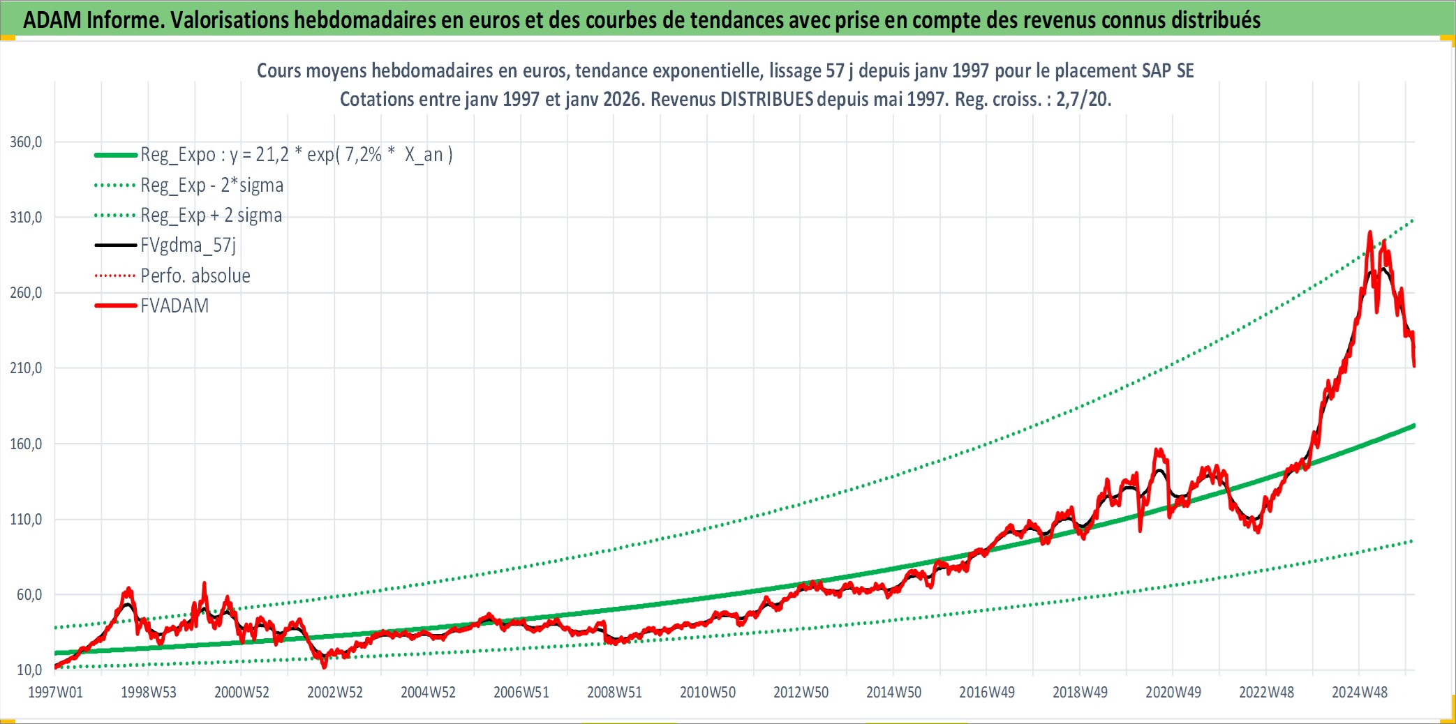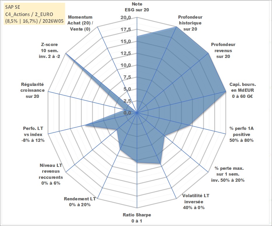 Site dédié aux investisseursPage dédiée sur site financeAnalyse des valorisations hebdomadaires de l'action SAP SE. Cet actif est cote en EUR. Les valorisations couvrent les semaines 1997W01 a 2026W05. Les revenus de cet actif financier sont pris en compte depuis la semaine 1997W19. La note globale ESG de cet actif est estimee a 16.0 (apres rebasage entre 0 et 20).