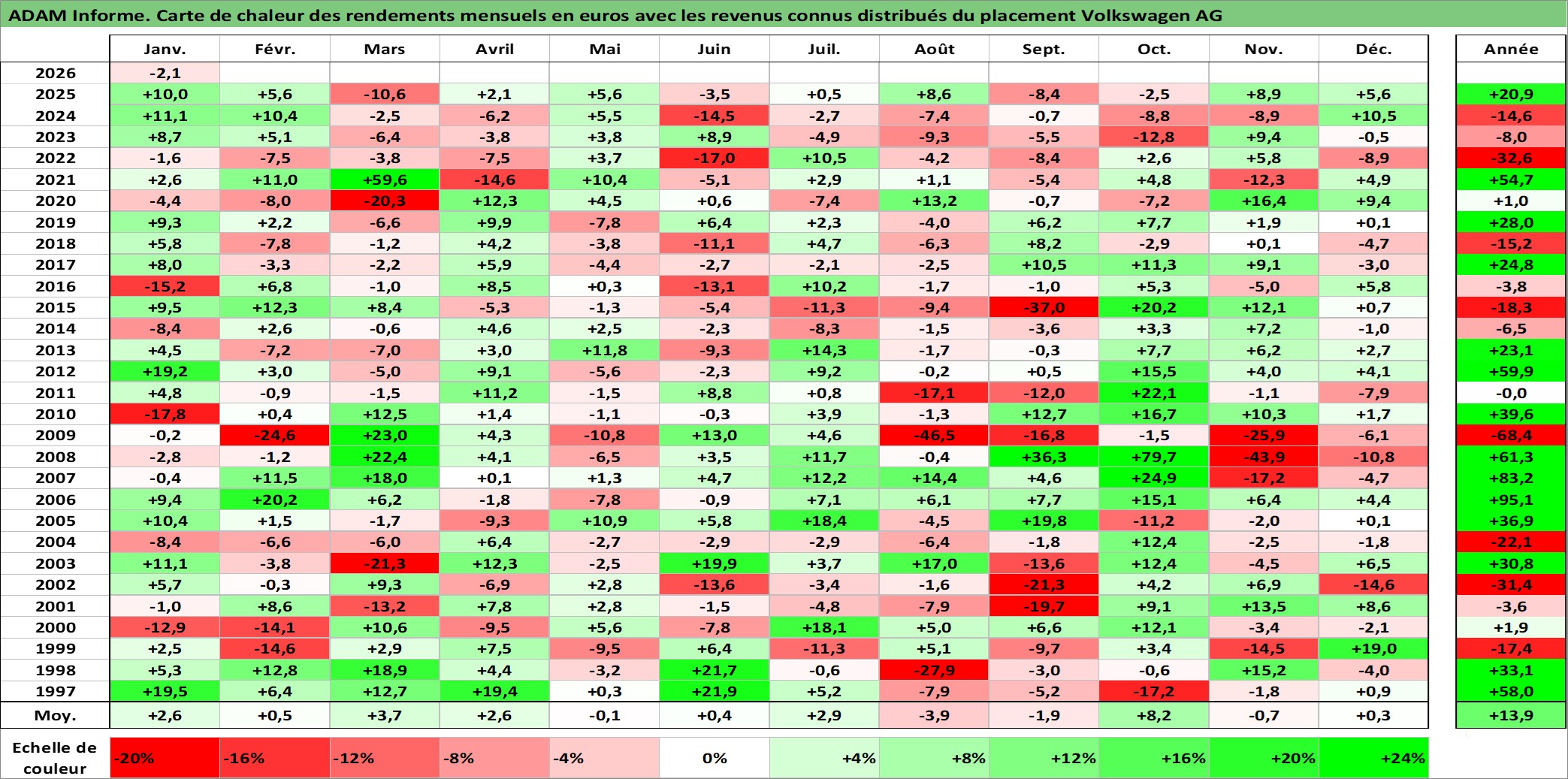 Site dédié aux investisseursPage dédiée sur site financeAnalyse des valorisations hebdomadaires de l'action Volkswagen AG. Cet actif est cote en EUR. Les valorisations couvrent les semaines 1997W01 a 2026W05. Les revenus de cet actif financier sont pris en compte depuis la semaine 1997W25. La note ESG de cet actif n'est pas connue.
