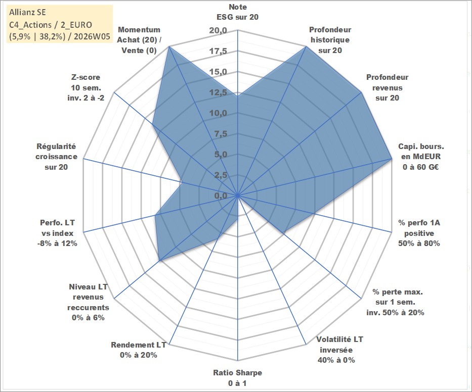 Site dédié aux investisseursPage dédiée sur site financeAnalyse des valorisations hebdomadaires de l'action Allianz SE. Cet actif est cote en EUR. Les valorisations couvrent les semaines 1997W01 a 2026W05. Les revenus de cet actif financier sont pris en compte depuis la semaine 1997W28. La note globale ESG de cet actif est estimee a 12.0 (apres rebasage entre 0 et 20).