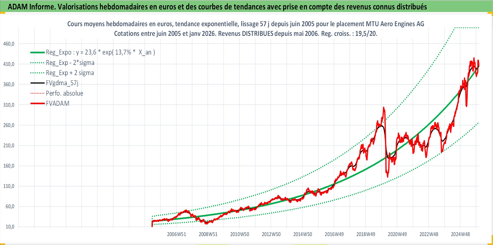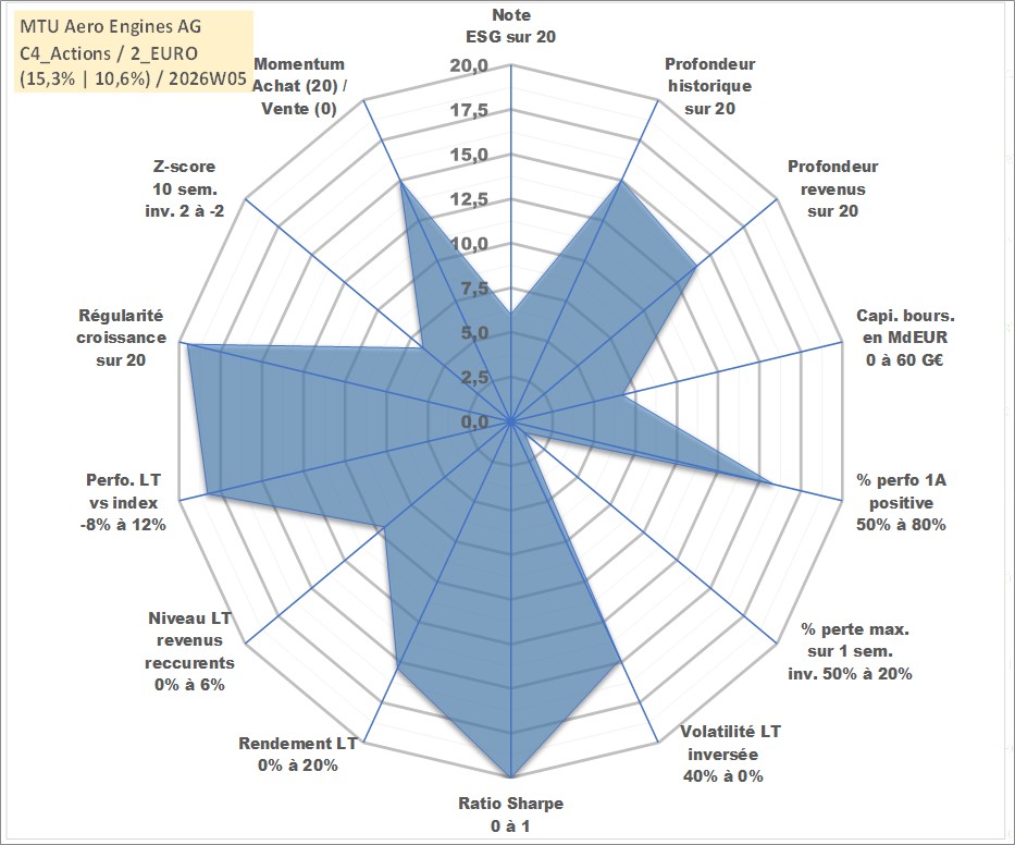 Site dédié aux investisseursPage dédiée sur site financeAnalyse des valorisations hebdomadaires de l'action MTU Aero Engines AG. Cet actif est cote en EUR. Les valorisations couvrent les semaines 2005W23 a 2026W05. Les revenus de cet actif financier sont pris en compte depuis la semaine 2006W20. La note globale ESG de cet actif est estimee a 6.0 (apres rebasage entre 0 et 20).