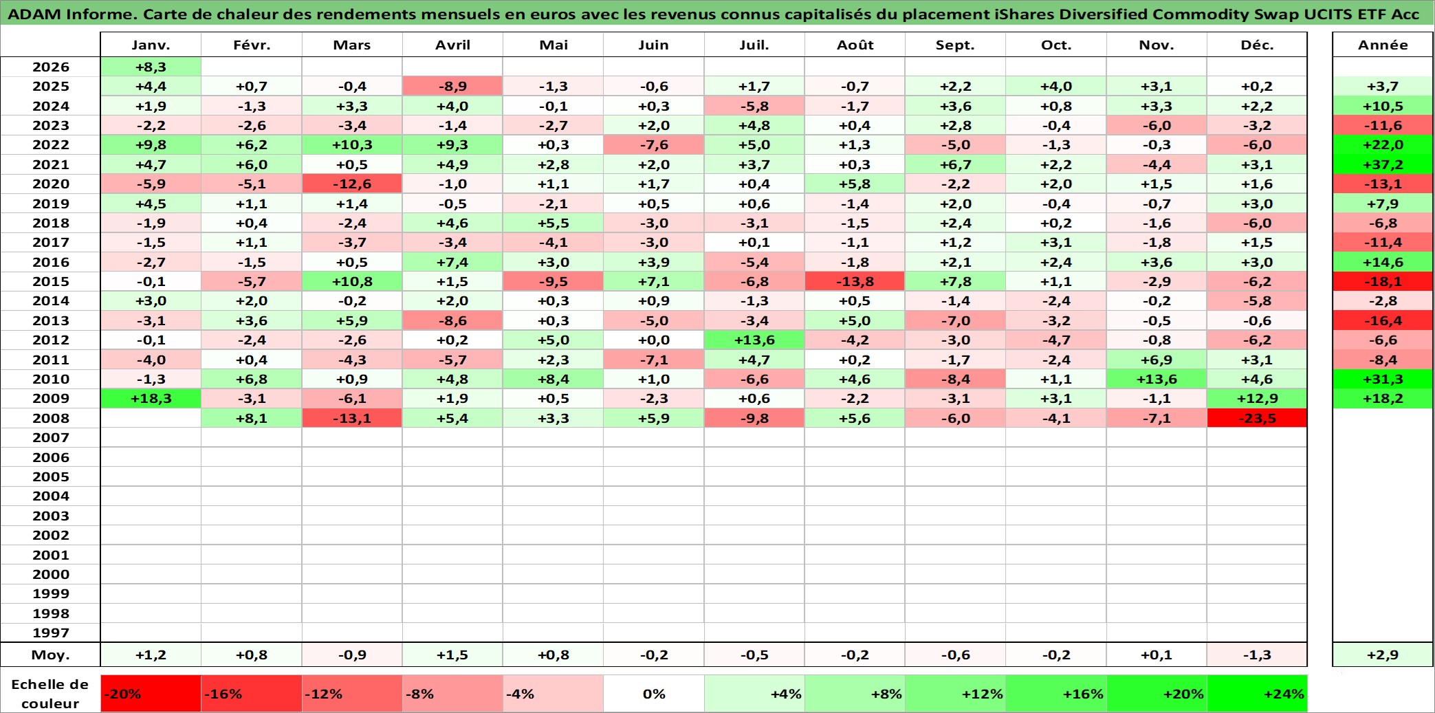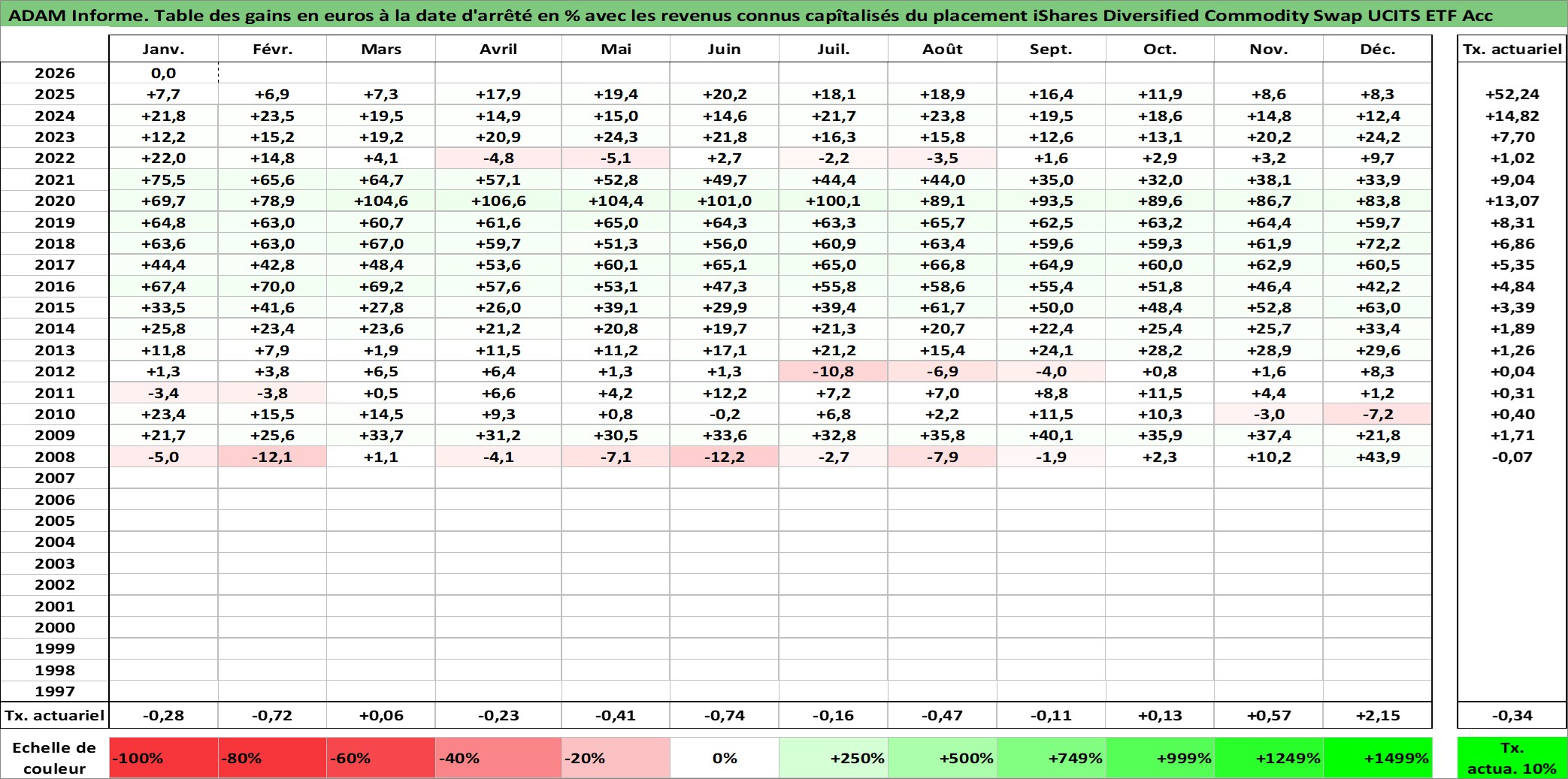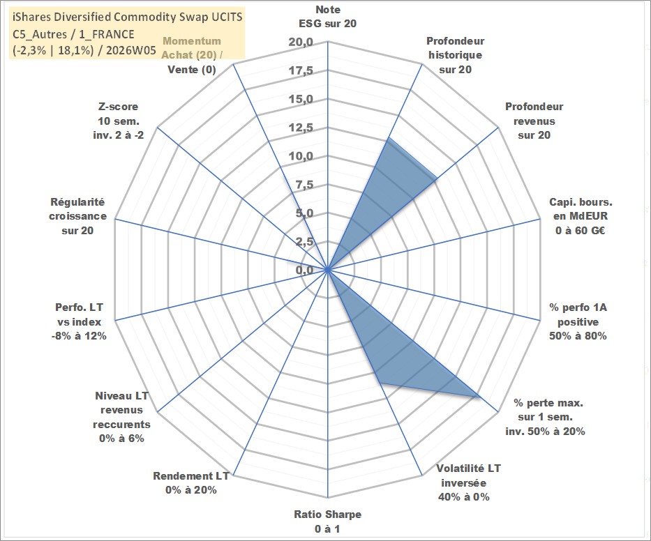 Site dédié aux investisseursPage dédiée sur site financeAnalyse des valorisations hebdomadaires du fonds iShares Diversified Commodity Swap UCITS ETF Acc. Cet actif est cote en USD. Les valorisations sont en contrevaleur EURO et couvrent les semaines 2008W01 a 2026W05. Les revenus de cet actif financier sont pris en compte depuis la semaine 2008W01. La note ESG de cet actif n'est pas connue.