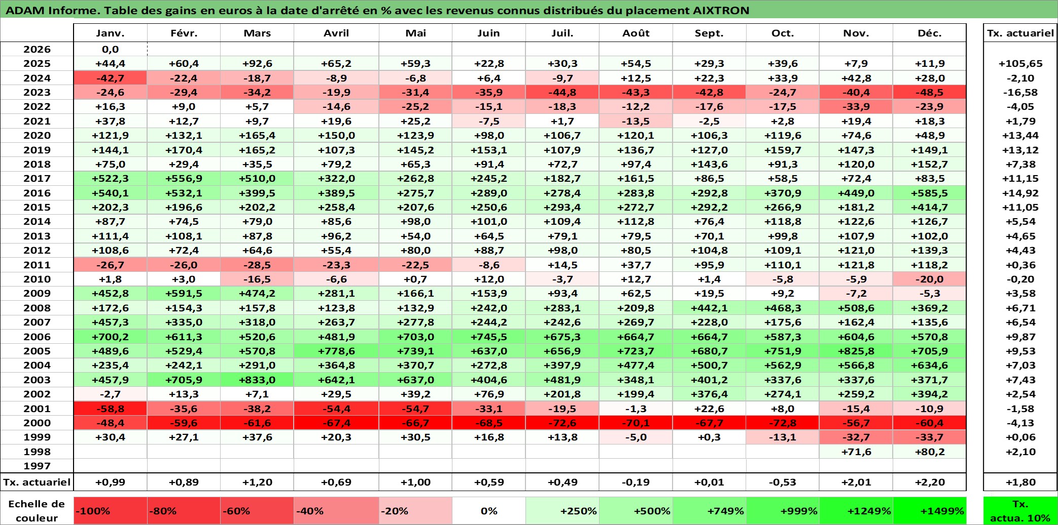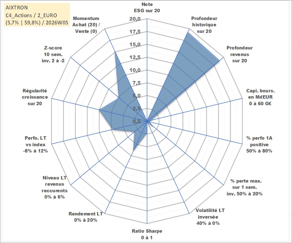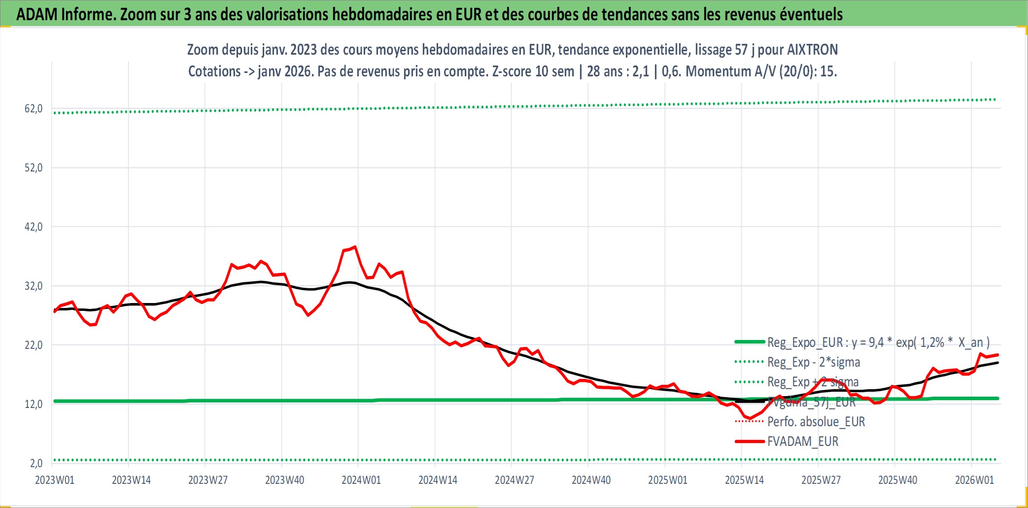 Site dédié aux investisseursPage dédiée sur site financeAnalyse des valorisations hebdomadaires de l'action AIXTRON. Cet actif est cote en EUR. Les valorisations couvrent les semaines 1998W46 a 2026W05. Les revenus de cet actif financier sont pris en compte depuis la semaine 2000W22. La note ESG de cet actif n'est pas connue.