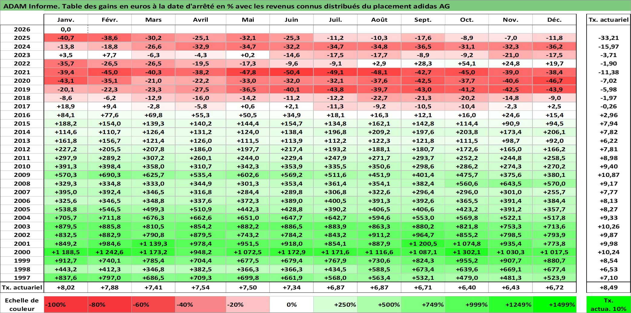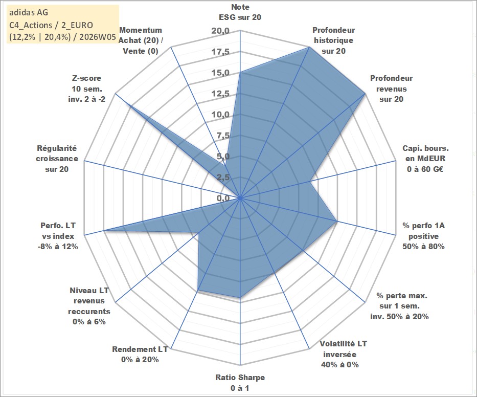 Site dédié aux investisseursPage dédiée sur site financeAnalyse des valorisations hebdomadaires de l'action adidas AG. Cet actif est cote en EUR. Les valorisations couvrent les semaines 1997W01 a 2026W05. Les revenus de cet actif financier sont pris en compte depuis la semaine 1997W22. La note globale ESG de cet actif est estimee a 15.0 (apres rebasage entre 0 et 20).