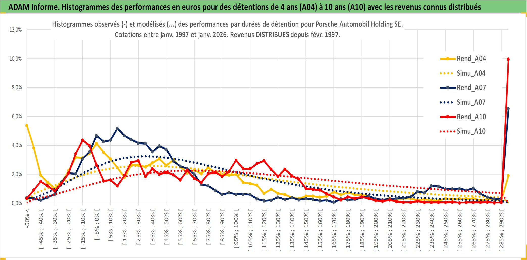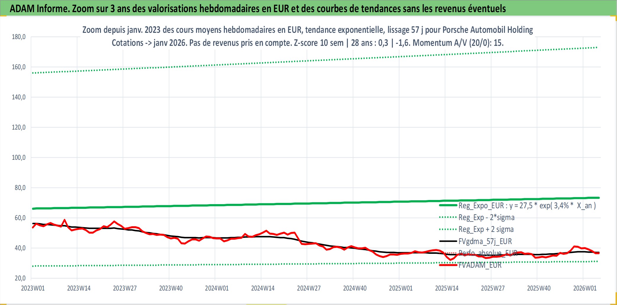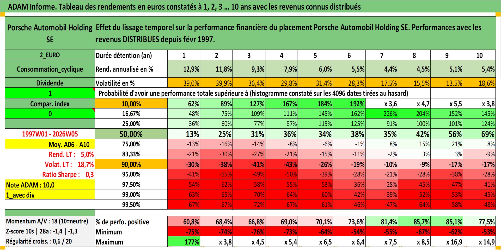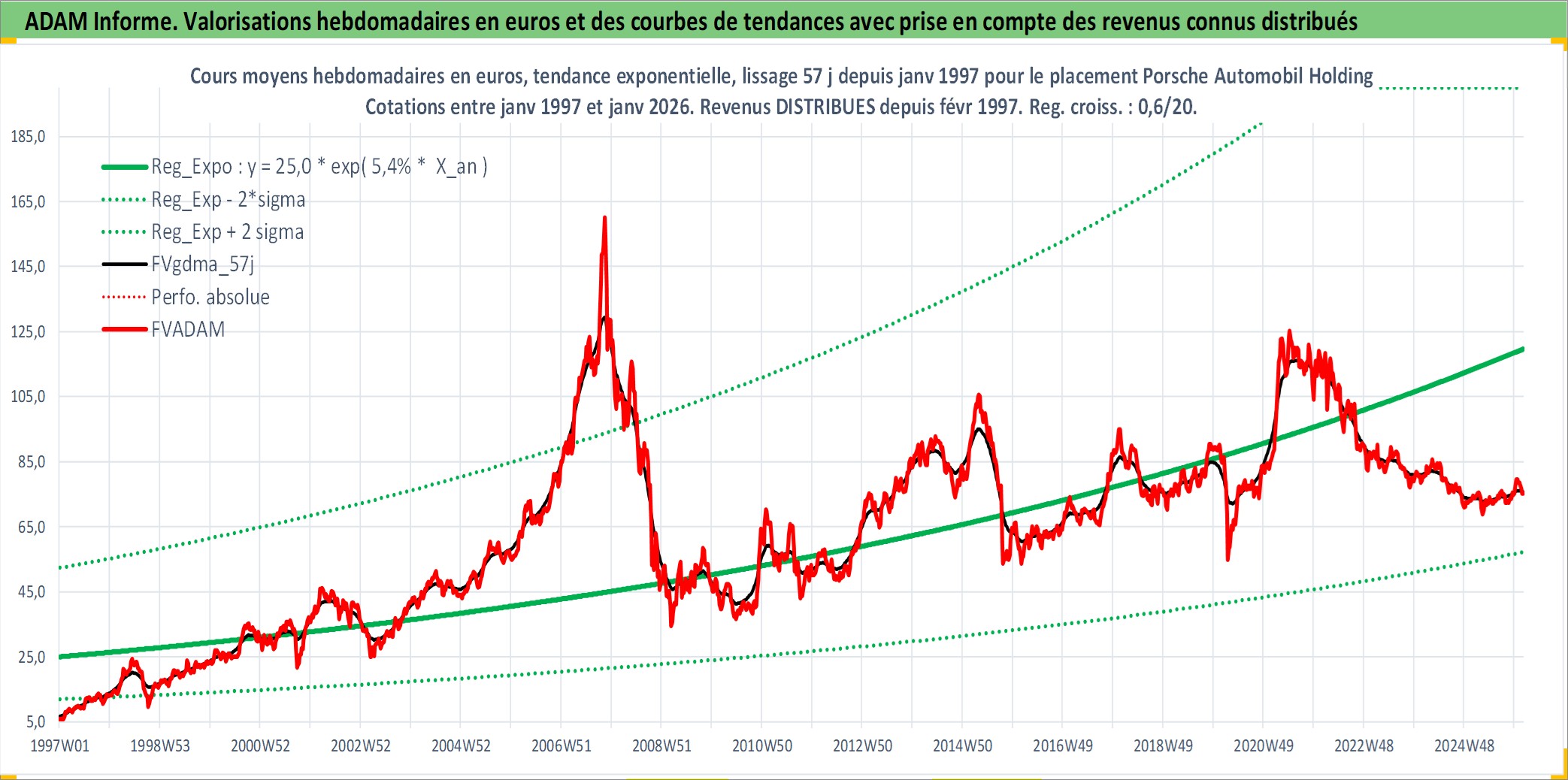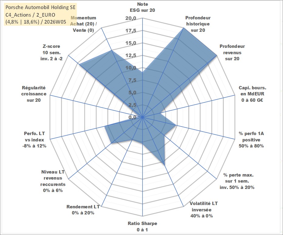 Site dédié aux investisseursPage dédiée sur site financeAnalyse des valorisations hebdomadaires de l'action Porsche Automobil Holding SE. Cet actif est cote en EUR. Les valorisations couvrent les semaines 1997W01 a 2026W05. Les revenus de cet actif financier sont pris en compte depuis la semaine 1997W06. La note globale ESG de cet actif est estimee a 9.0 (apres rebasage entre 0 et 20).