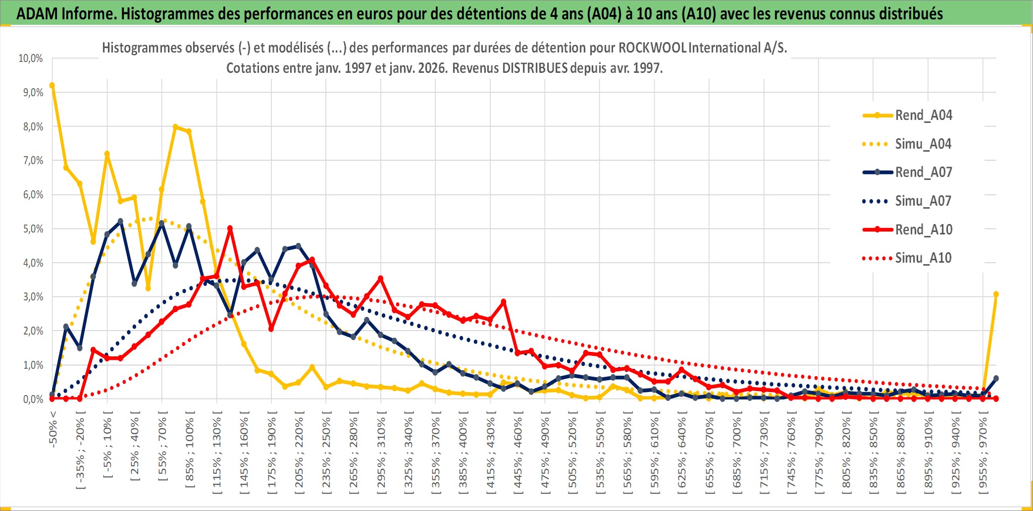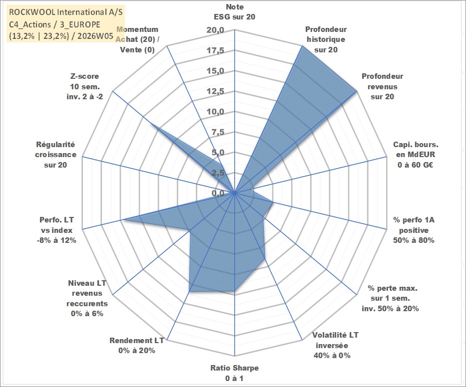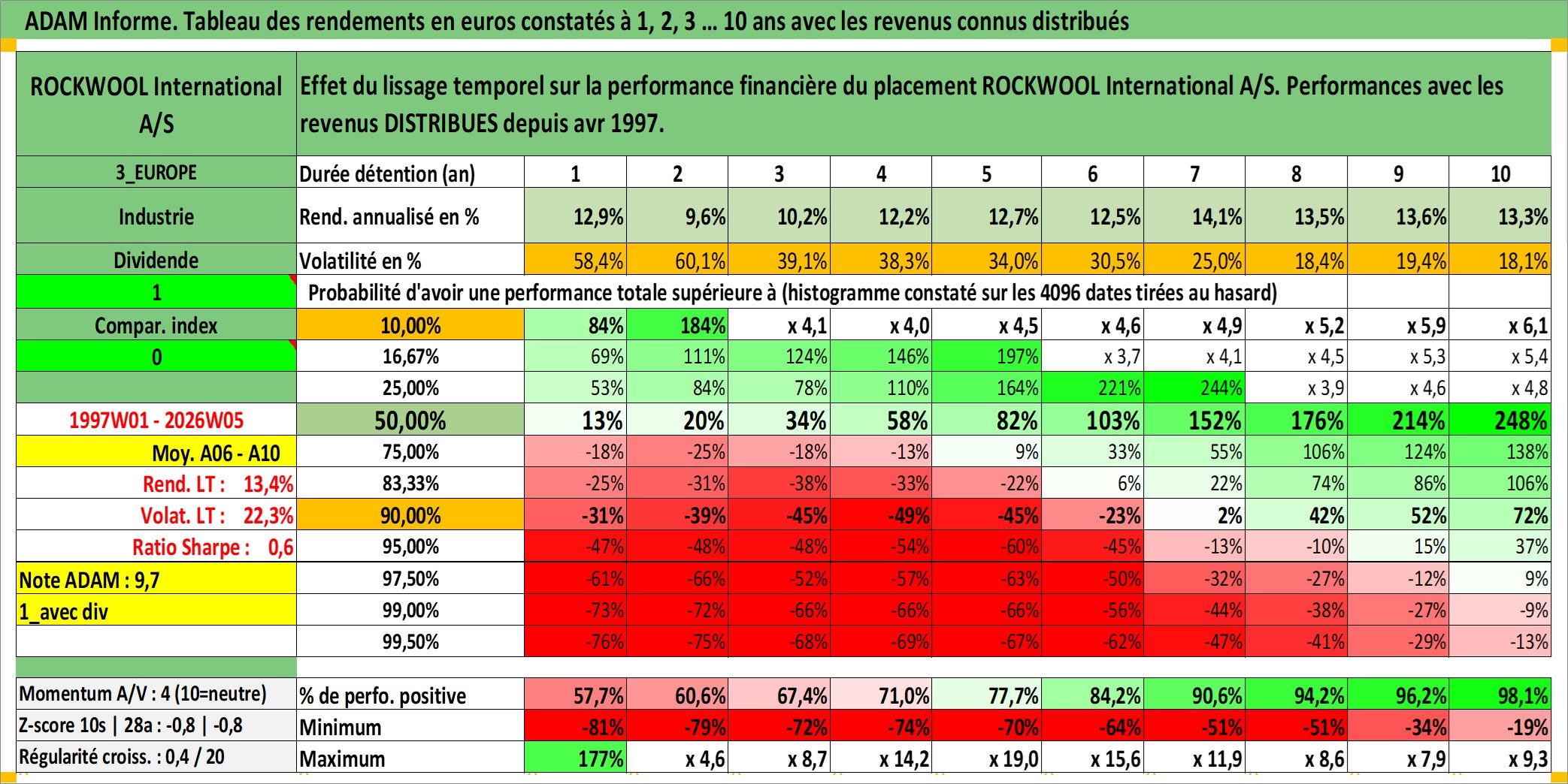 Site dédié aux investisseursPage dédiée sur site financeAnalyse des valorisations hebdomadaires de l'action ROCKWOOL International A/S. Cet actif est cote en DKK. Les valorisations sont en contrevaleur EURO et couvrent les semaines 1997W01 a 2026W05. Les revenus de cet actif financier sont pris en compte depuis la semaine 1997W18. La note ESG de cet actif n'est pas connue.