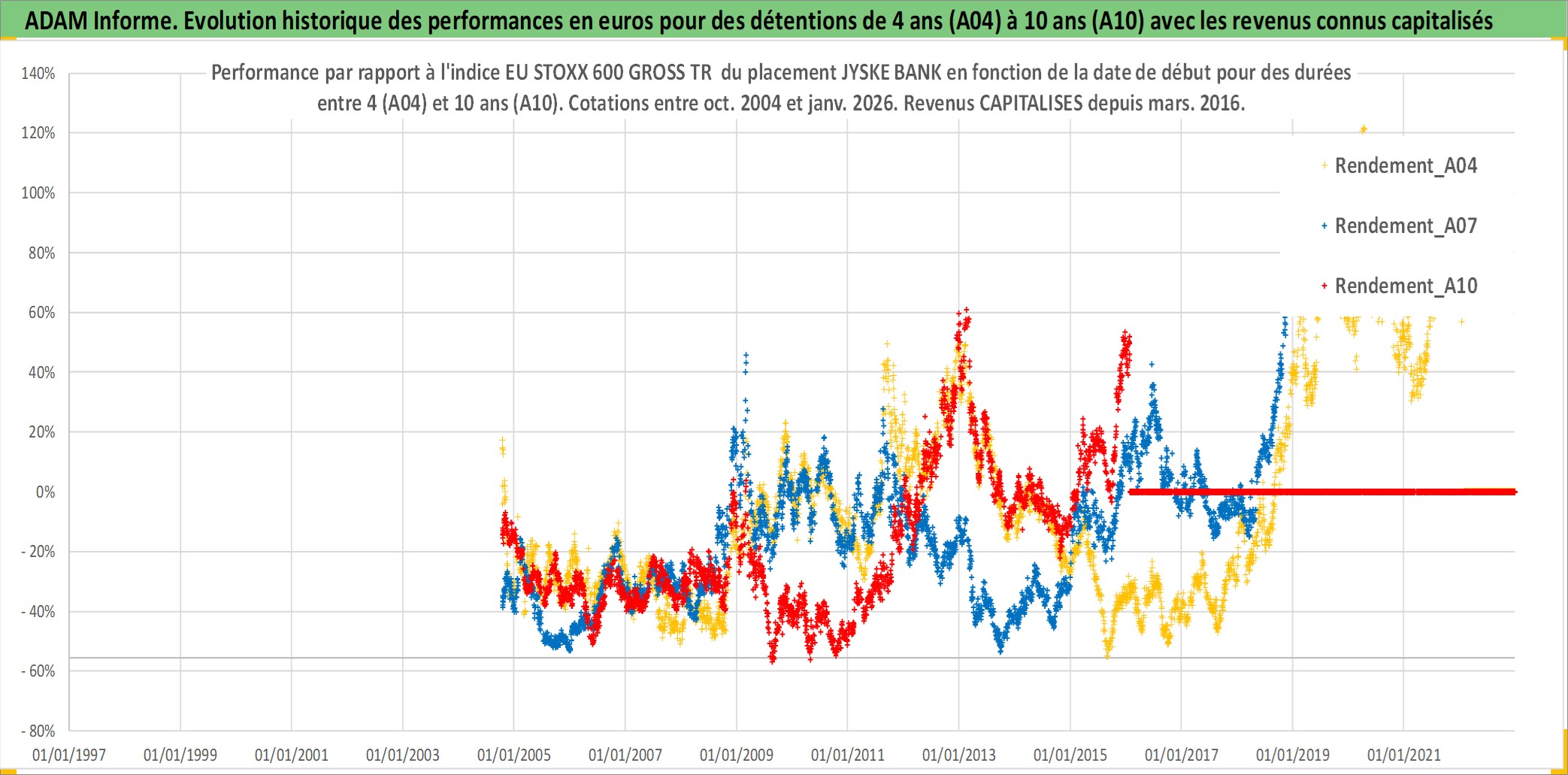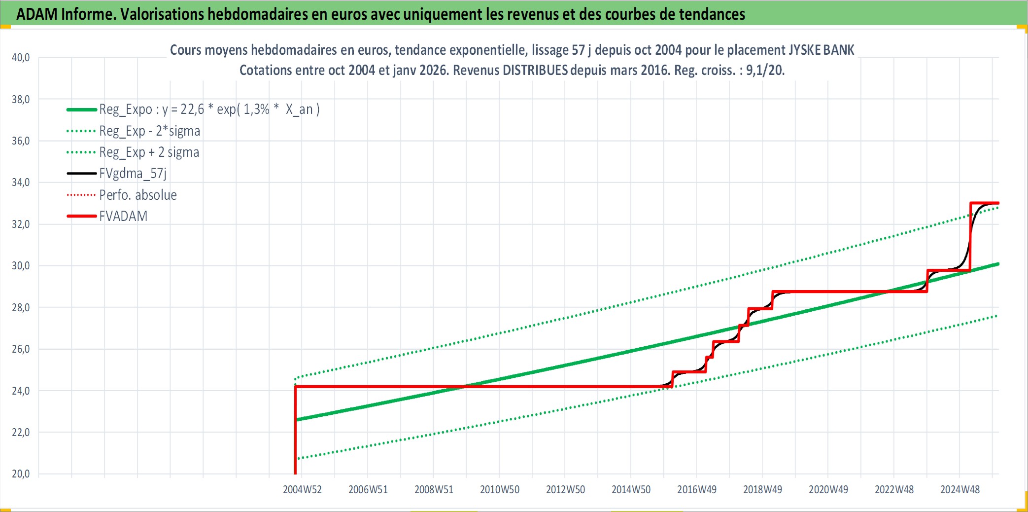Site dédié aux investisseursPage dédiée sur site financeAnalyse des valorisations hebdomadaires de l'action JYSKE BANK. Cet actif est cote en DKK. Les valorisations sont en contrevaleur EURO et couvrent les semaines 2004W41 a 2026W05. Les revenus de cet actif financier sont pris en compte depuis la semaine 2016W11. La note ESG de cet actif n'est pas connue.