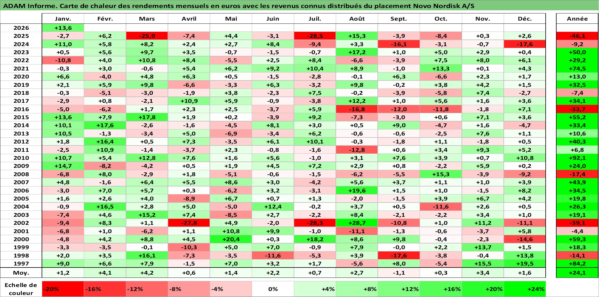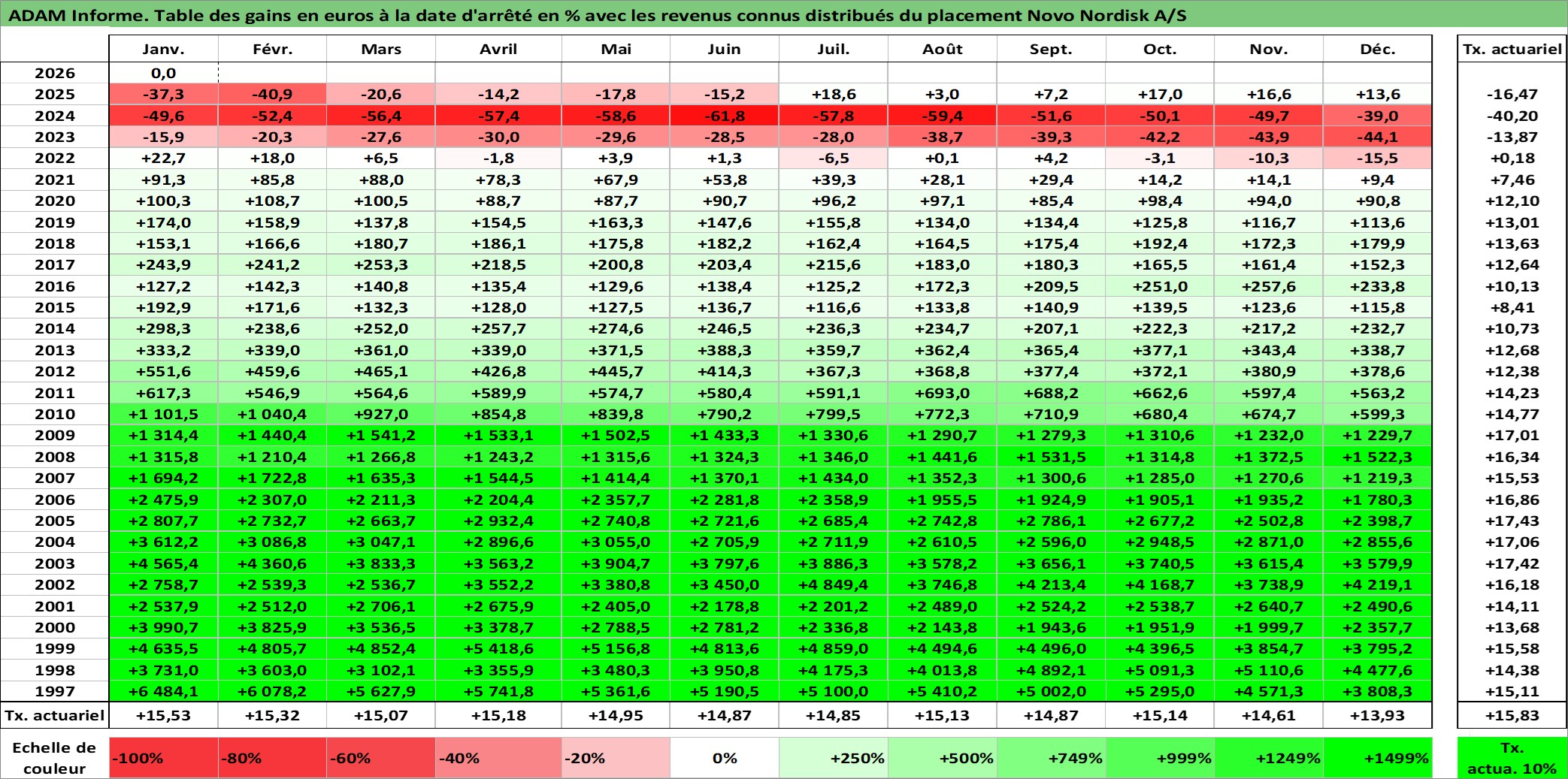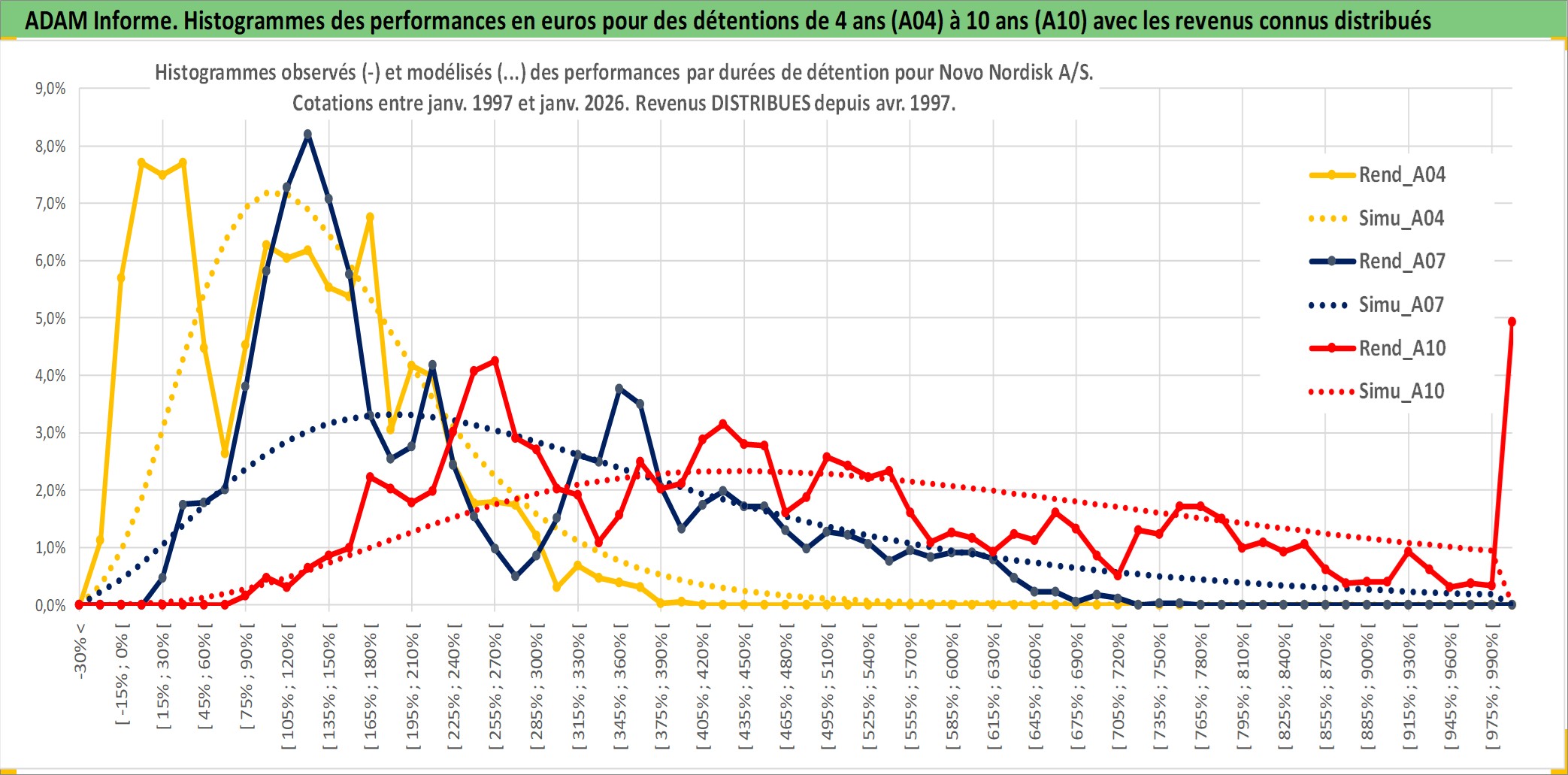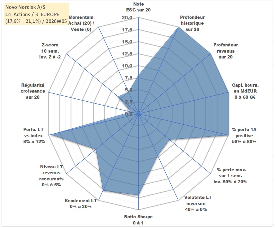 Site dédié aux investisseursPage dédiée sur site financeAnalyse des valorisations hebdomadaires de l'action Novo Nordisk A/S. Cet actif est cote en DKK. Les valorisations sont en contrevaleur EURO et couvrent les semaines 1997W01 a 2026W05. Les revenus de cet actif financier sont pris en compte depuis la semaine 1997W17. La note globale ESG de cet actif est estimee a 8.0 (apres rebasage entre 0 et 20).