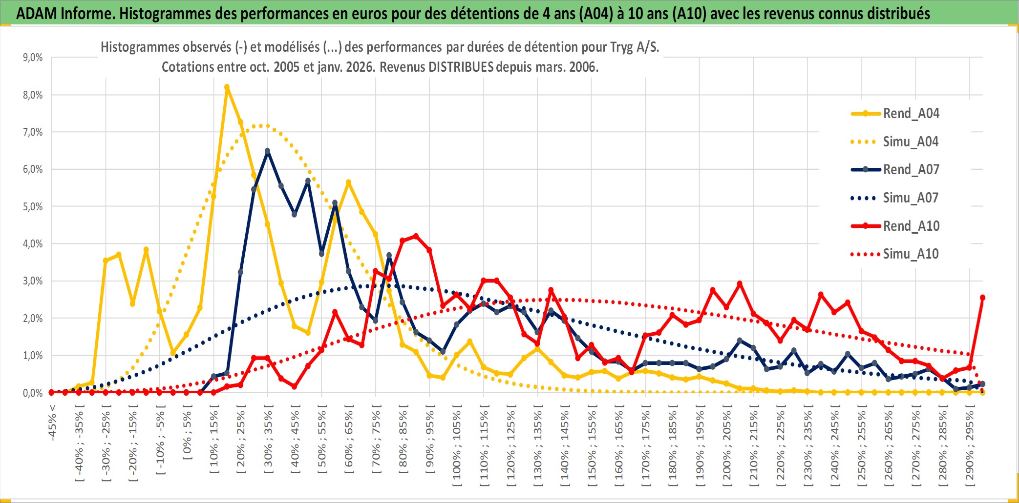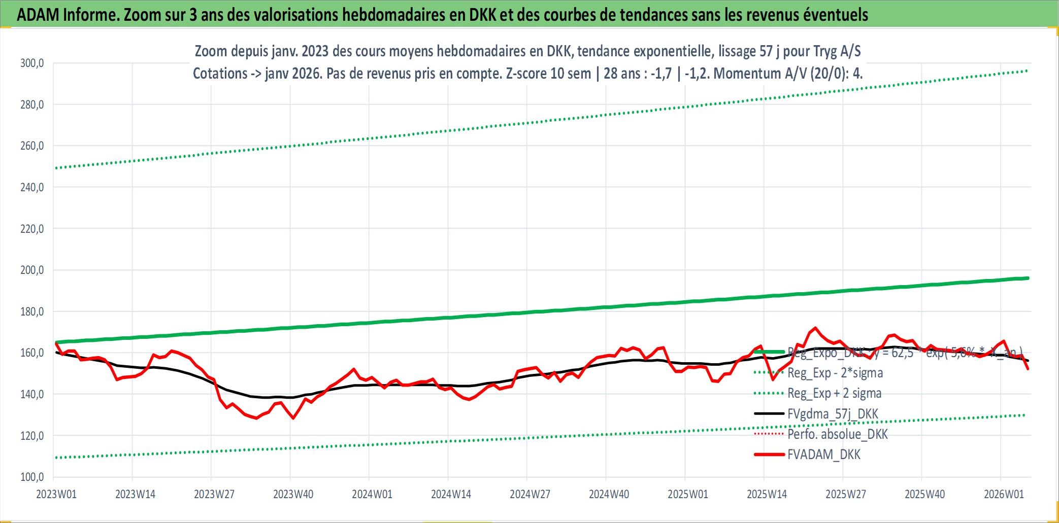 Site dédié aux investisseursPage dédiée sur site financeAnalyse des valorisations hebdomadaires de l'action Tryg A/S. Cet actif est cote en DKK. Les valorisations sont en contrevaleur EURO et couvrent les semaines 2005W41 a 2026W05. Les revenus de cet actif financier sont pris en compte depuis la semaine 2006W13. La note globale ESG de cet actif est estimee a 10.0 (apres rebasage entre 0 et 20).