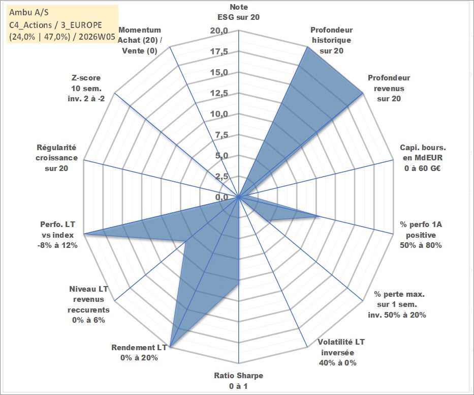 Site dédié aux investisseursPage dédiée sur site financeAnalyse des valorisations hebdomadaires de l'action Ambu A/S. Cet actif est cote en DKK. Les valorisations sont en contrevaleur EURO et couvrent les semaines 1997W01 a 2026W05. Les revenus de cet actif financier sont pris en compte depuis la semaine 1997W06. La note ESG de cet actif n'est pas connue.
