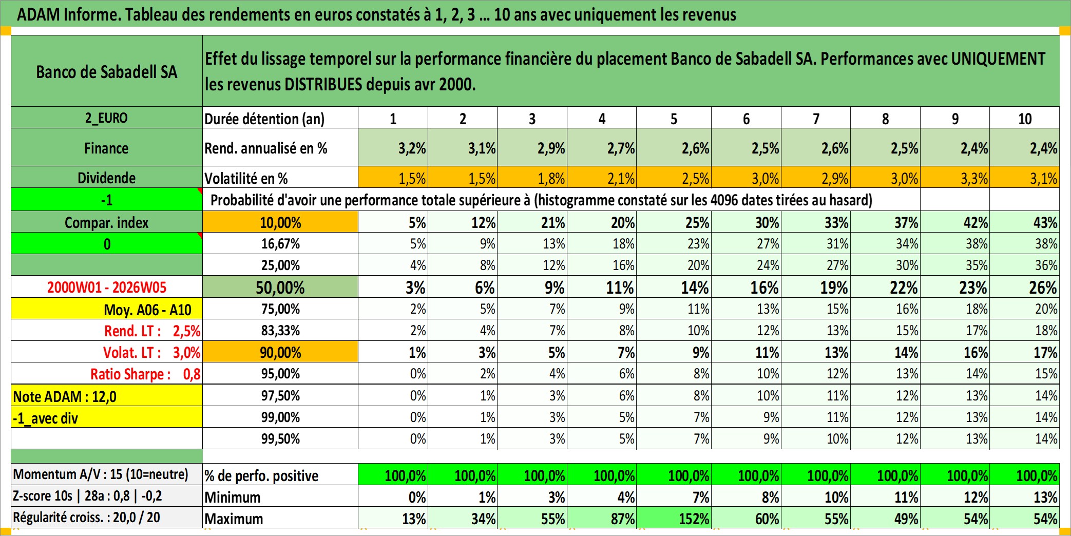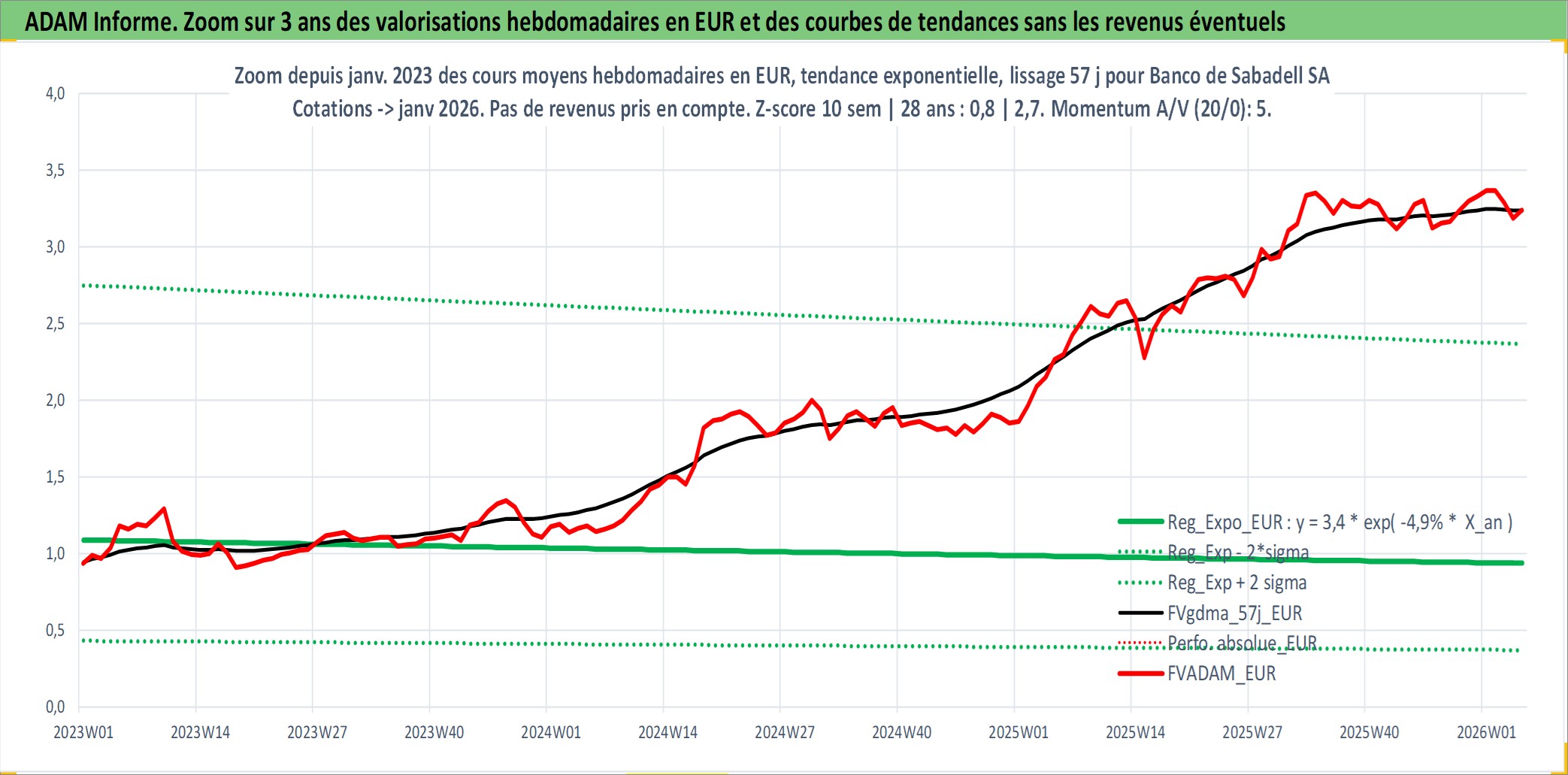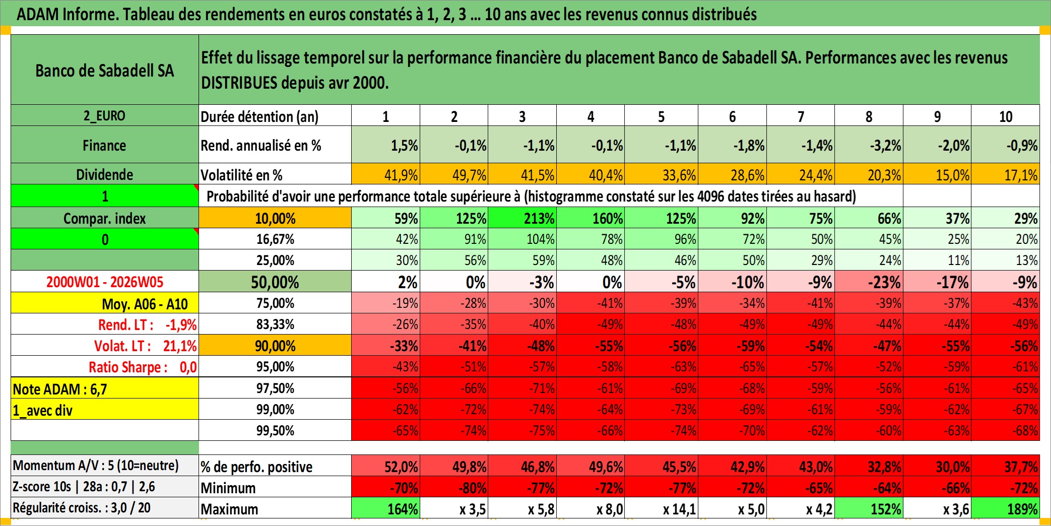 Site dédié aux investisseursPage dédiée sur site financeAnalyse des valorisations hebdomadaires de l'action Banco de Sabadell SA. Cet actif est cote en EUR. Les valorisations couvrent les semaines 2000W01 a 2026W05. Les revenus de cet actif financier sont pris en compte depuis la semaine 2000W16. La note globale ESG de cet actif est estimee a 11.0 (apres rebasage entre 0 et 20).