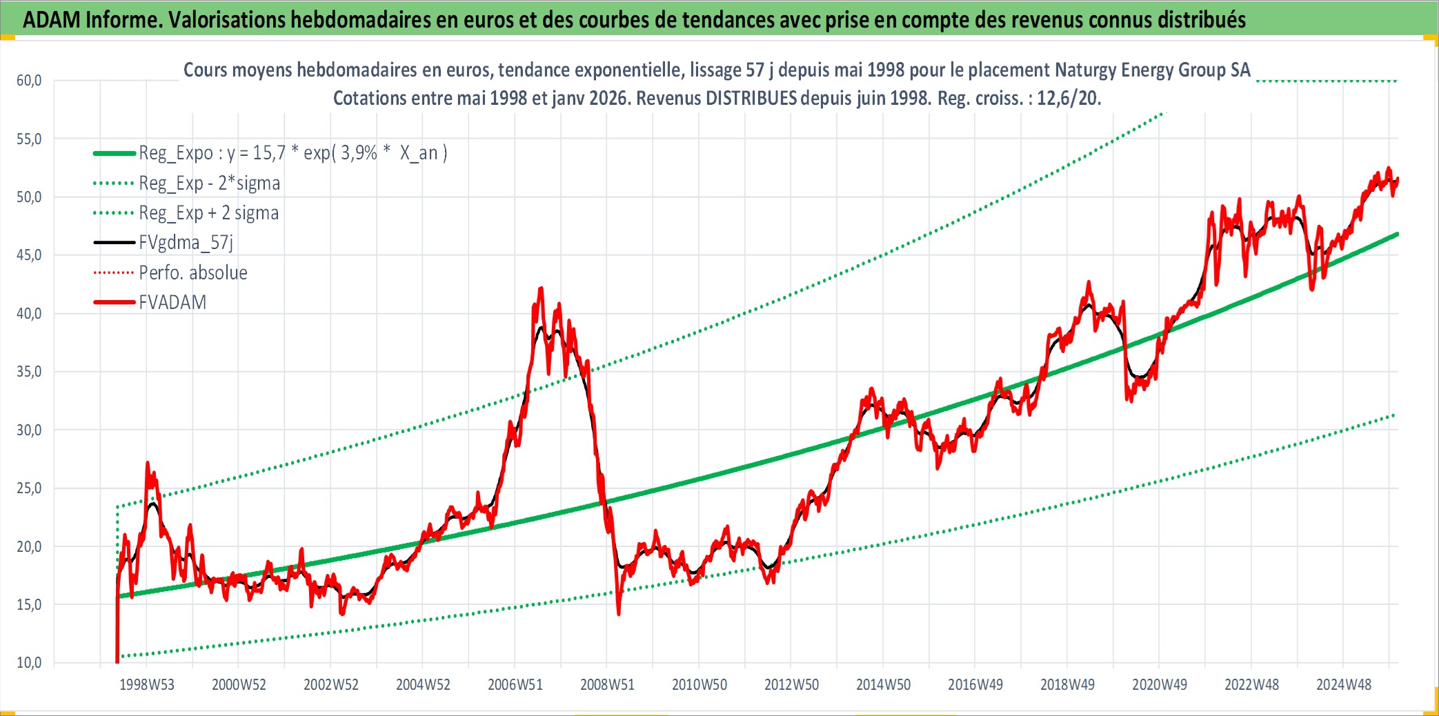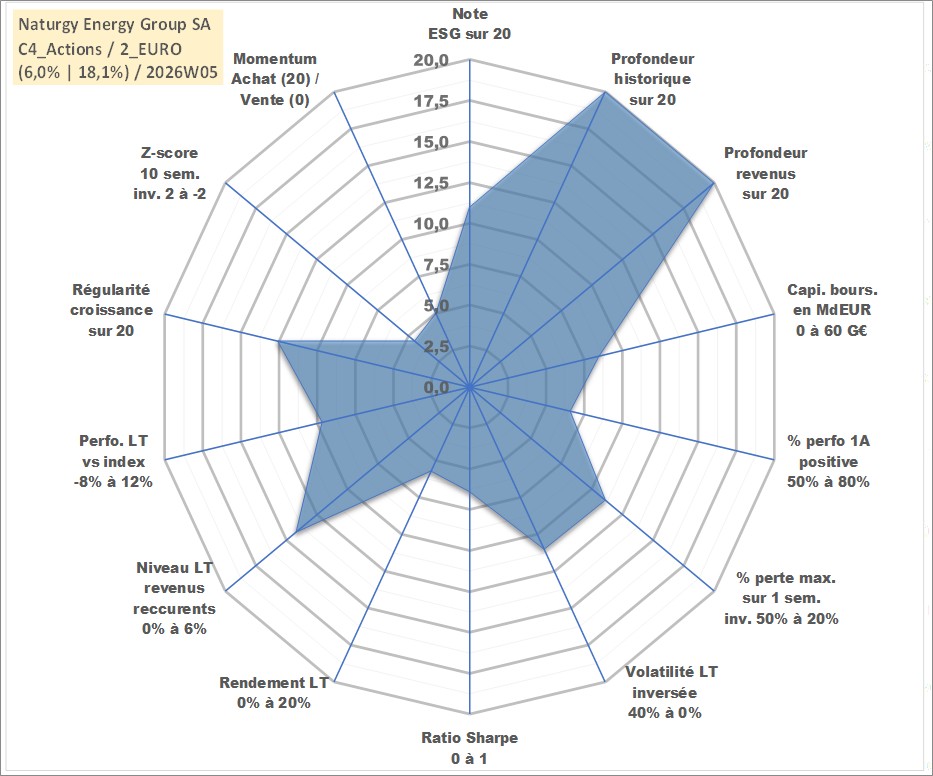 Site dédié aux investisseursPage dédiée sur site financeAnalyse des valorisations hebdomadaires de l'action Naturgy Energy Group SA. Cet actif est cote en EUR. Les valorisations couvrent les semaines 1998W20 a 2026W05. Les revenus de cet actif financier sont pris en compte depuis la semaine 1998W27. La note globale ESG de cet actif est estimee a 11.0 (apres rebasage entre 0 et 20).
