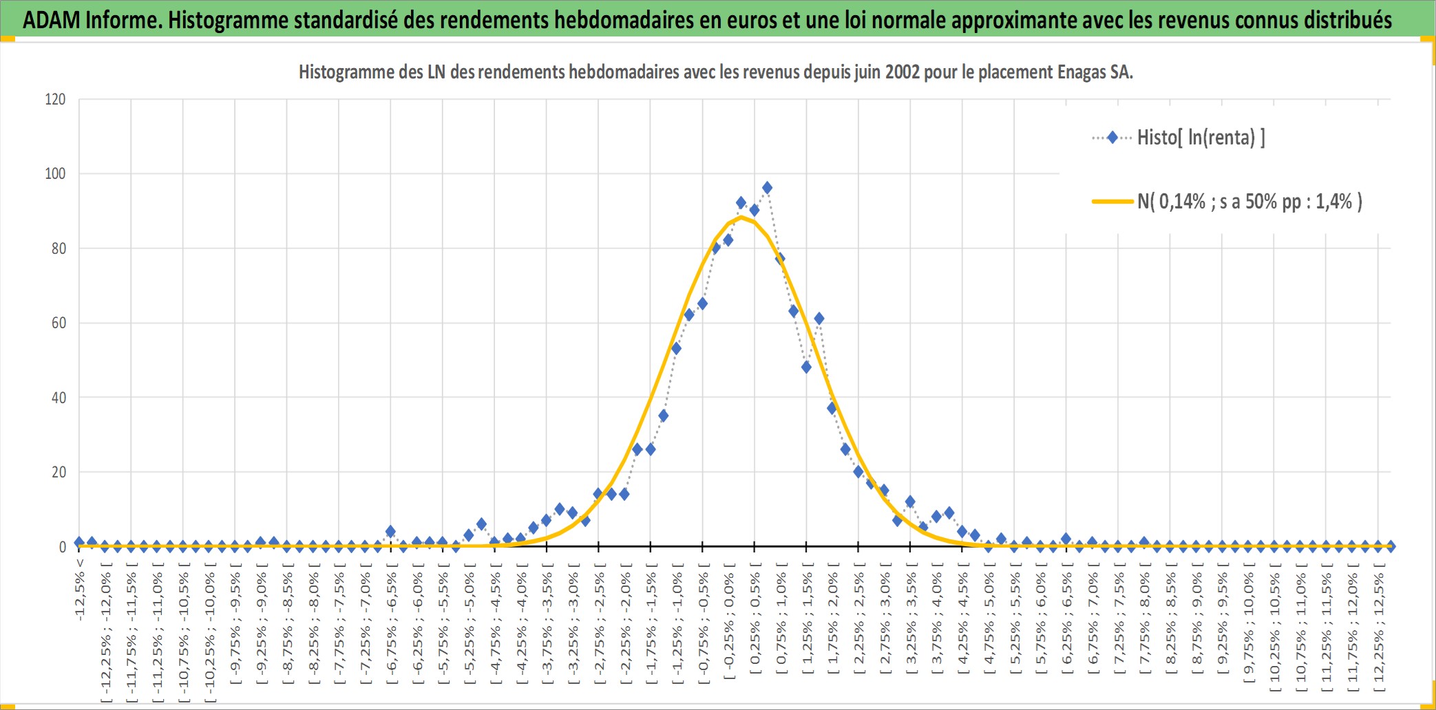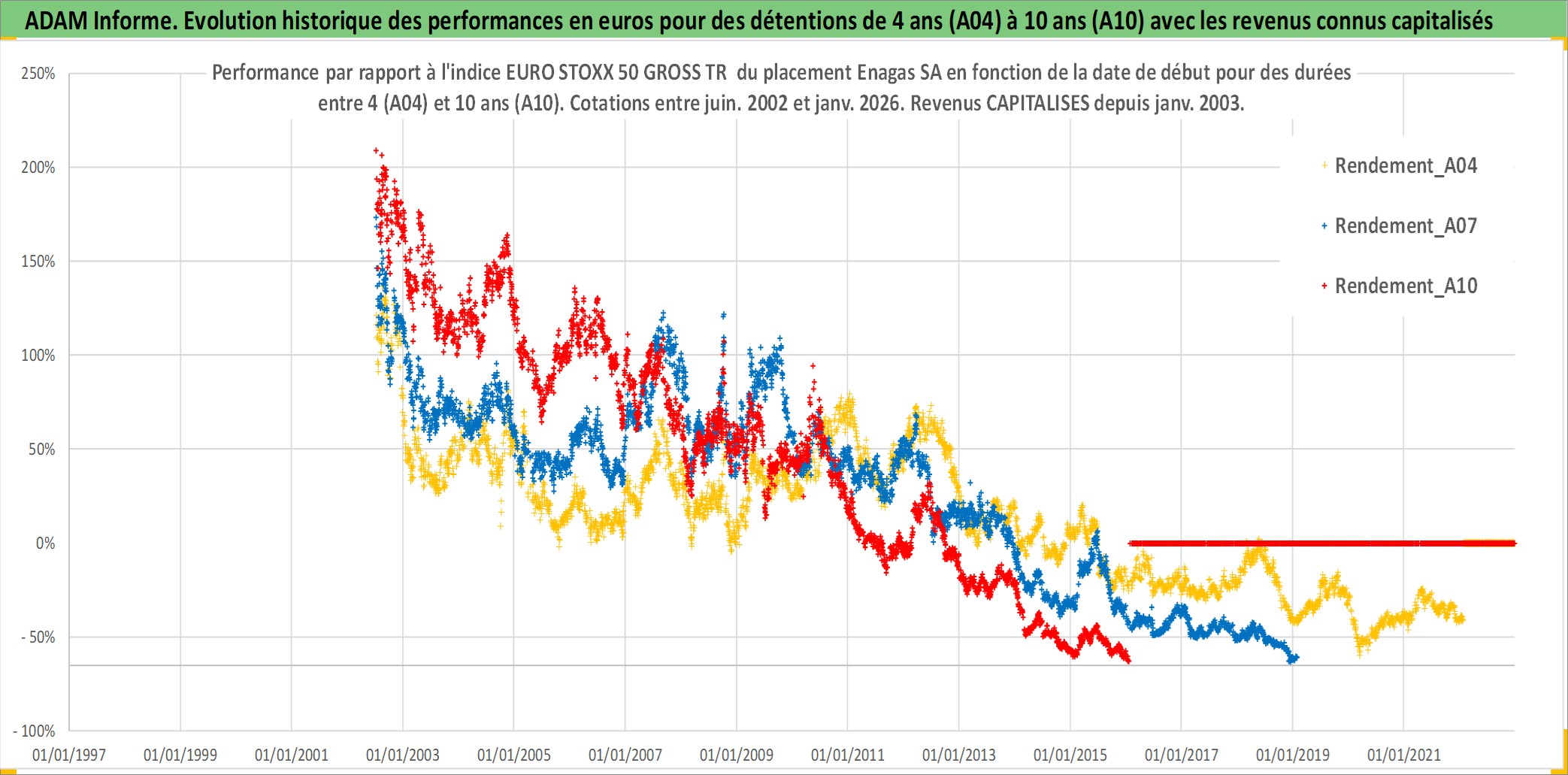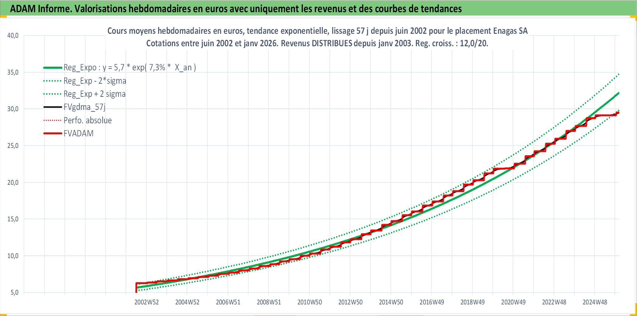 Site dédié aux investisseursPage dédiée sur site financeAnalyse des valorisations hebdomadaires de l'action Enagas SA. Cet actif est cote en EUR. Les valorisations couvrent les semaines 2002W26 a 2026W05. Les revenus de cet actif financier sont pris en compte depuis la semaine 2003W03. La note globale ESG de cet actif est estimee a 13.0 (apres rebasage entre 0 et 20).
