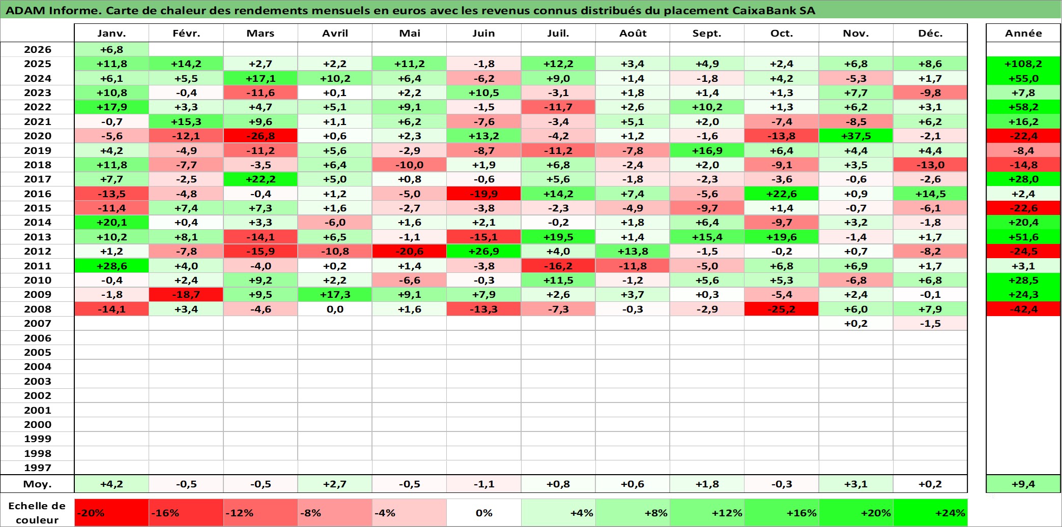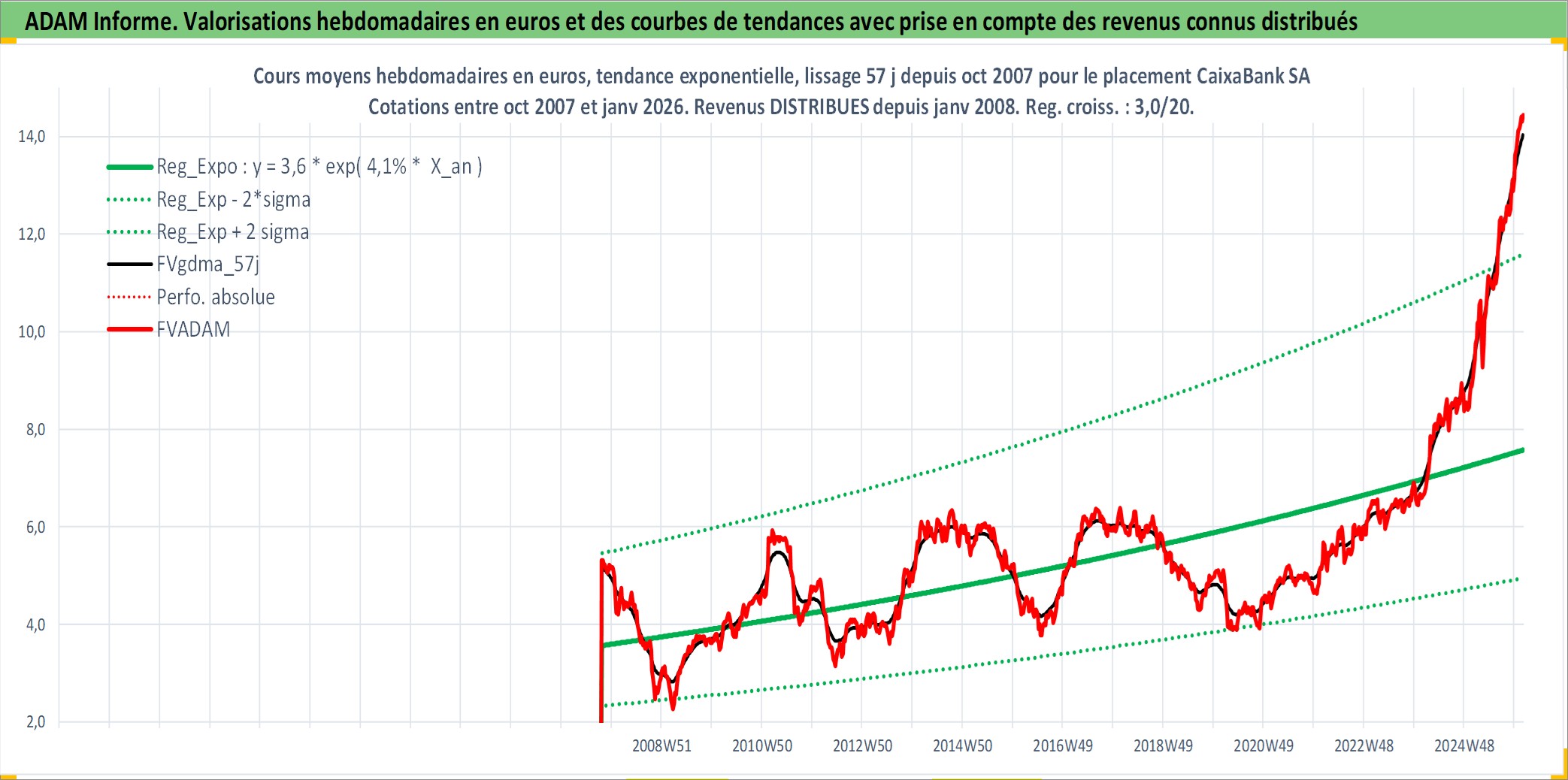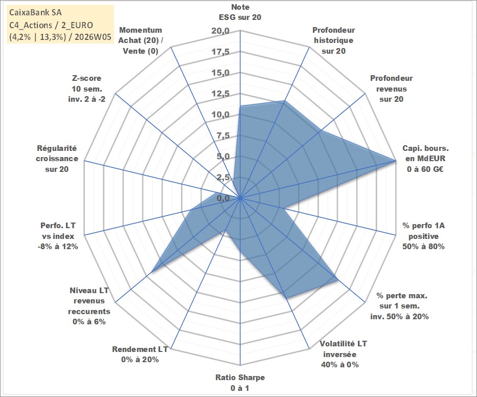 Site dédié aux investisseursPage dédiée sur site financeAnalyse des valorisations hebdomadaires de l'action CaixaBank SA. Cet actif est cote en EUR. Les valorisations couvrent les semaines 2007W41 a 2026W05. Les revenus de cet actif financier sont pris en compte depuis la semaine 2008W03. La note globale ESG de cet actif est estimee a 11.0 (apres rebasage entre 0 et 20).