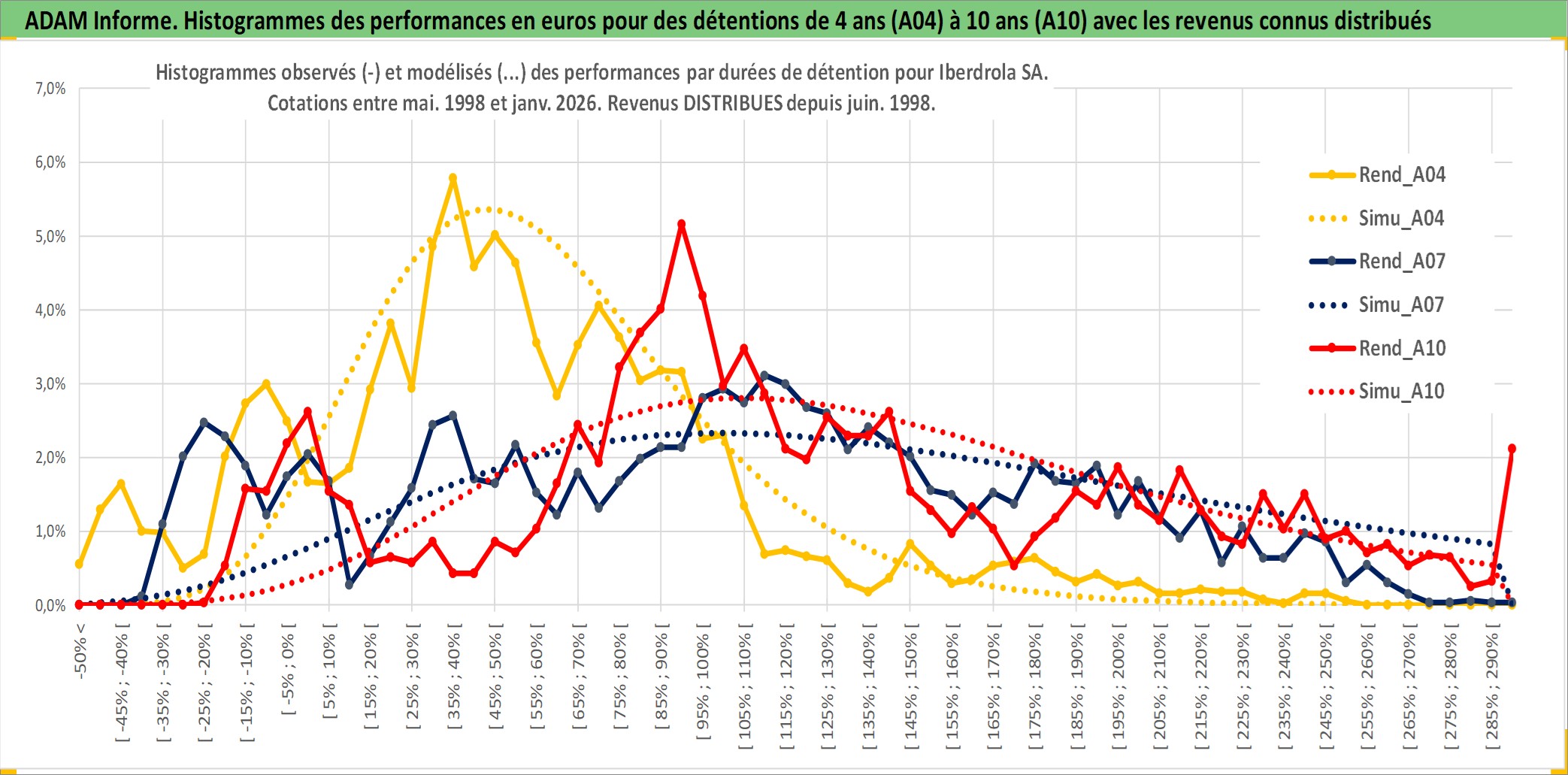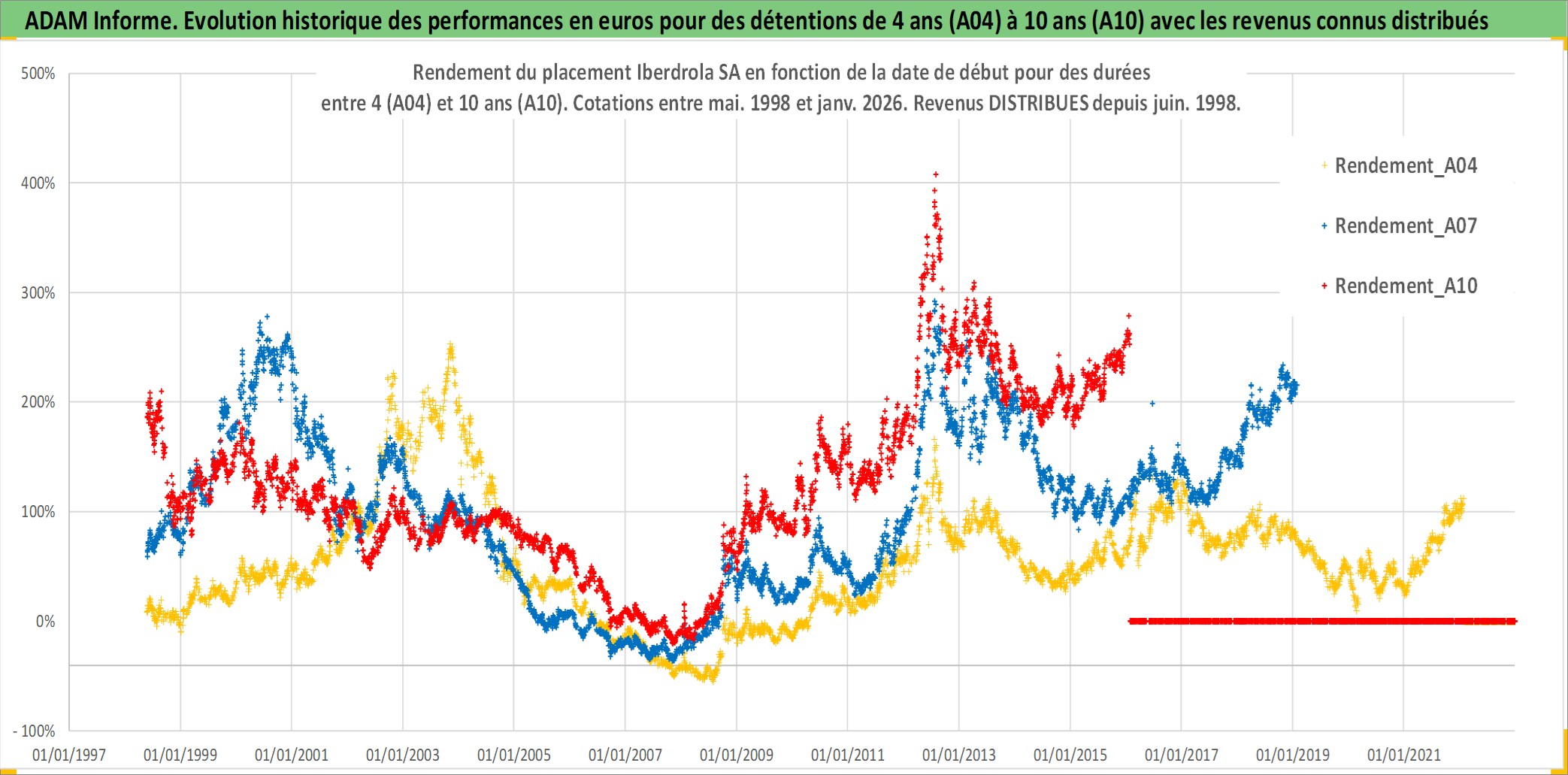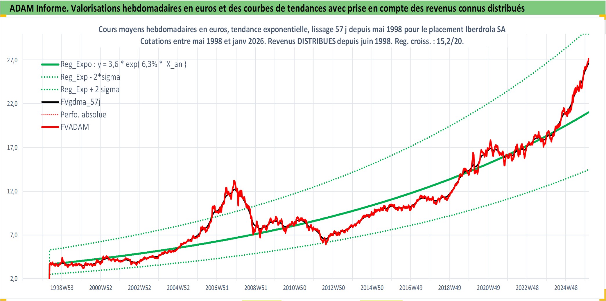 Site dédié aux investisseursPage dédiée sur site financeAnalyse des valorisations hebdomadaires de l'action Iberdrola SA. Cet actif est cote en EUR. Les valorisations couvrent les semaines 1998W20 a 2026W05. Les revenus de cet actif financier sont pris en compte depuis la semaine 1998W27. La note globale ESG de cet actif est estimee a 10.0 (apres rebasage entre 0 et 20).