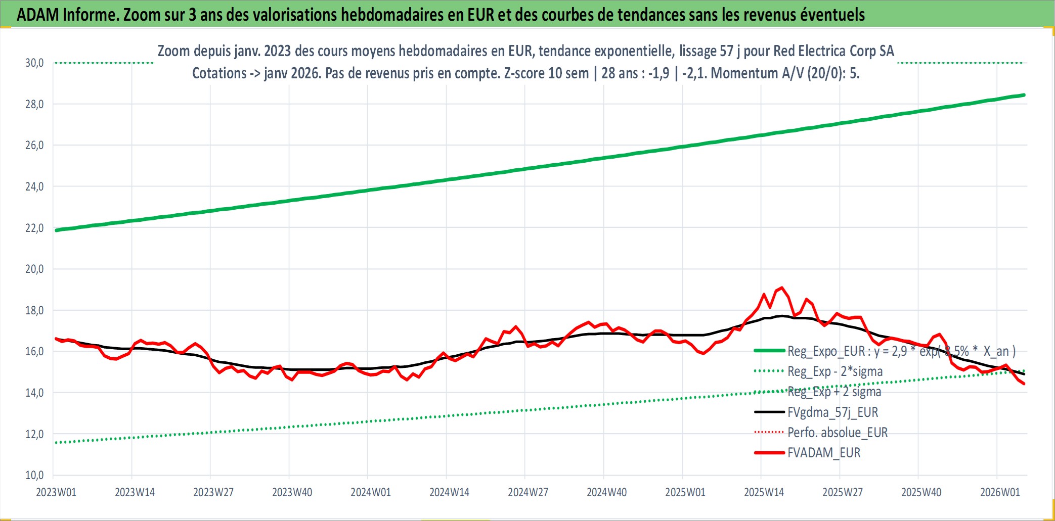 Site dédié aux investisseursPage dédiée sur site financeAnalyse des valorisations hebdomadaires de l'action Red Electrica Corp SA. Cet actif est cote en EUR. Les valorisations couvrent les semaines 1999W27 a 2026W05. Les revenus de cet actif financier sont pris en compte depuis la semaine 1999W47. La note globale ESG de cet actif est estimee a 16.0 (apres rebasage entre 0 et 20).