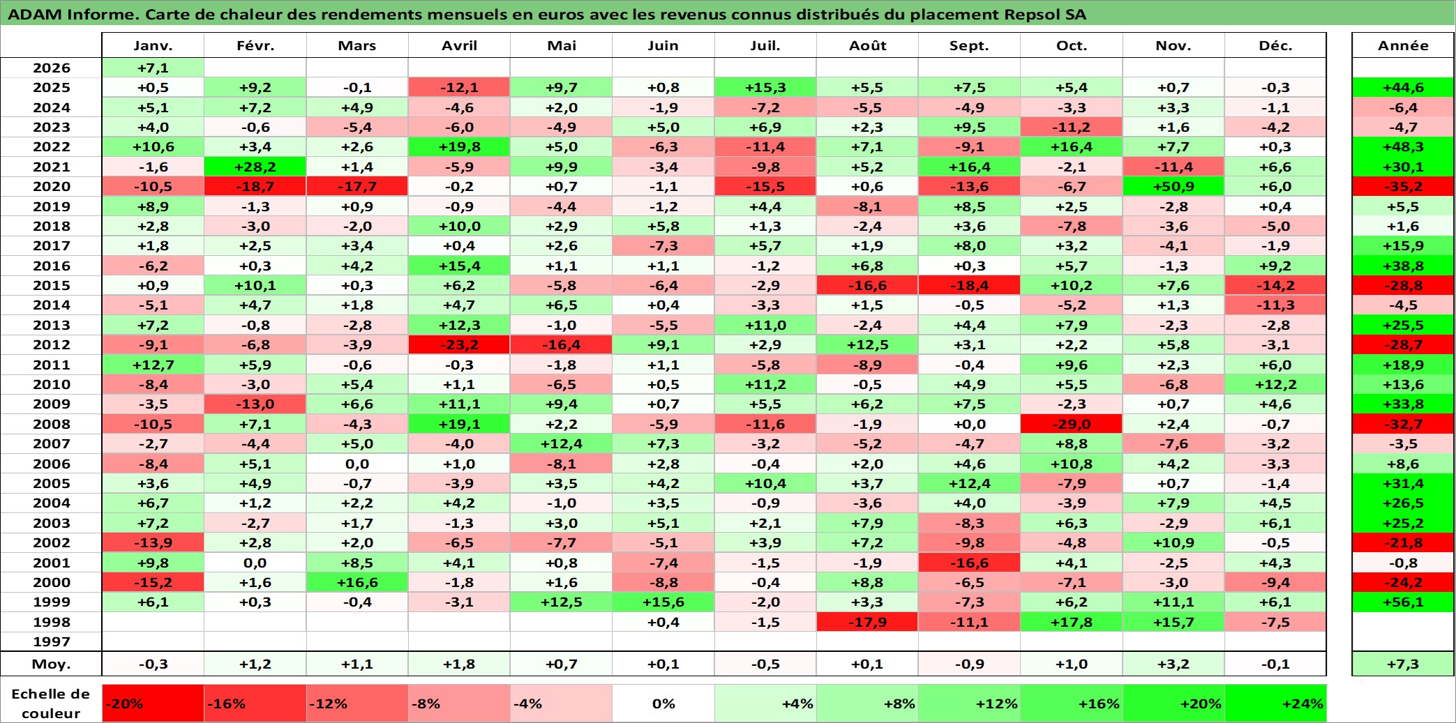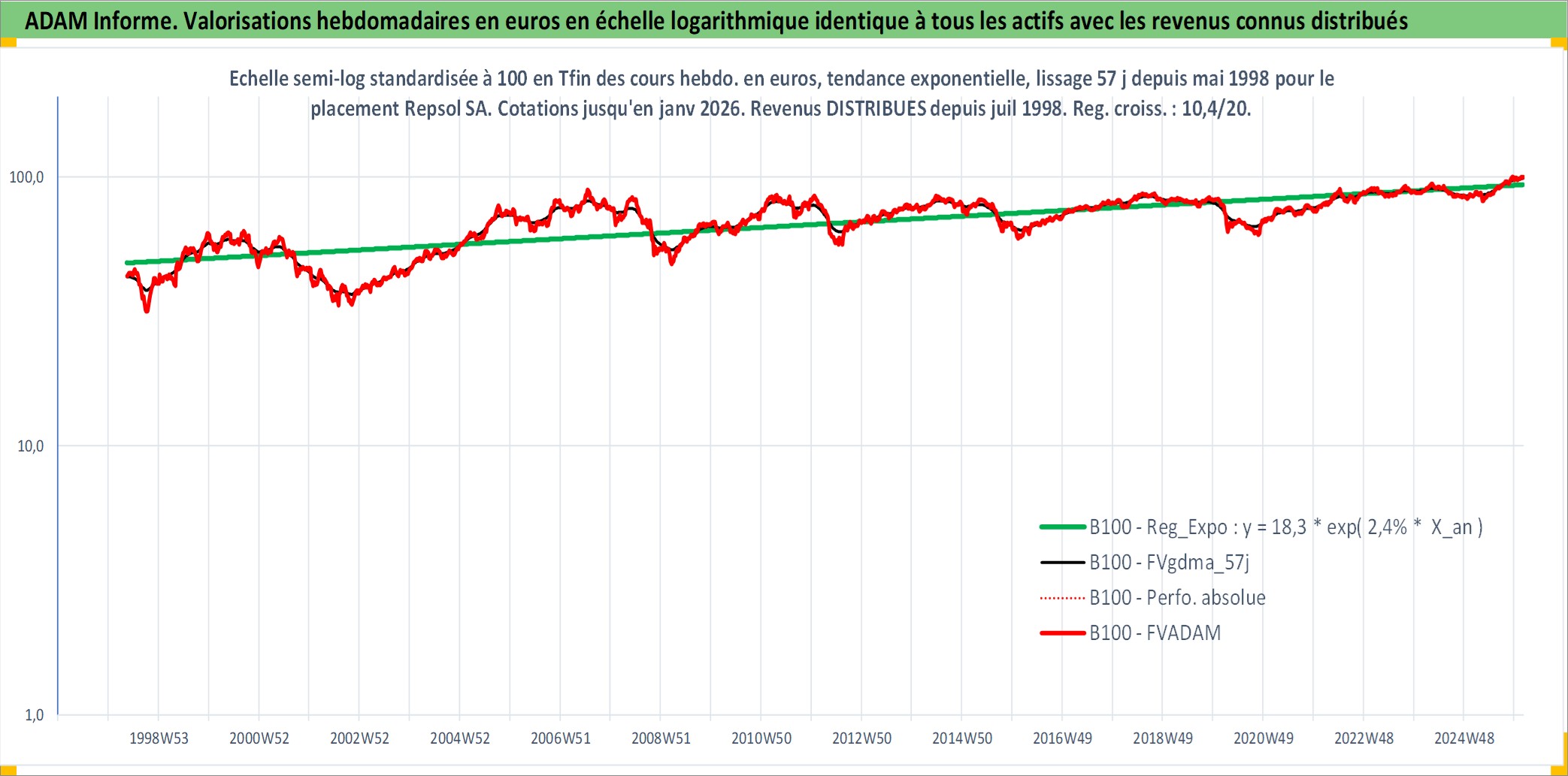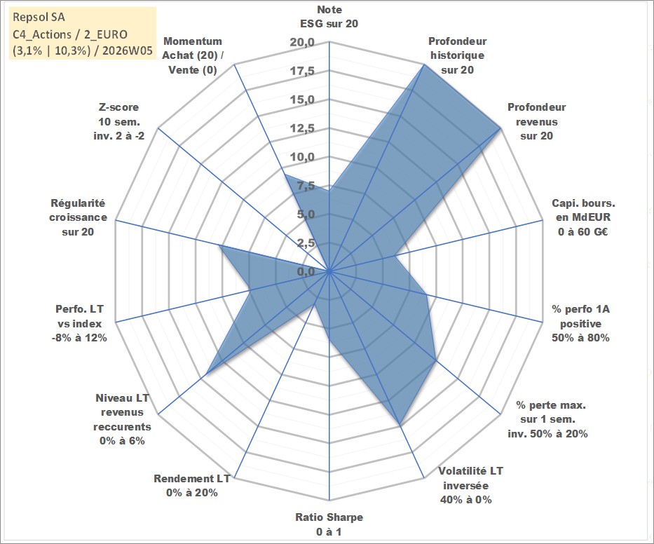 Site dédié aux investisseursPage dédiée sur site financeAnalyse des valorisations hebdomadaires de l'action Repsol SA. Cet actif est cote en EUR. Les valorisations couvrent les semaines 1998W20 a 2026W05. Les revenus de cet actif financier sont pris en compte depuis la semaine 1998W29. La note globale ESG de cet actif est estimee a 7.0 (apres rebasage entre 0 et 20).
