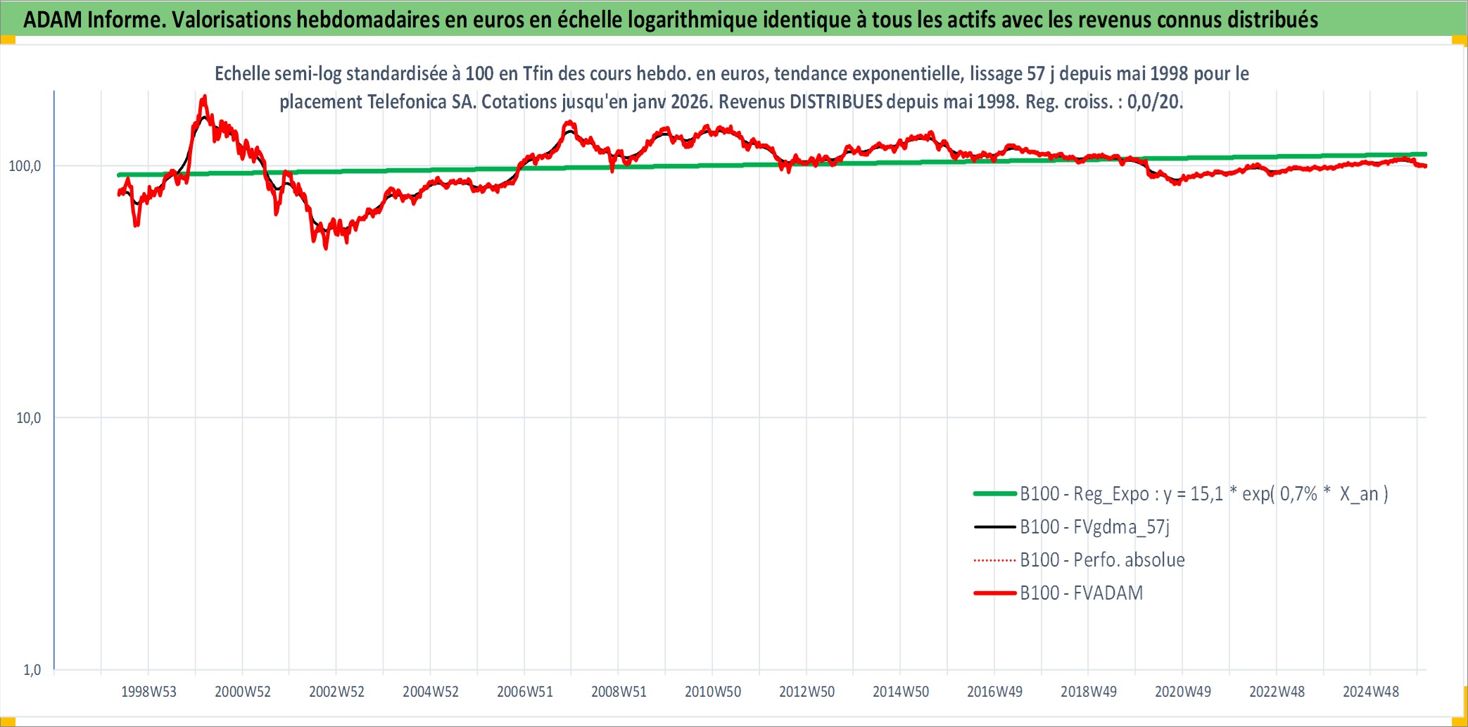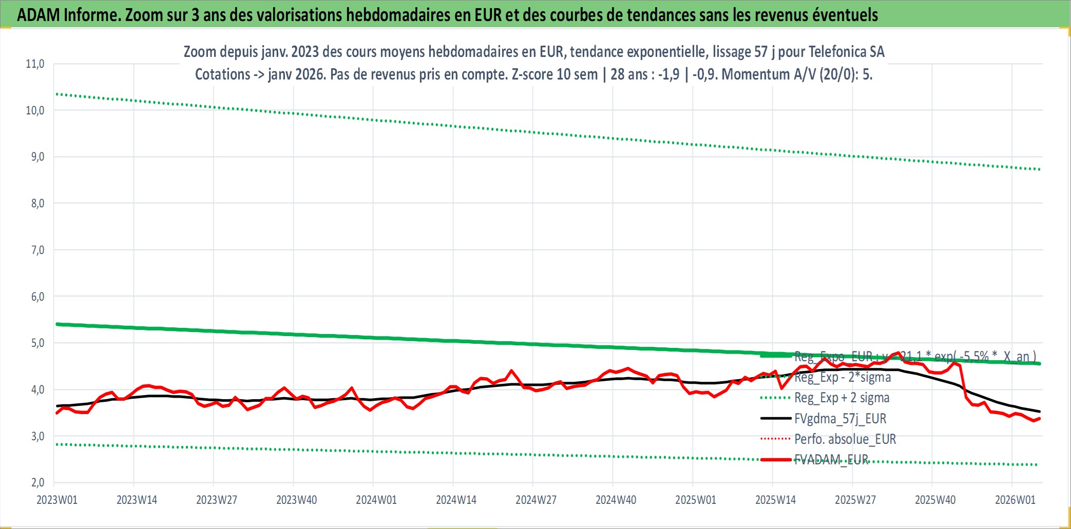Site dédié aux investisseursPage dédiée sur site financeAnalyse des valorisations hebdomadaires de l'action Telefonica SA. Cet actif est cote en EUR. Les valorisations couvrent les semaines 1998W20 a 2026W05. Les revenus de cet actif financier sont pris en compte depuis la semaine 1998W21. La note globale ESG de cet actif est estimee a 12.0 (apres rebasage entre 0 et 20).