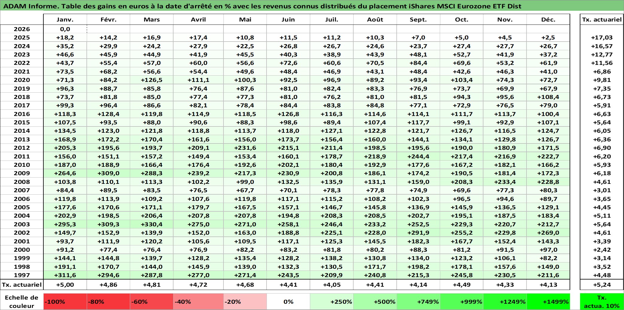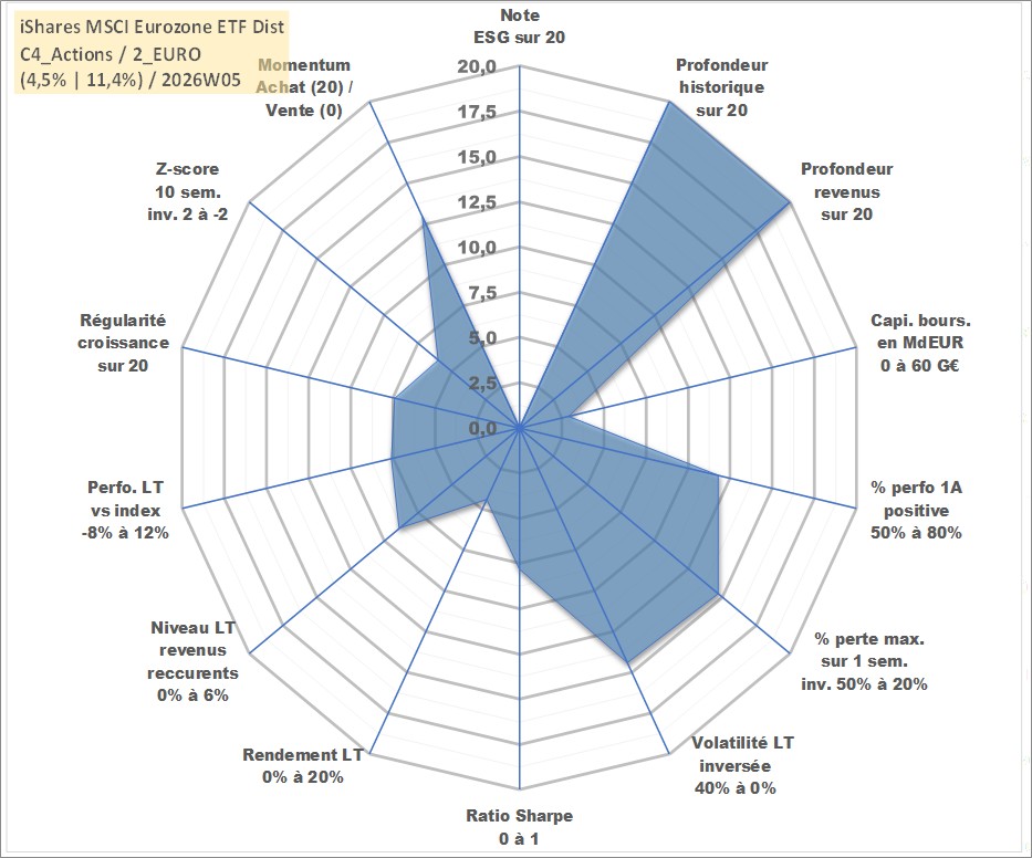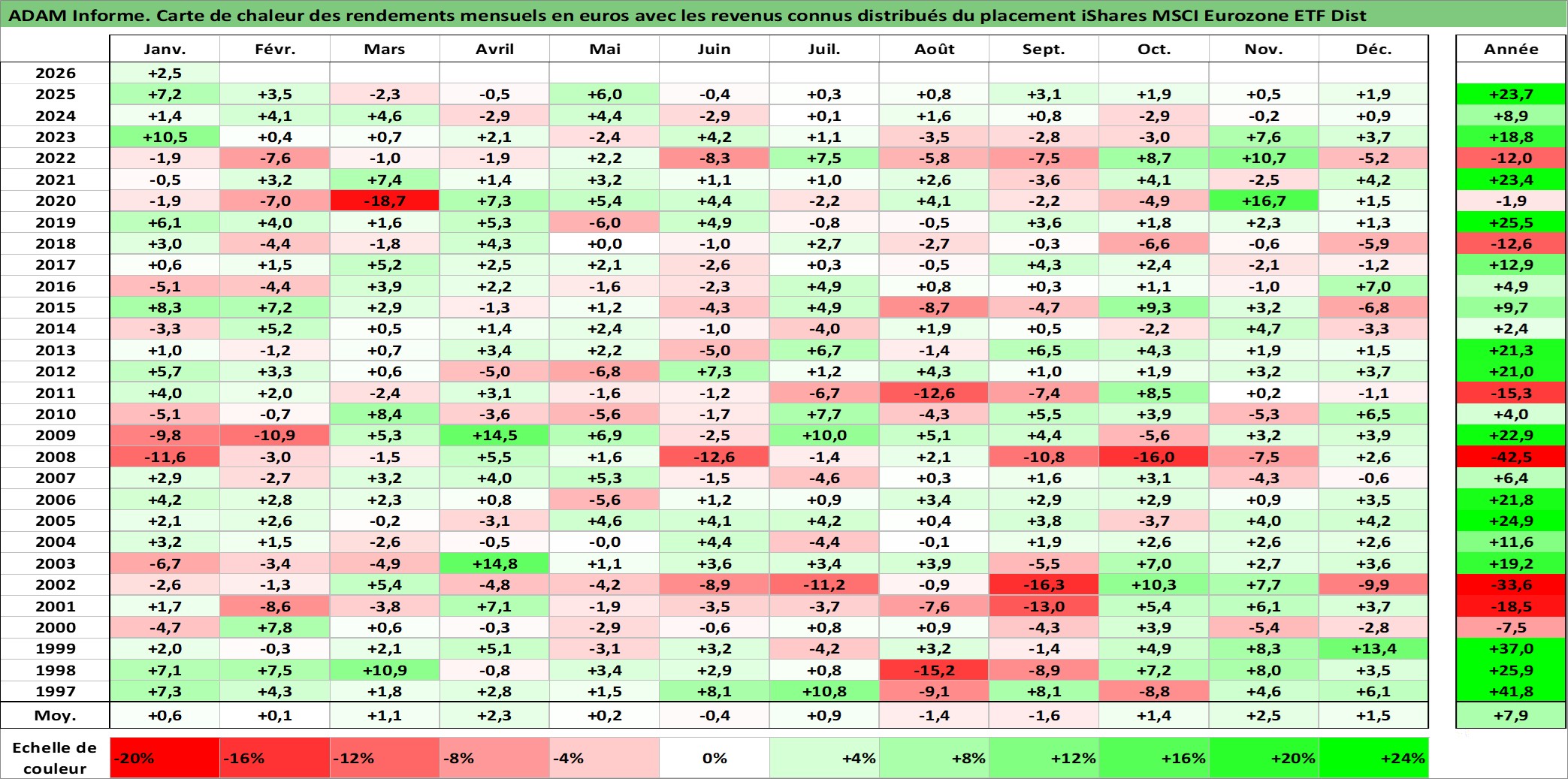 Site dédié aux investisseursPage dédiée sur site financeAnalyse des valorisations hebdomadaires du fonds iShares MSCI Eurozone ETF Dist. Cet actif est cote en USD. Les valorisations sont en contrevaleur EURO et couvrent les semaines 1997W01 a 2026W05. Les revenus de cet actif financier sont pris en compte depuis la semaine 1997W51. La note ESG de cet actif n'est pas connue.