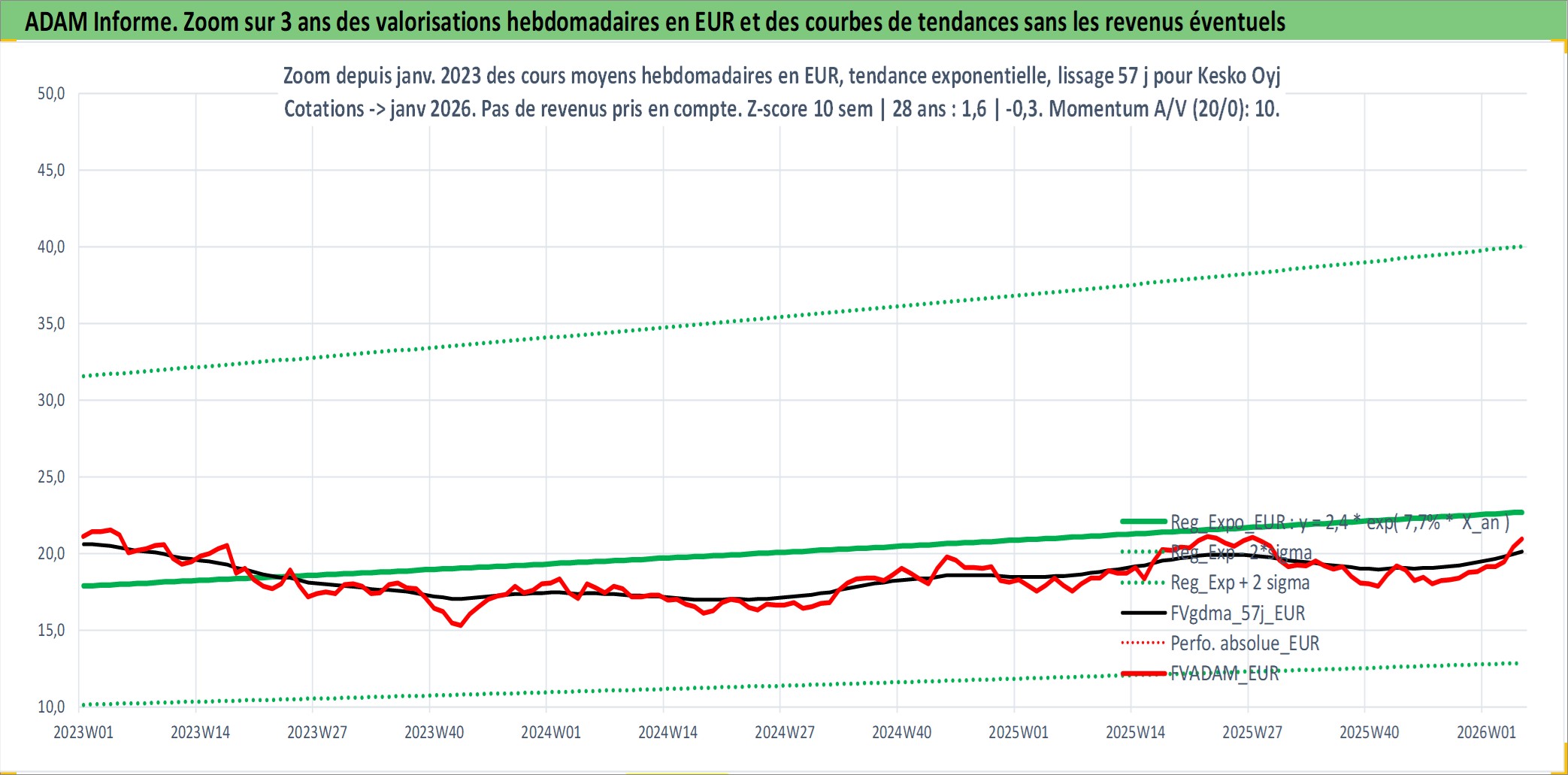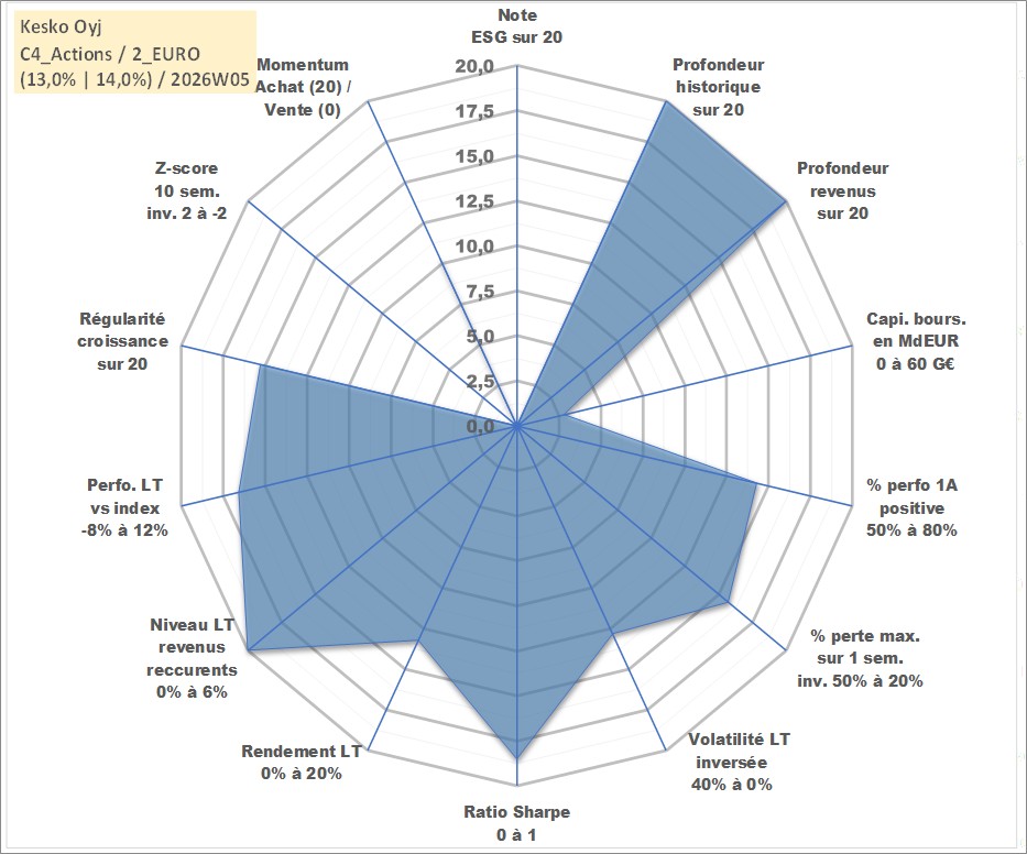 Site dédié aux investisseursPage dédiée sur site financeAnalyse des valorisations hebdomadaires de l'action Kesko Oyj. Cet actif est cote en EUR. Les valorisations couvrent les semaines 1997W01 a 2026W05. Les revenus de cet actif financier sont pris en compte depuis la semaine 1997W16. La note ESG de cet actif n'est pas connue.
