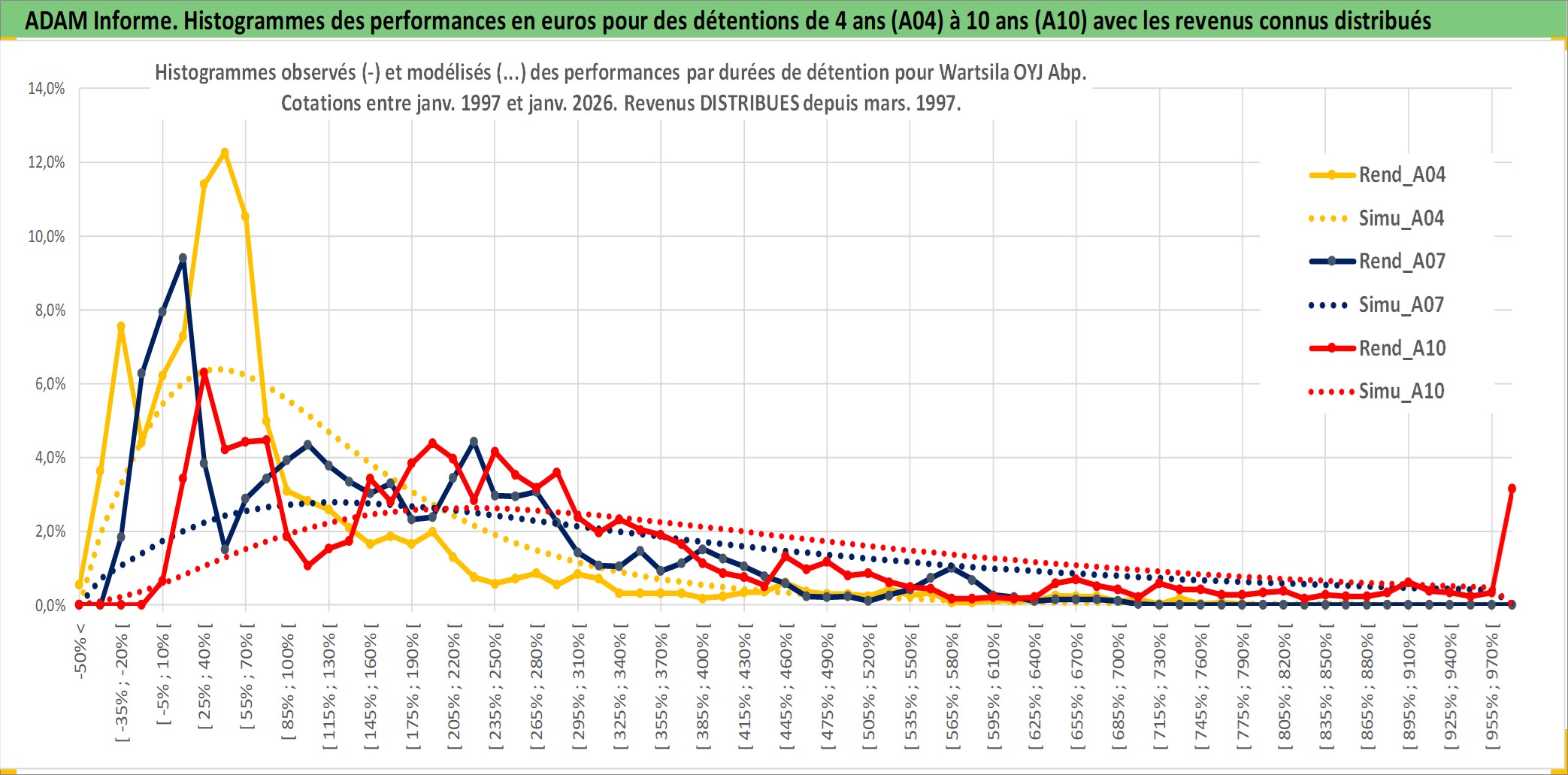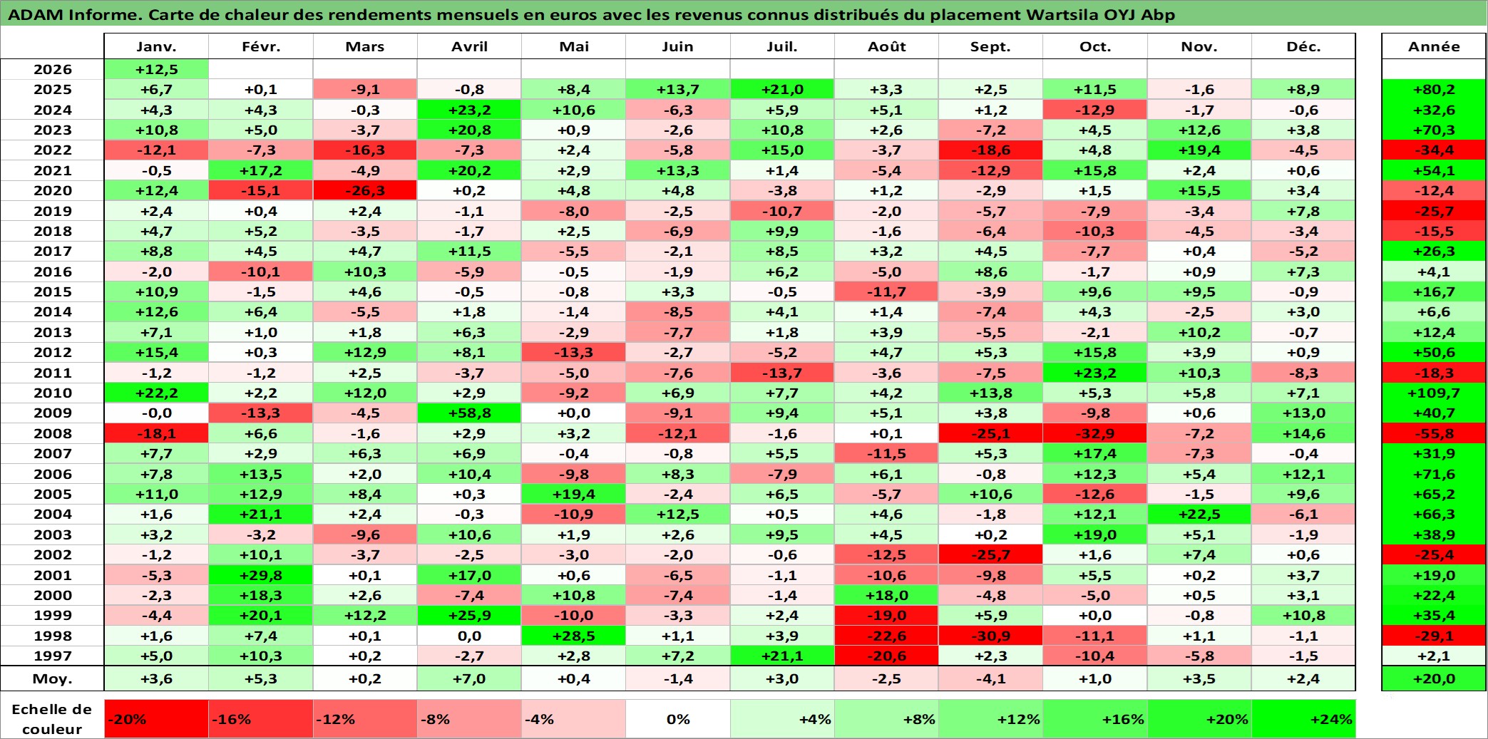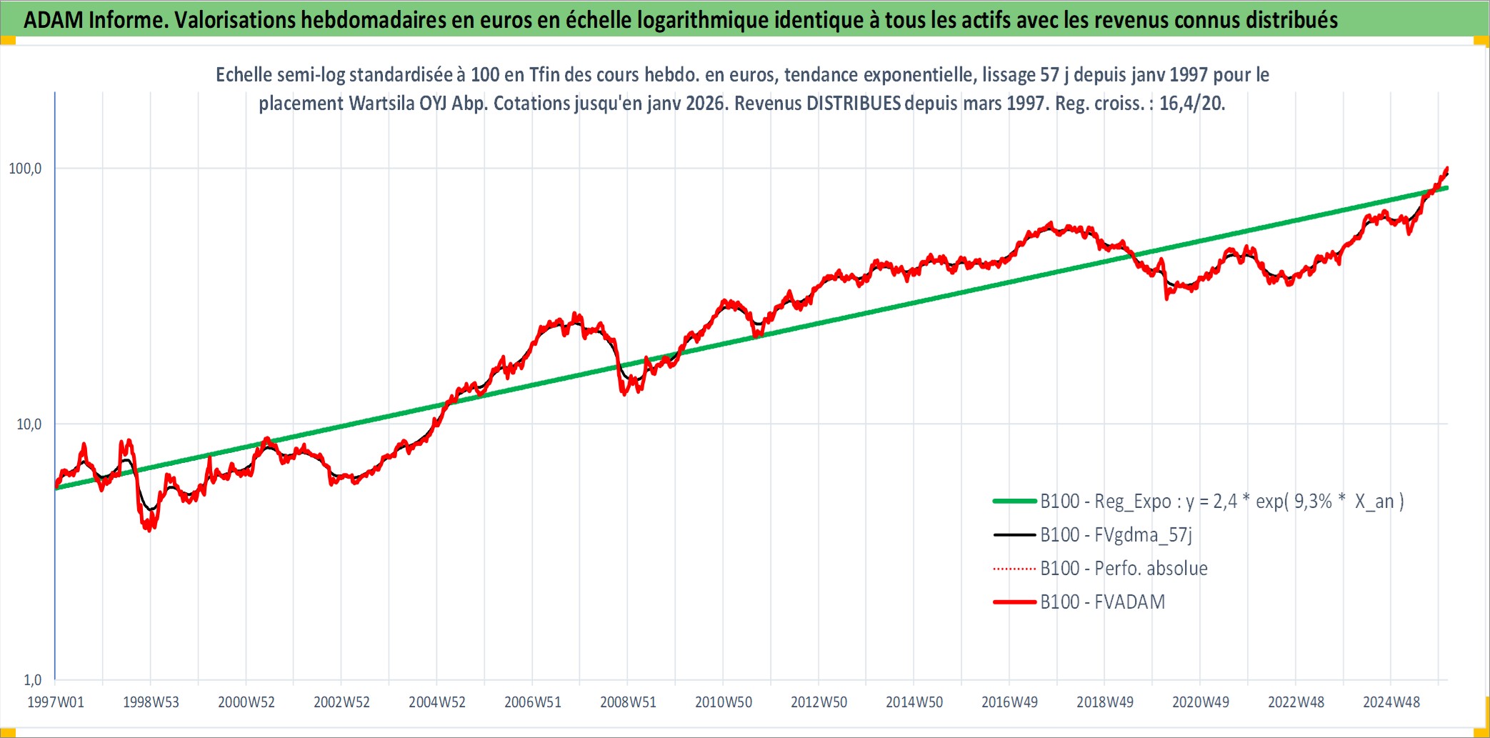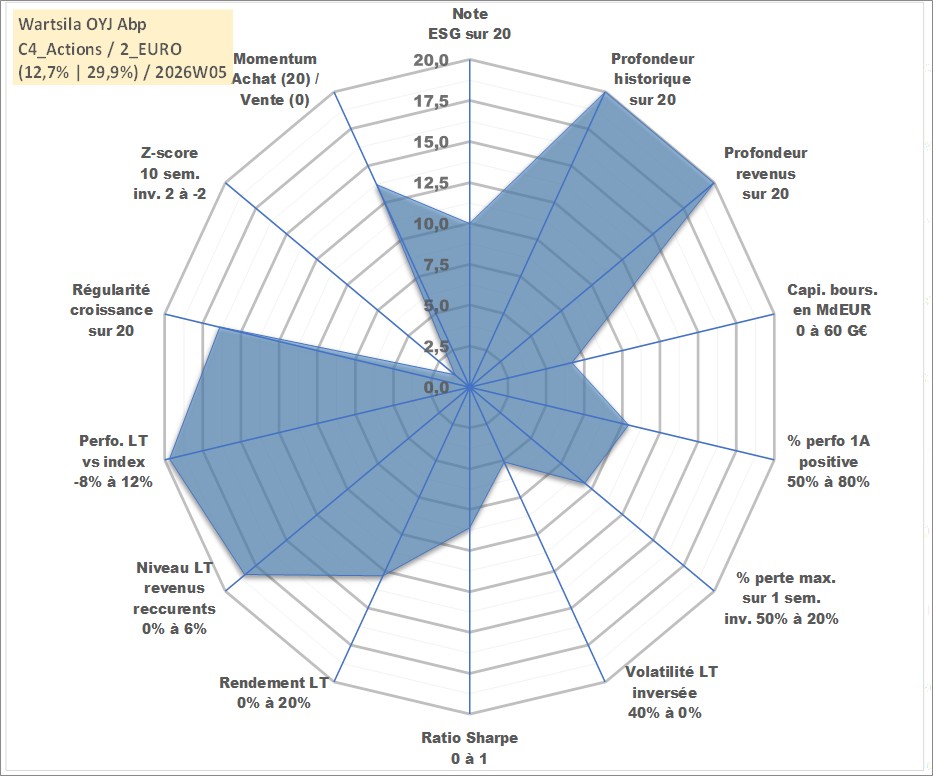Site dédié aux investisseursPage dédiée sur site financeAnalyse des valorisations hebdomadaires de l'action Wartsila OYJ Abp. Cet actif est cote en EUR. Les valorisations couvrent les semaines 1997W01 a 2026W05. Les revenus de cet actif financier sont pris en compte depuis la semaine 1997W13. La note globale ESG de cet actif est estimee a 10.0 (apres rebasage entre 0 et 20).