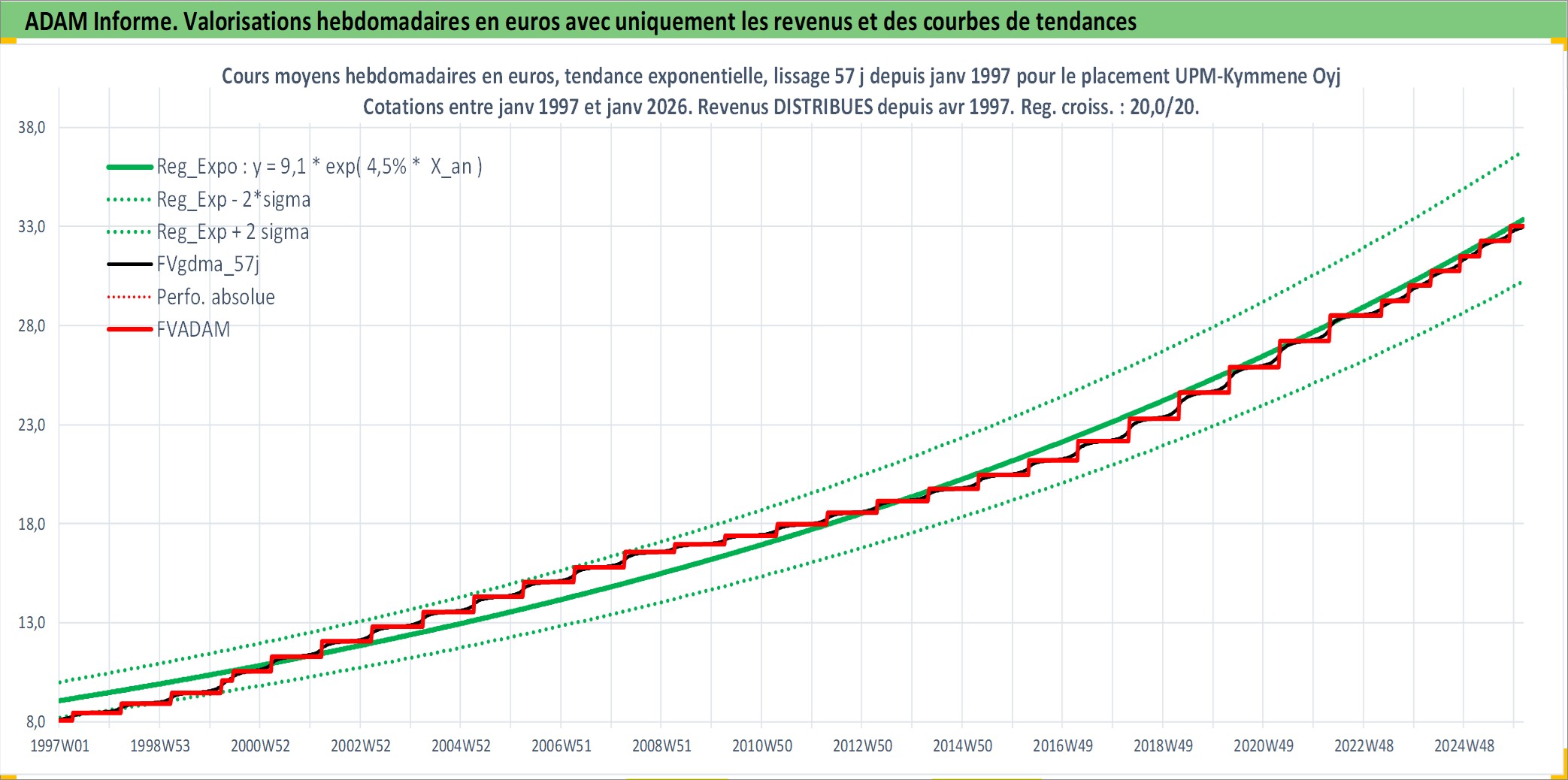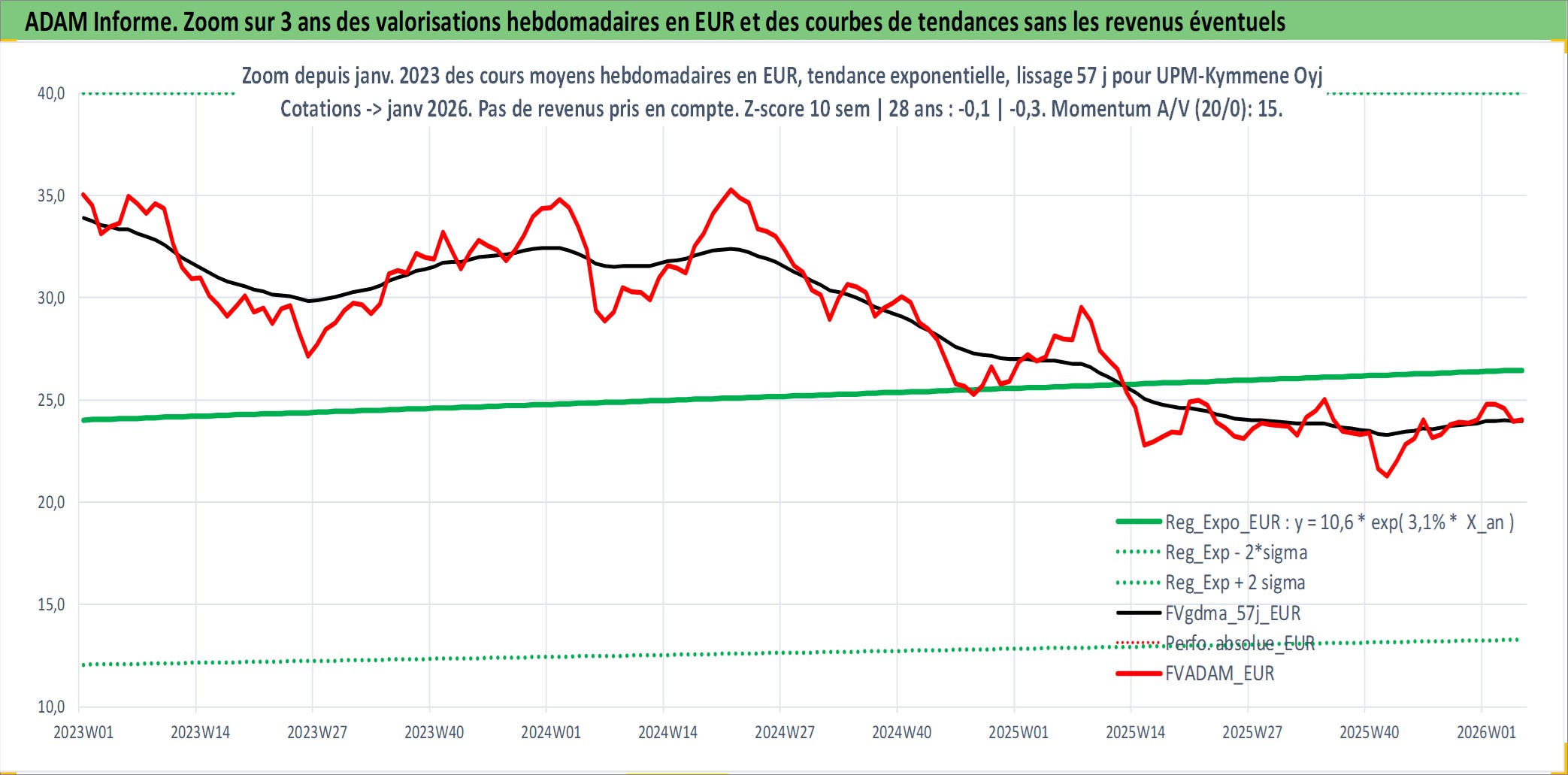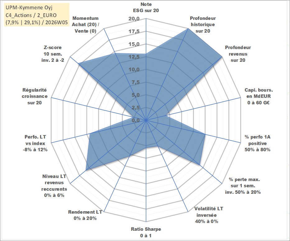 Site dédié aux investisseursPage dédiée sur site financeAnalyse des valorisations hebdomadaires de l'action UPM-Kymmene Oyj. Cet actif est cote en EUR. Les valorisations couvrent les semaines 1997W01 a 2026W05. Les revenus de cet actif financier sont pris en compte depuis la semaine 1997W15. La note globale ESG de cet actif est estimee a 13.0 (apres rebasage entre 0 et 20).