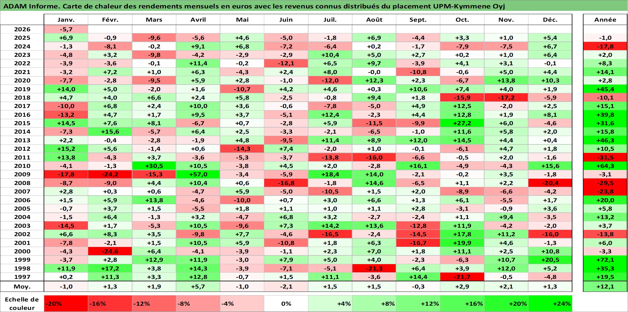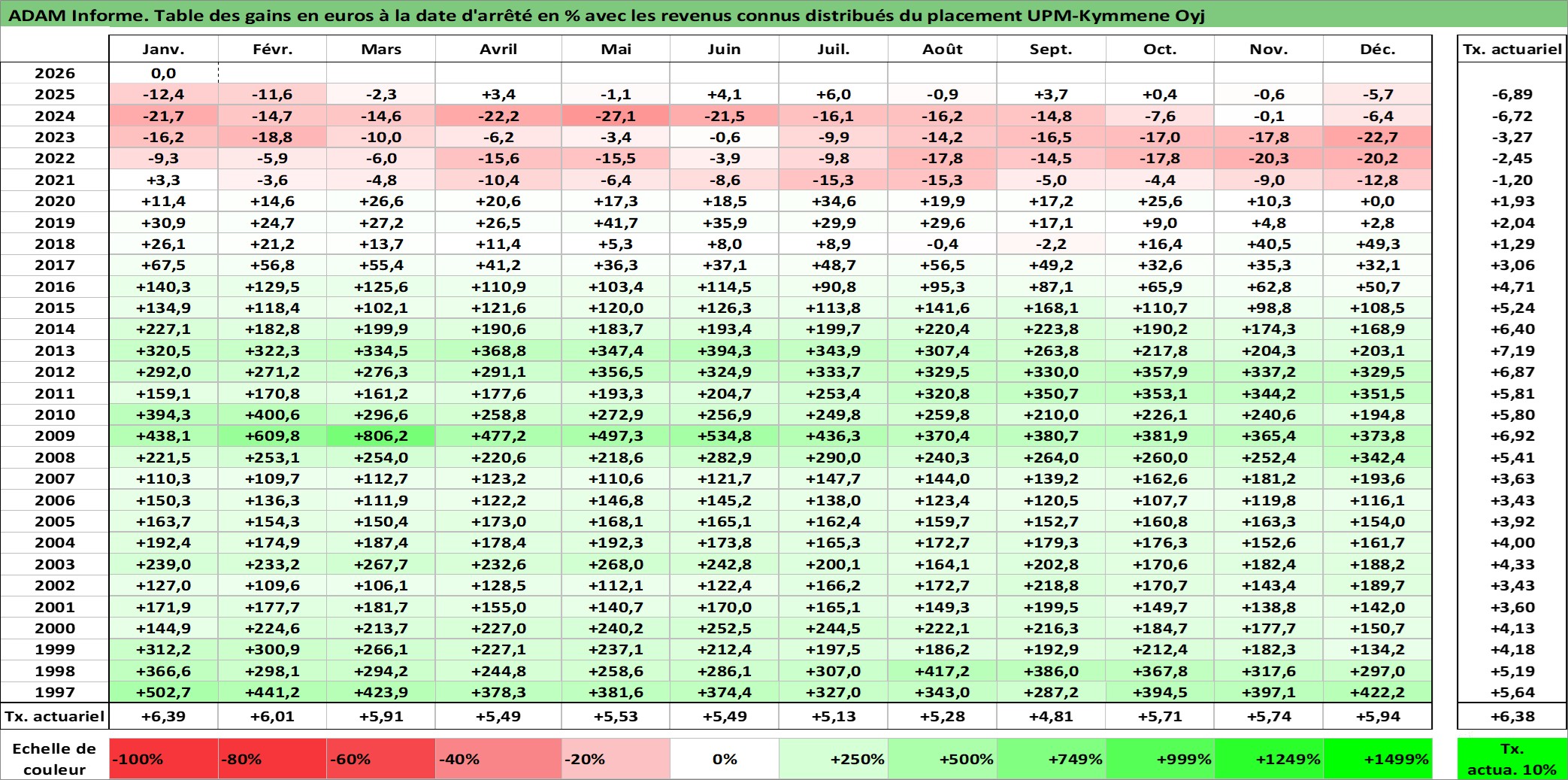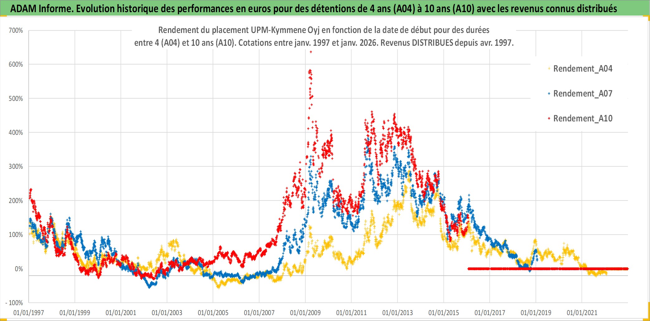 Site dédié aux investisseursPage dédiée sur site financeAnalyse des valorisations hebdomadaires de l'action UPM-Kymmene Oyj. Cet actif est cote en EUR. Les valorisations couvrent les semaines 1997W01 a 2026W05. Les revenus de cet actif financier sont pris en compte depuis la semaine 1997W15. La note globale ESG de cet actif est estimee a 13.0 (apres rebasage entre 0 et 20).