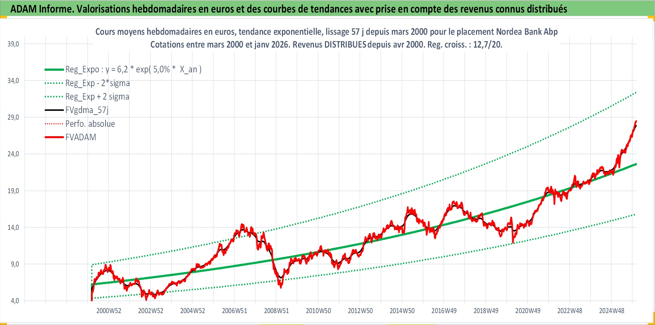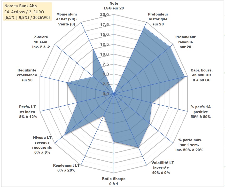 Site dédié aux investisseursPage dédiée sur site financeAnalyse des valorisations hebdomadaires de l'action Nordea Bank Abp. Cet actif est cote en EUR. Les valorisations couvrent les semaines 2000W10 a 2026W05. Les revenus de cet actif financier sont pris en compte depuis la semaine 2000W15. La note ESG de cet actif n'est pas connue.