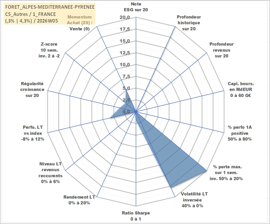 Site dédié aux investisseursPage dédiée sur site financeAnalyse des valorisations hebdomadaires de l'actif FORET_ALPES-MEDITERRANEE-PYRENEE. Cet actif est cote en EUR. Les valorisations couvrent les semaines 1997W01 a 2026W05. Les fermages de ce bien foncier sont pris egaux a 2,5% annuels de la valeur venale du bien.
