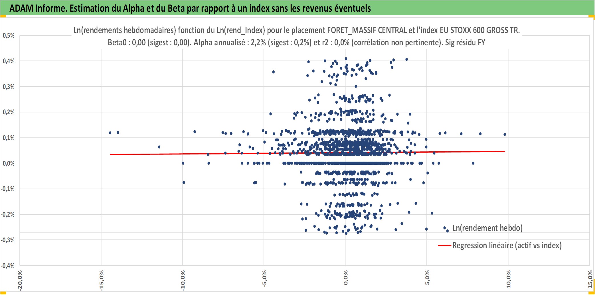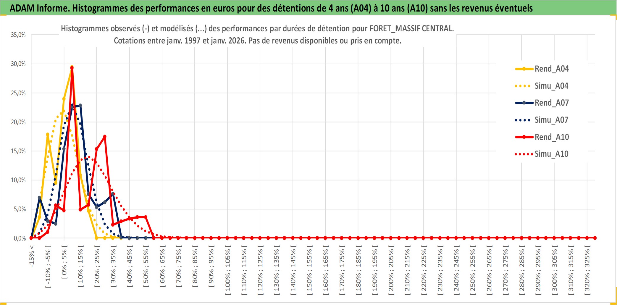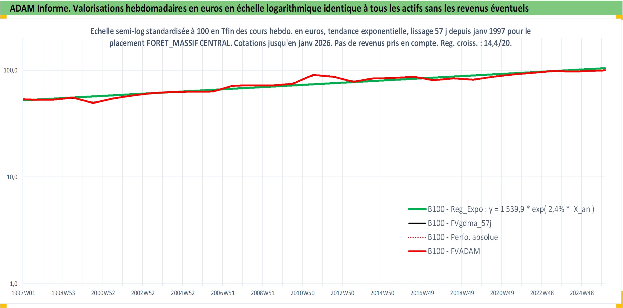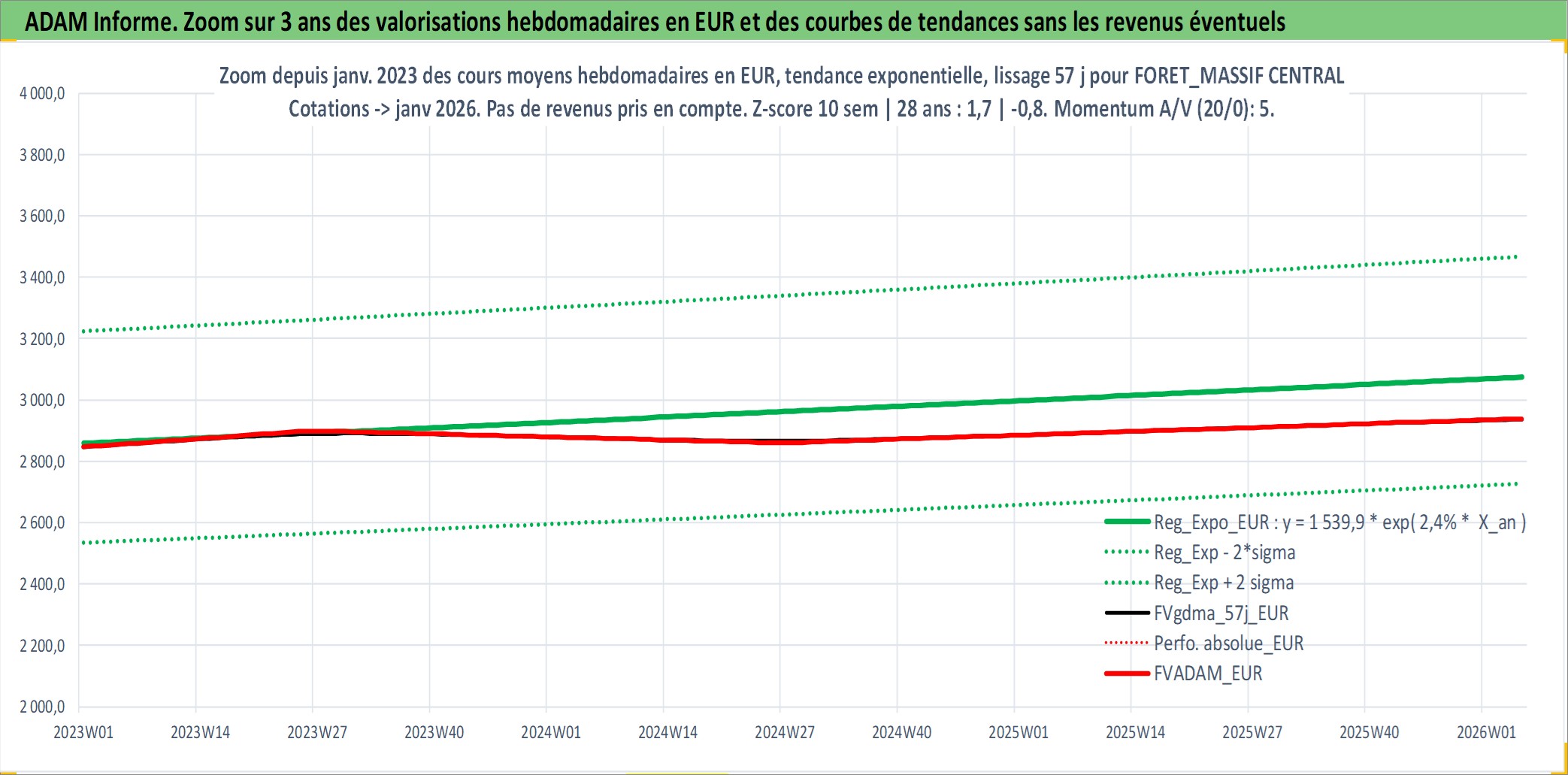 Site dédié aux investisseursPage dédiée sur site financeAnalyse des valorisations hebdomadaires de l'actif FORET_MASSIF CENTRAL. Cet actif est cote en EUR. Les valorisations couvrent les semaines 1997W01 a 2026W05. Les fermages de ce bien foncier sont pris egaux a 2,5% annuels de la valeur venale du bien.