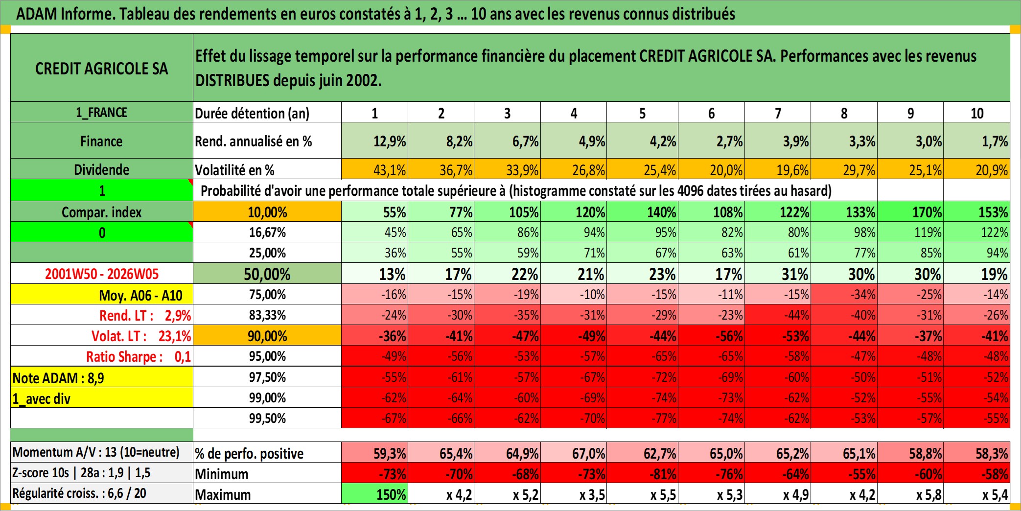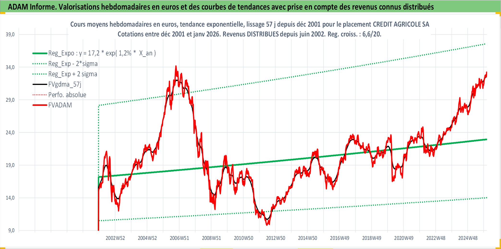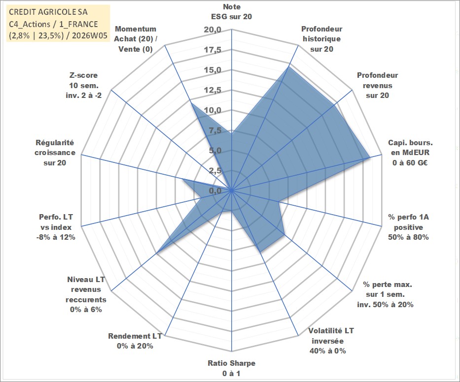 Site dédié aux investisseursPage dédiée sur site financeAnalyse des valorisations hebdomadaires de l'action CREDIT AGRICOLE SA. Cet actif est cote en EUR. Les valorisations couvrent les semaines 2001W50 a 2026W05. Les revenus de cet actif financier sont pris en compte depuis la semaine 2002W23. La note globale ESG de cet actif est estimee a 7.0 (apres rebasage entre 0 et 20).