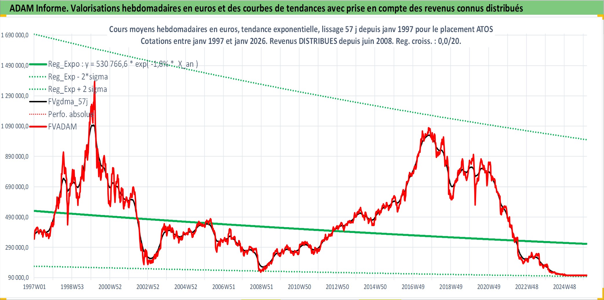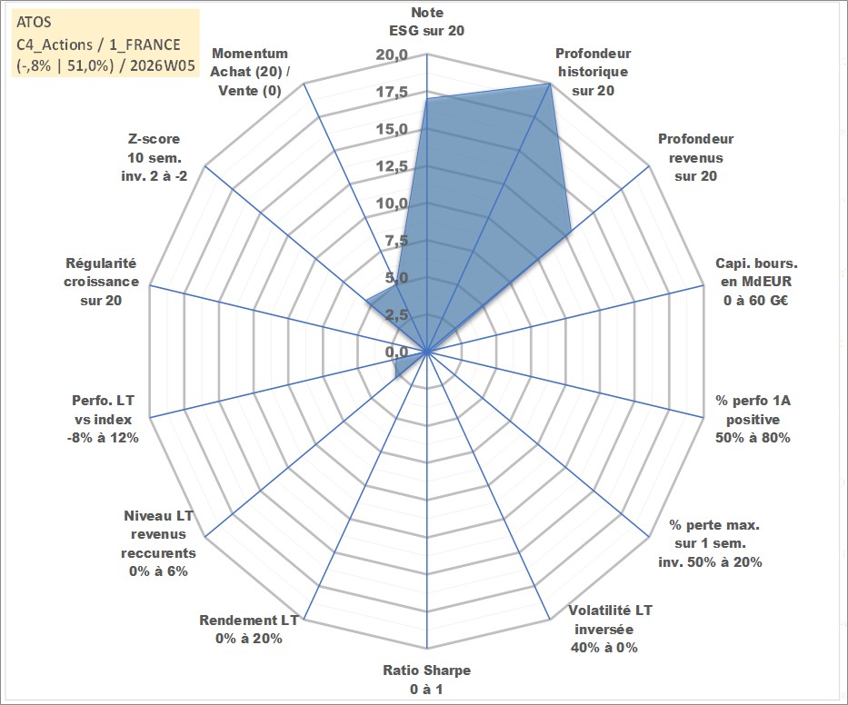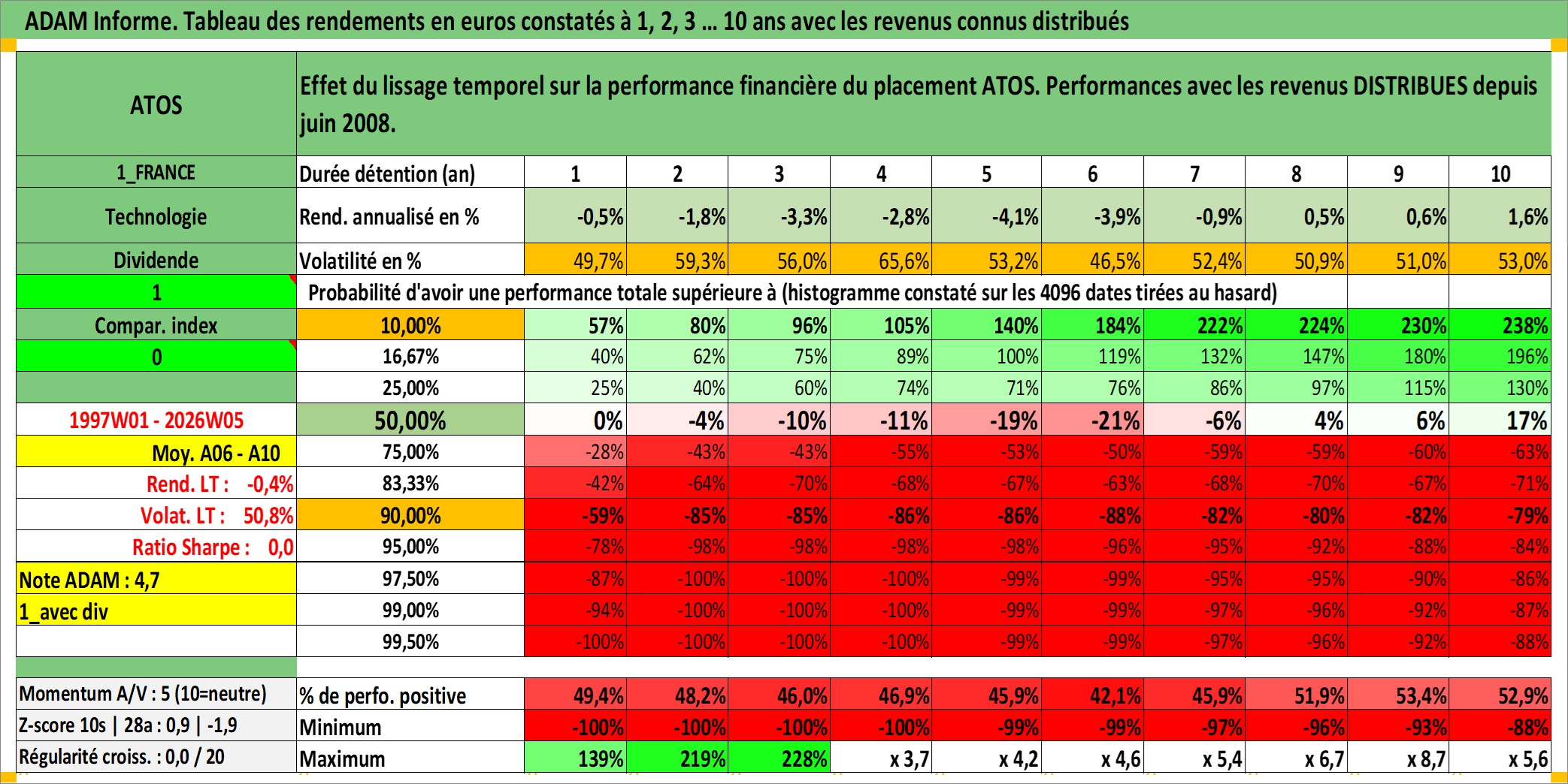 Site dédié aux investisseursPage dédiée sur site financeAnalyse des valorisations hebdomadaires de l'action ATOS. Cet actif est cote en EUR. Les valorisations couvrent les semaines 1997W01 a 2026W05. Les revenus de cet actif financier sont pris en compte depuis la semaine 2008W27. La note globale ESG de cet actif est estimee a 17.0 (apres rebasage entre 0 et 20).