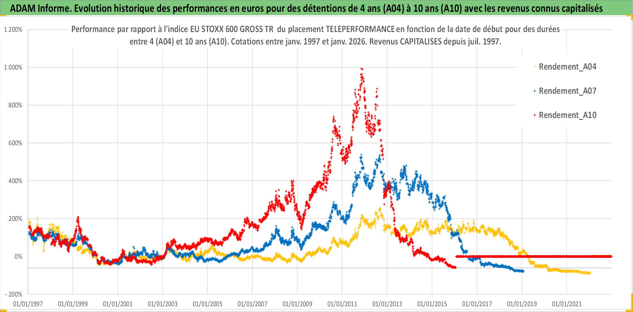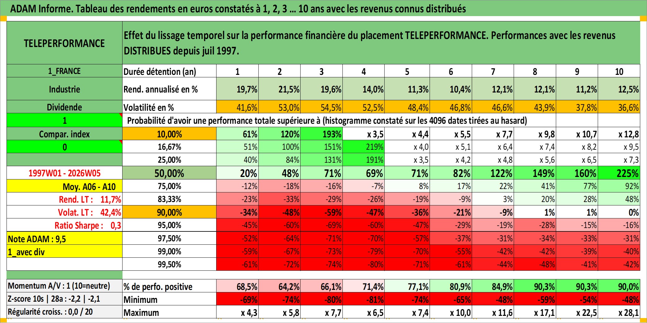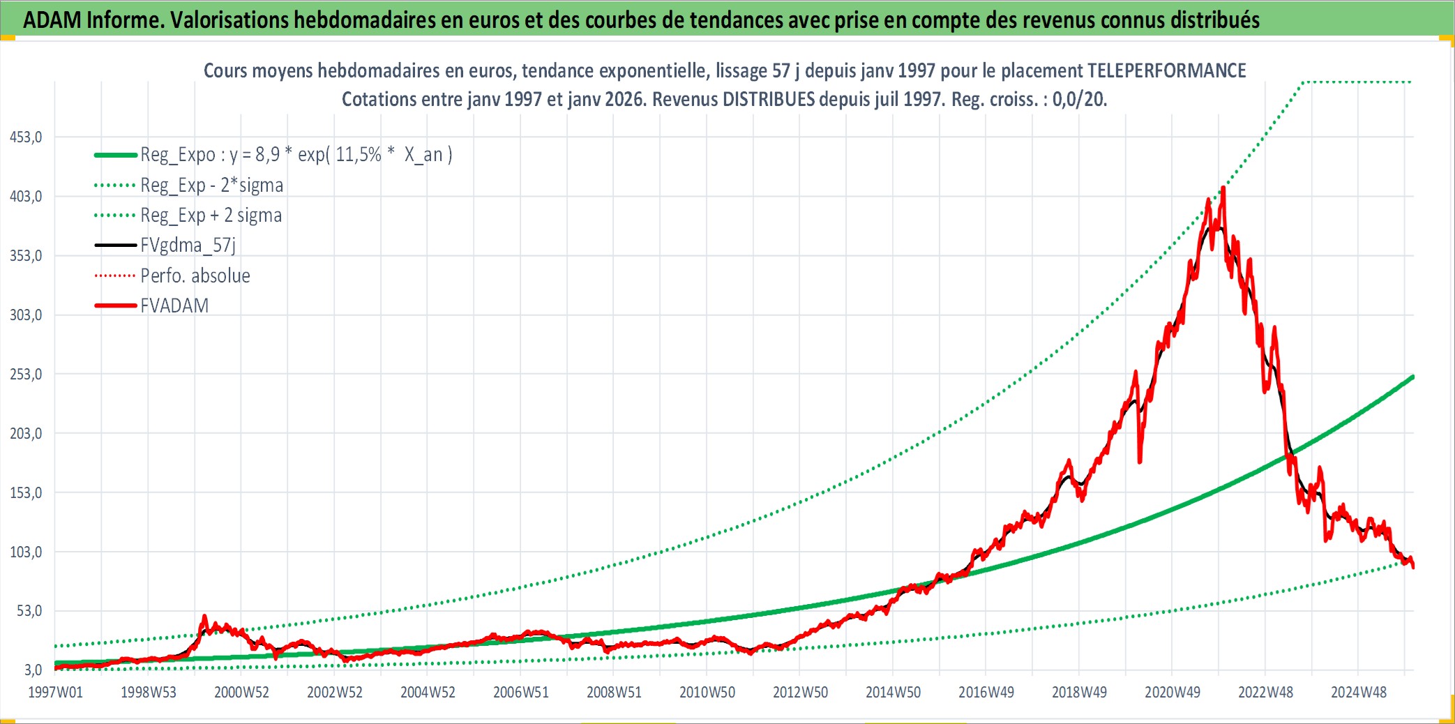 Site dédié aux investisseursPage dédiée sur site financeAnalyse des valorisations hebdomadaires de l'action TELEPERFORMANCE. Cet actif est cote en EUR. Les valorisations couvrent les semaines 1997W01 a 2026W05. Les revenus de cet actif financier sont pris en compte depuis la semaine 1997W29. La note globale ESG de cet actif est estimee a 13.0 (apres rebasage entre 0 et 20).