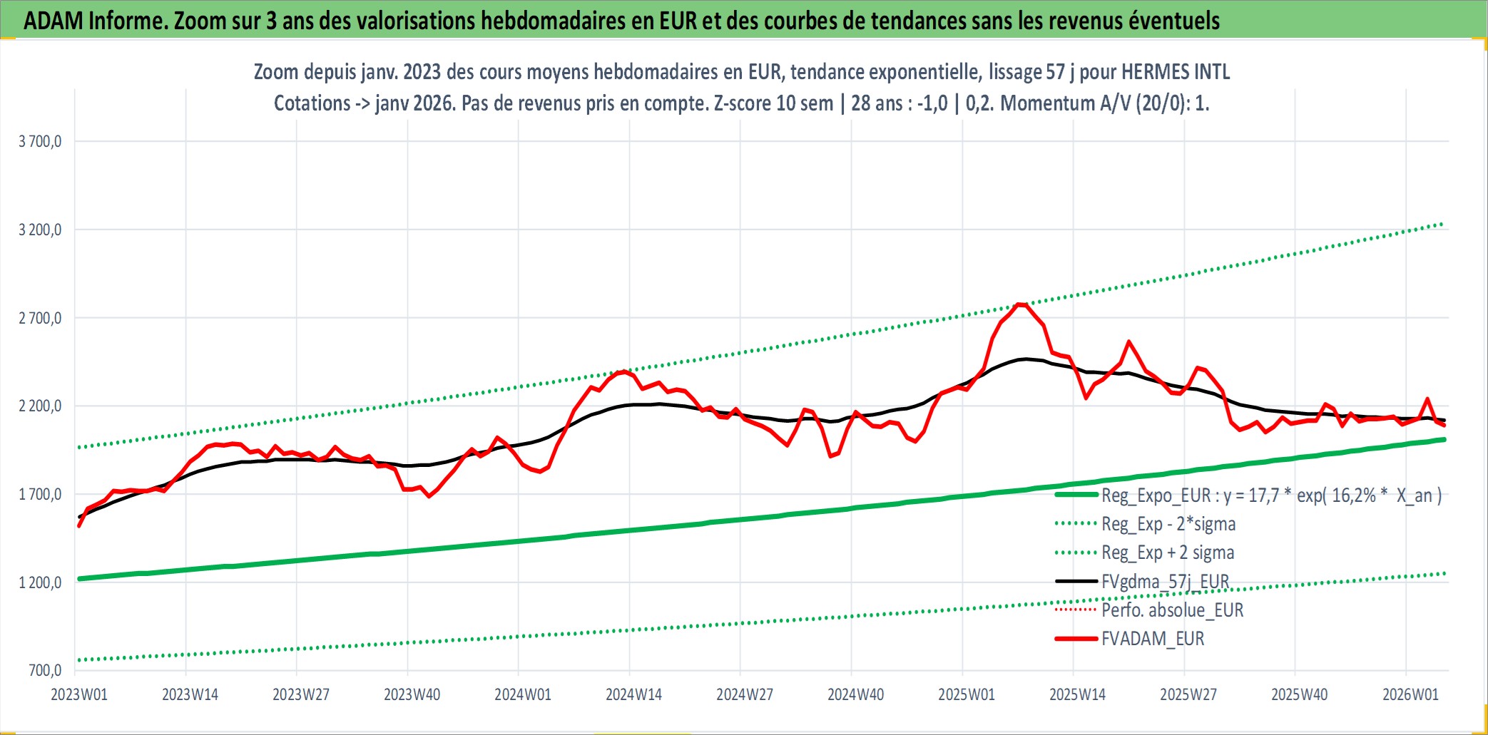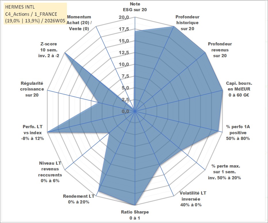 Site dédié aux investisseursPage dédiée sur site financeAnalyse des valorisations hebdomadaires de l'action HERMES INTL. Cet actif est cote en EUR. Les valorisations couvrent les semaines 1997W01 a 2026W05. Les revenus de cet actif financier sont pris en compte depuis la semaine 1997W23. La note globale ESG de cet actif est estimee a 17.0 (apres rebasage entre 0 et 20).