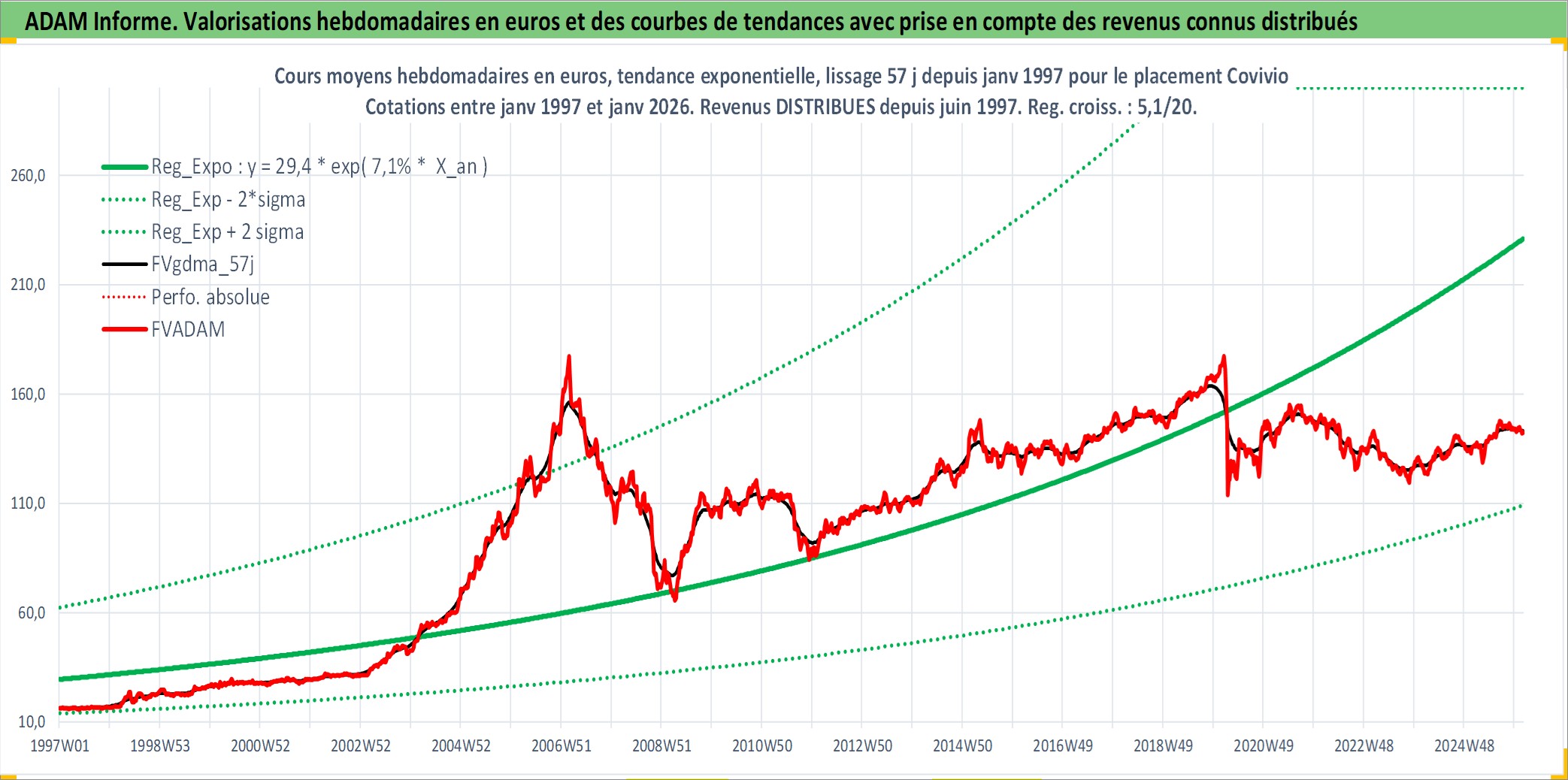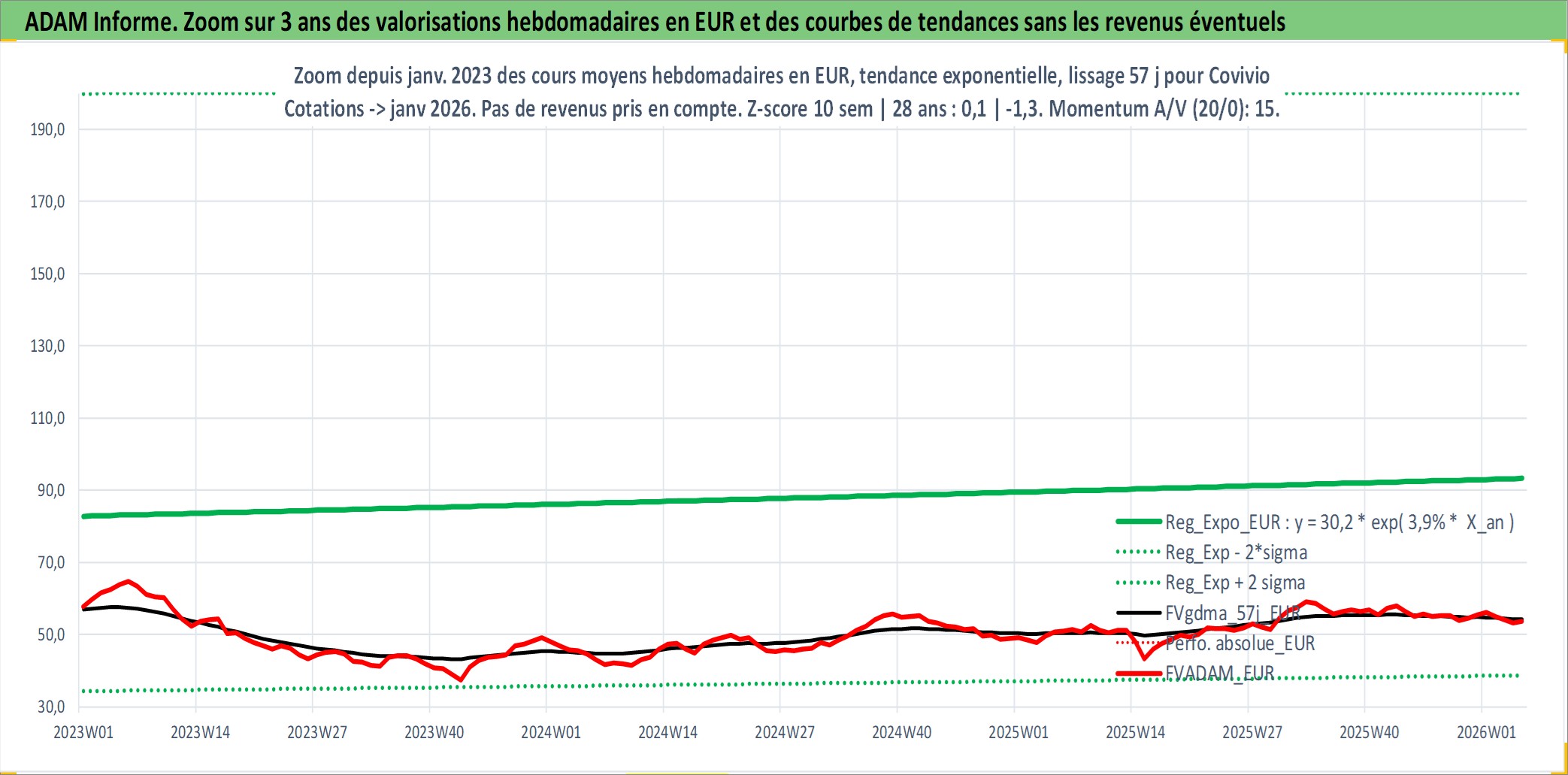 Site dédié aux investisseursPage dédiée sur site financeAnalyse des valorisations hebdomadaires de l'action Covivio. Cet actif est cote en EUR. Les valorisations couvrent les semaines 1997W01 a 2026W05. Les revenus de cet actif financier sont pris en compte depuis la semaine 1997W23. La note globale ESG de cet actif est estimee a 18.0 (apres rebasage entre 0 et 20).