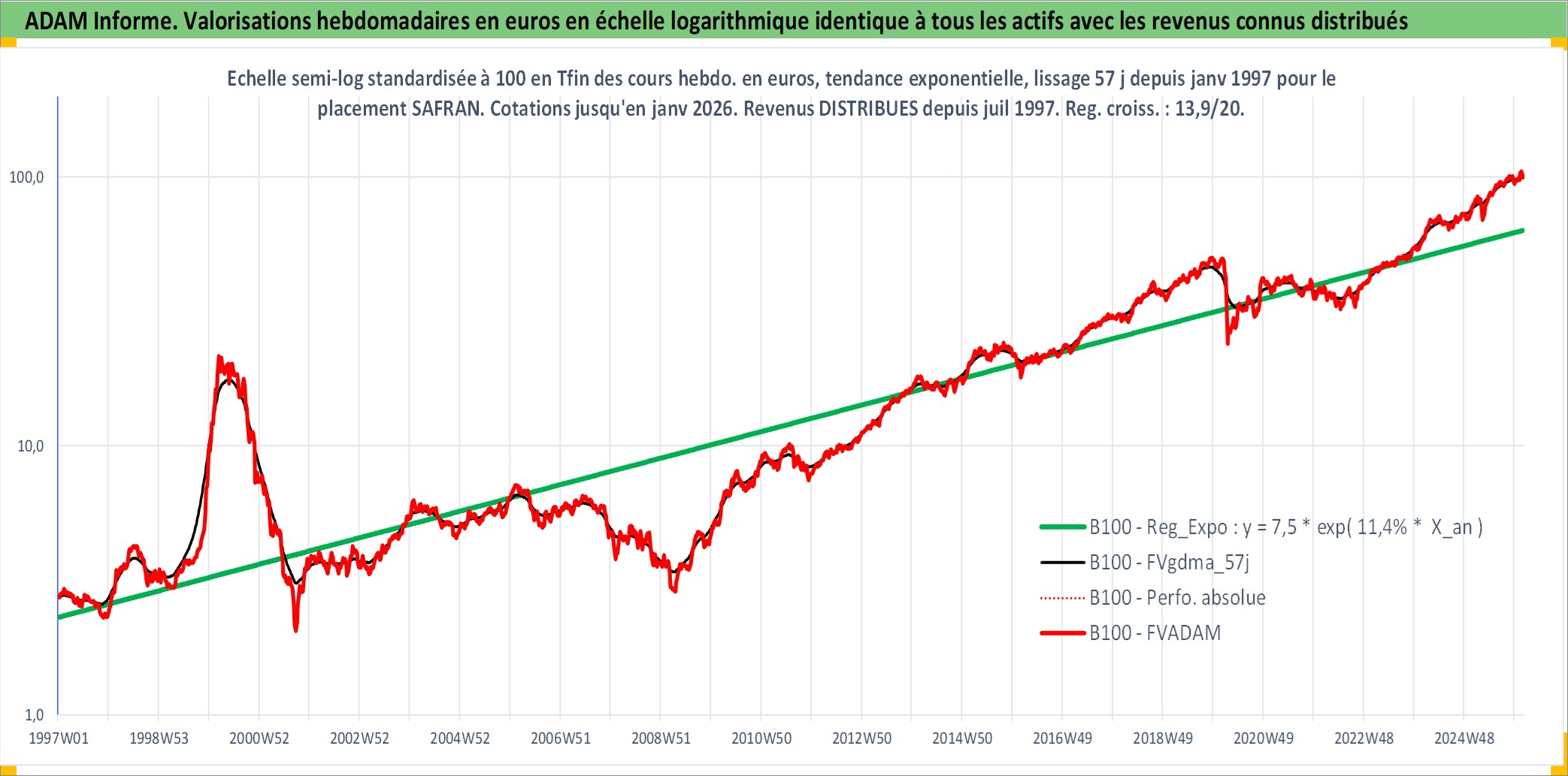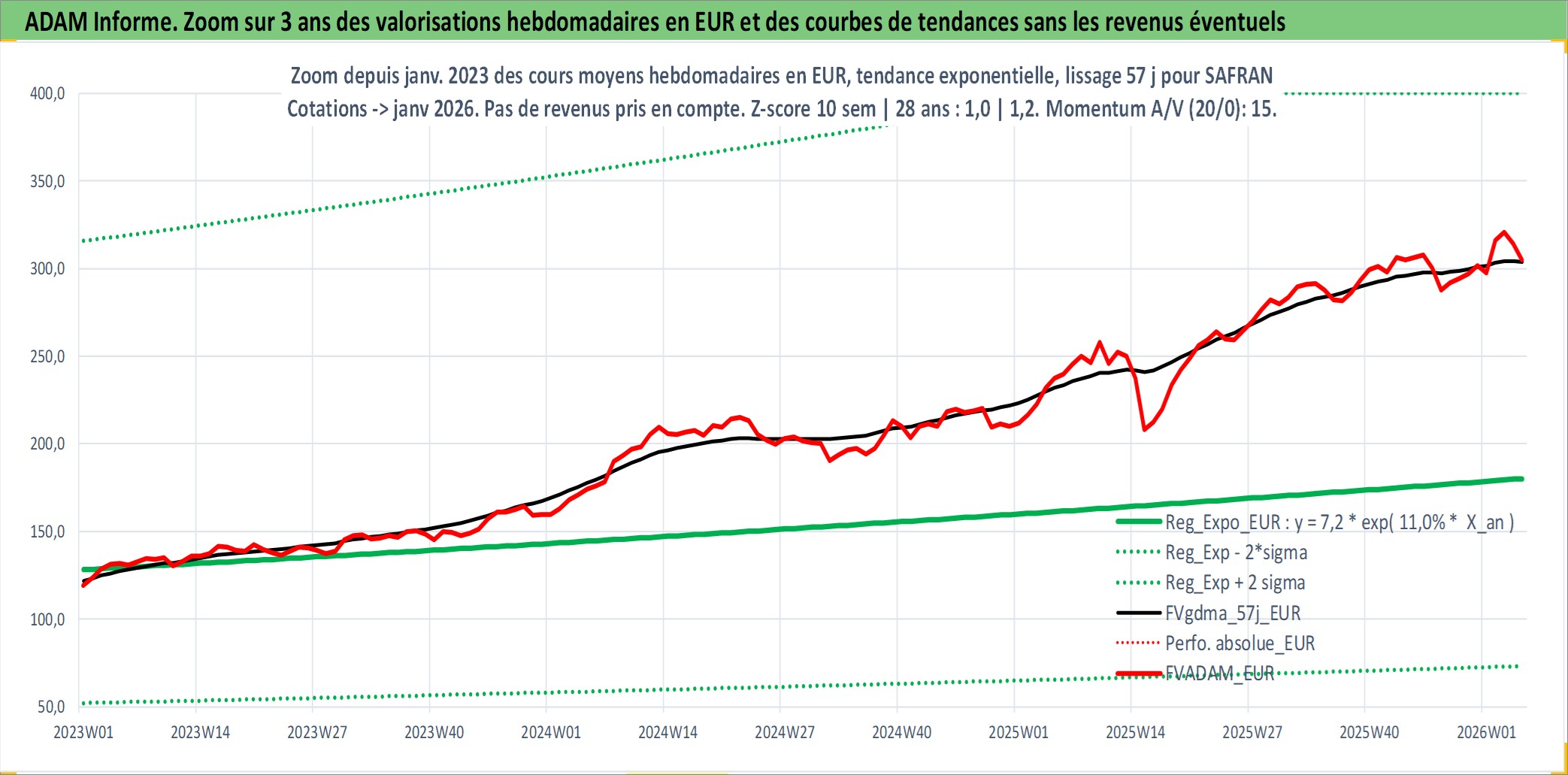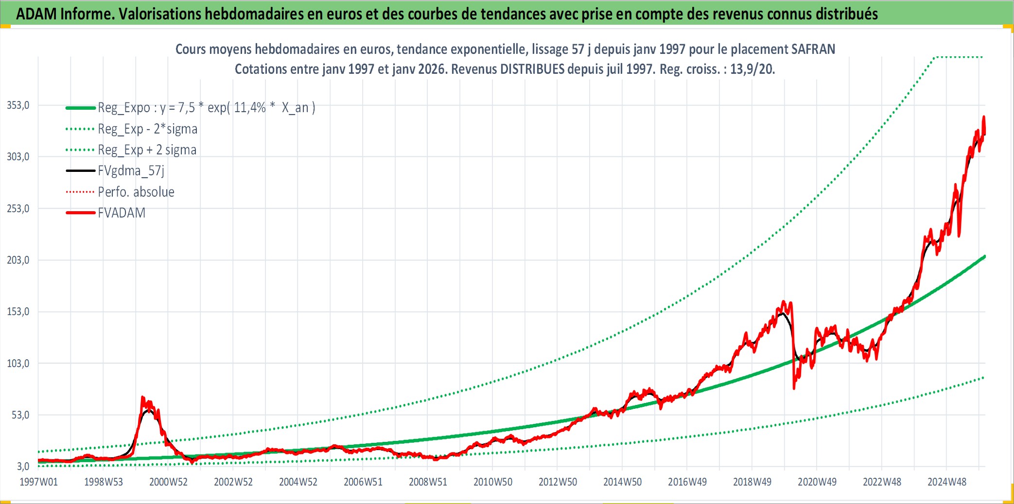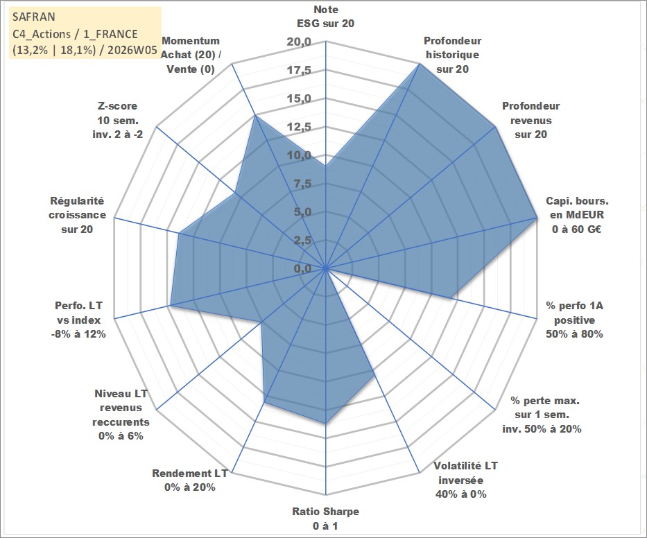Site dédié aux investisseursPage dédiée sur site financeAnalyse des valorisations hebdomadaires de l'action SAFRAN. Cet actif est cote en EUR. Les valorisations couvrent les semaines 1997W01 a 2026W05. Les revenus de cet actif financier sont pris en compte depuis la semaine 1997W28. La note globale ESG de cet actif est estimee a 9.0 (apres rebasage entre 0 et 20).