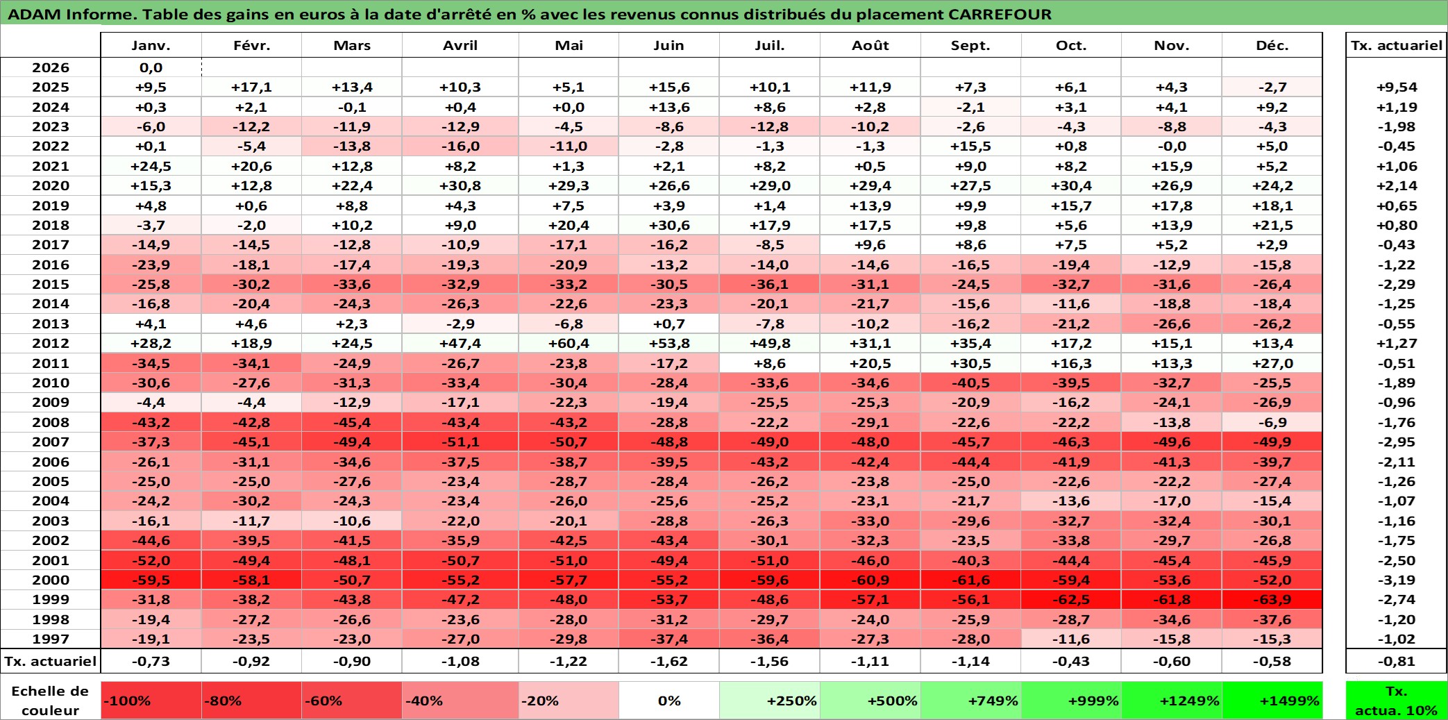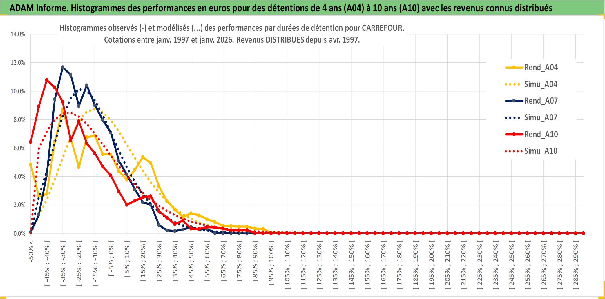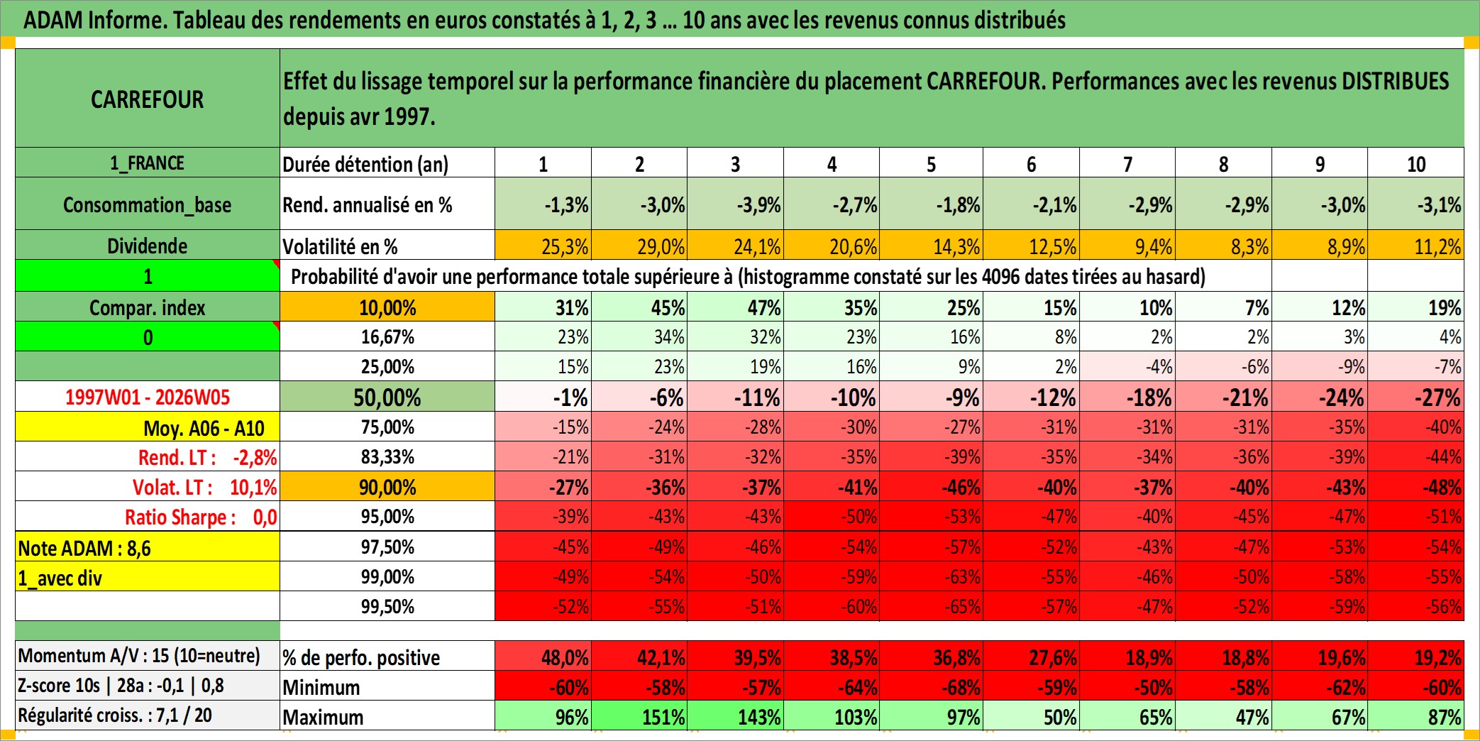 Site dédié aux investisseursPage dédiée sur site financeAnalyse des valorisations hebdomadaires de l'action CARREFOUR. Cet actif est cote en EUR. Les valorisations couvrent les semaines 1997W01 a 2026W05. Les revenus de cet actif financier sont pris en compte depuis la semaine 1997W18. La note globale ESG de cet actif est estimee a 9.0 (apres rebasage entre 0 et 20).