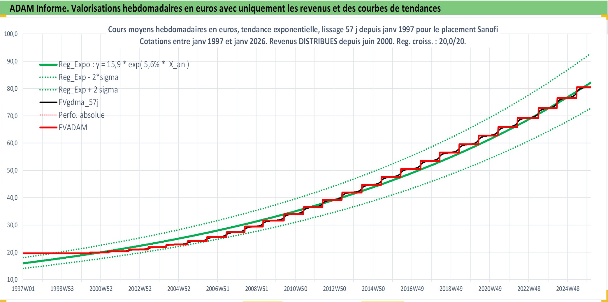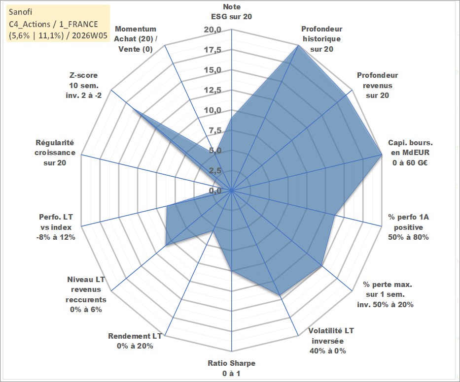 Site dédié aux investisseursPage dédiée sur site financeAnalyse des valorisations hebdomadaires de l'action Sanofi. Cet actif est cote en EUR. Les valorisations couvrent les semaines 1997W01 a 2026W05. Les revenus de cet actif financier sont pris en compte depuis la semaine 2000W23. La note globale ESG de cet actif est estimee a 9.0 (apres rebasage entre 0 et 20).