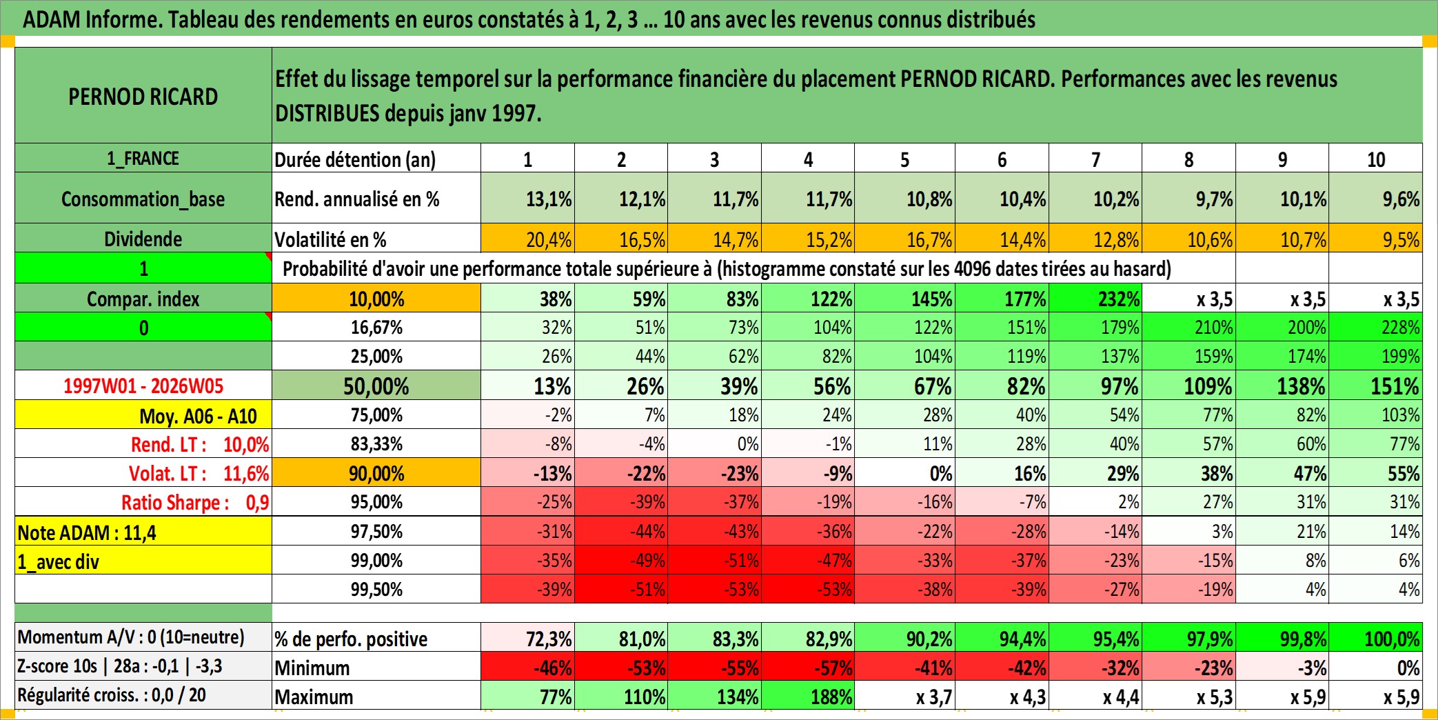 Site dédié aux investisseursPage dédiée sur site financeAnalyse des valorisations hebdomadaires de l'action PERNOD RICARD. Cet actif est cote en EUR. Les valorisations couvrent les semaines 1997W01 a 2026W05. Les revenus de cet actif financier sont pris en compte depuis la semaine 1997W03. La note globale ESG de cet actif est estimee a 13.0 (apres rebasage entre 0 et 20).
