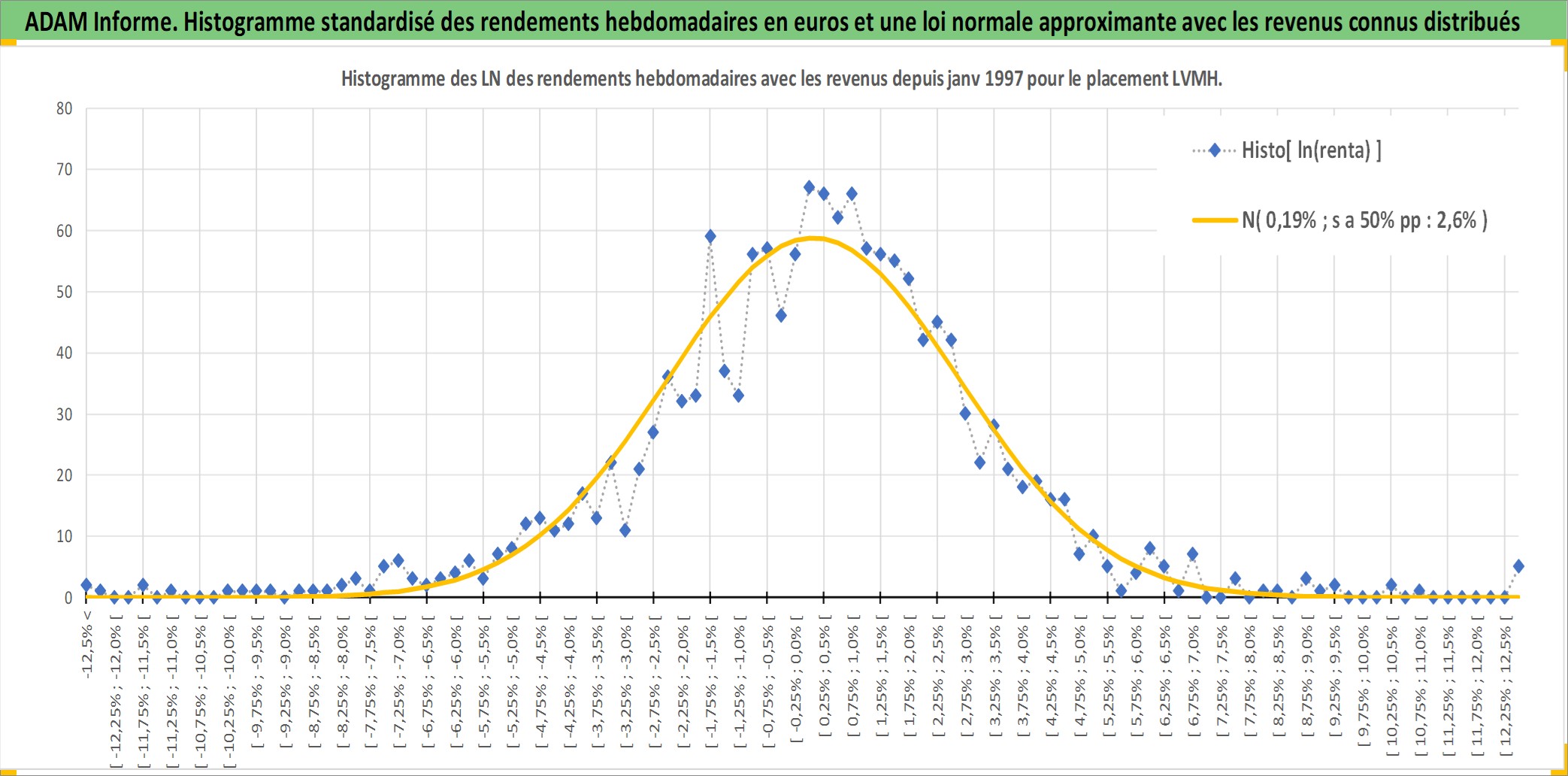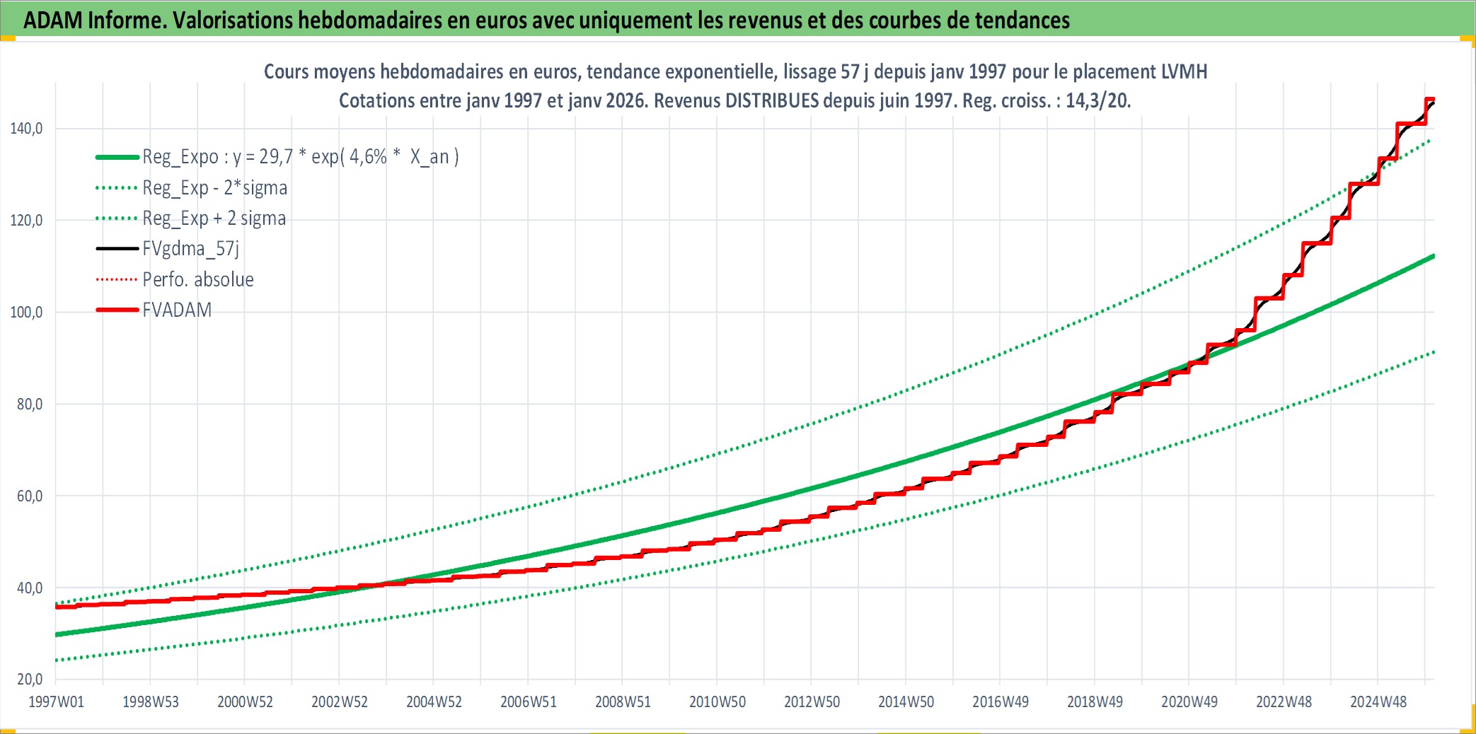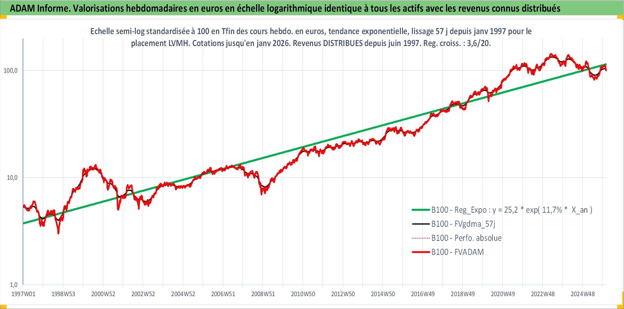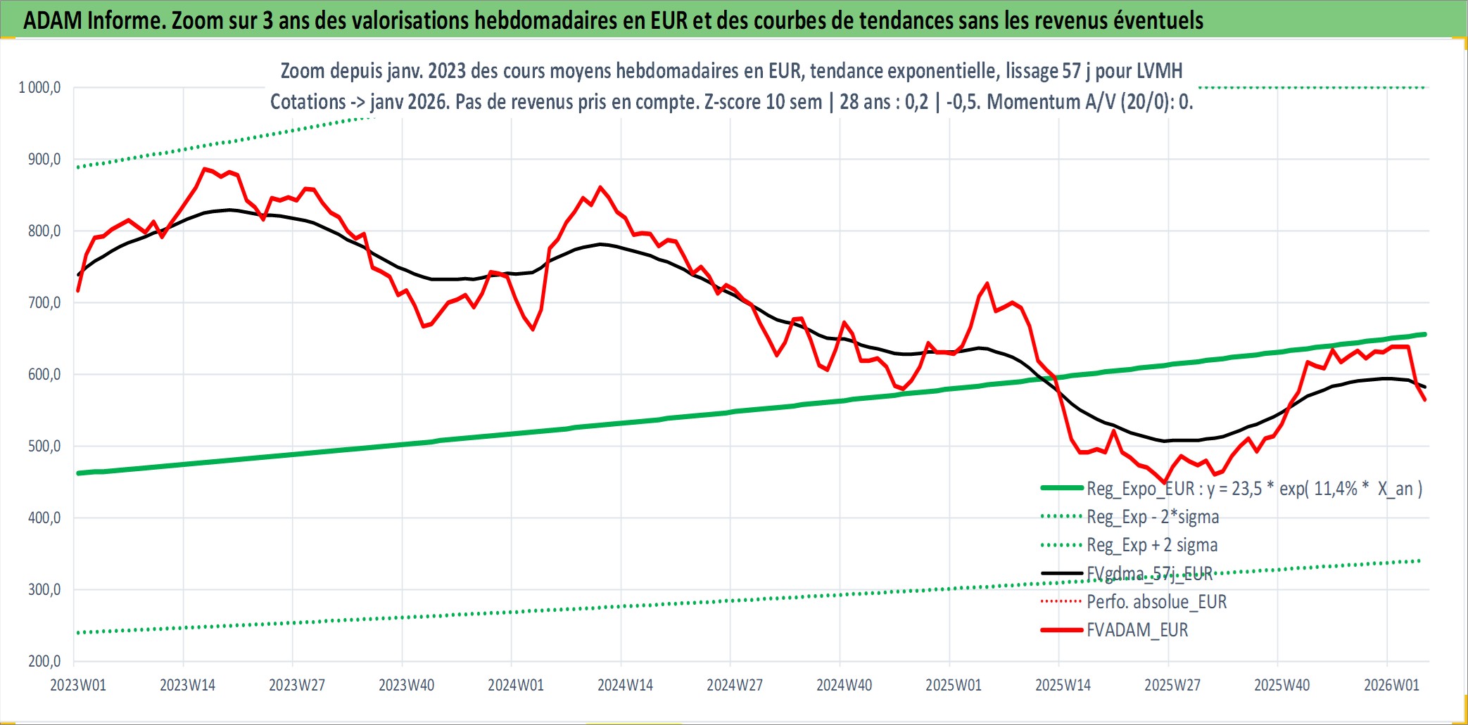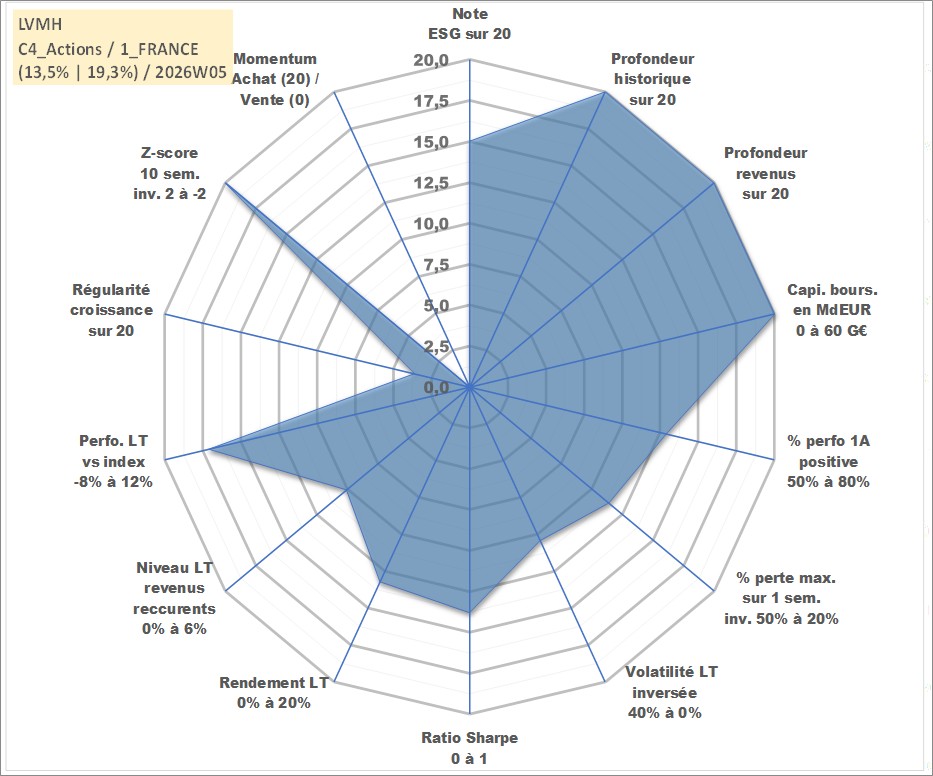 Site dédié aux investisseursPage dédiée sur site financeAnalyse des valorisations hebdomadaires de l'action LVMH. Cet actif est cote en EUR. Les valorisations couvrent les semaines 1997W01 a 2026W05. Les revenus de cet actif financier sont pris en compte depuis la semaine 1997W24. La note globale ESG de cet actif est estimee a 15.0 (apres rebasage entre 0 et 20).