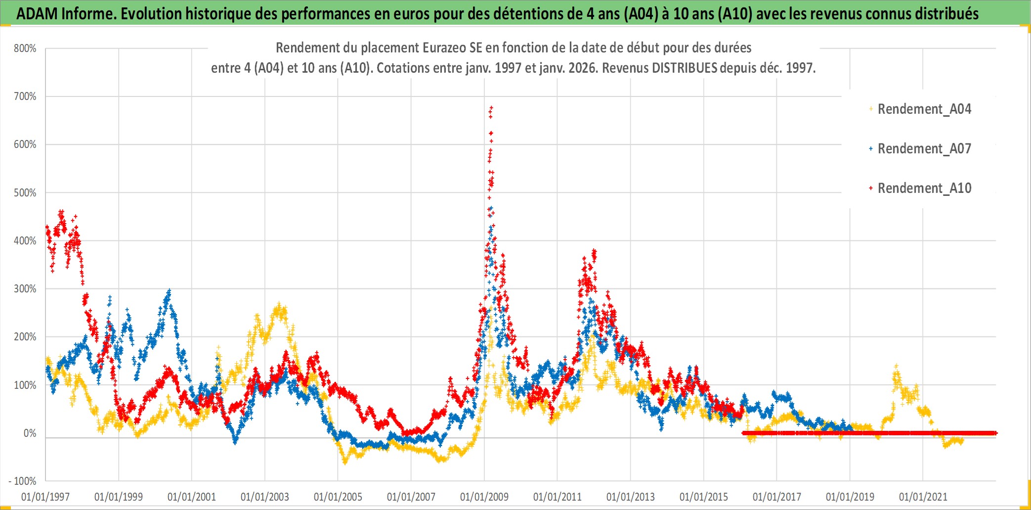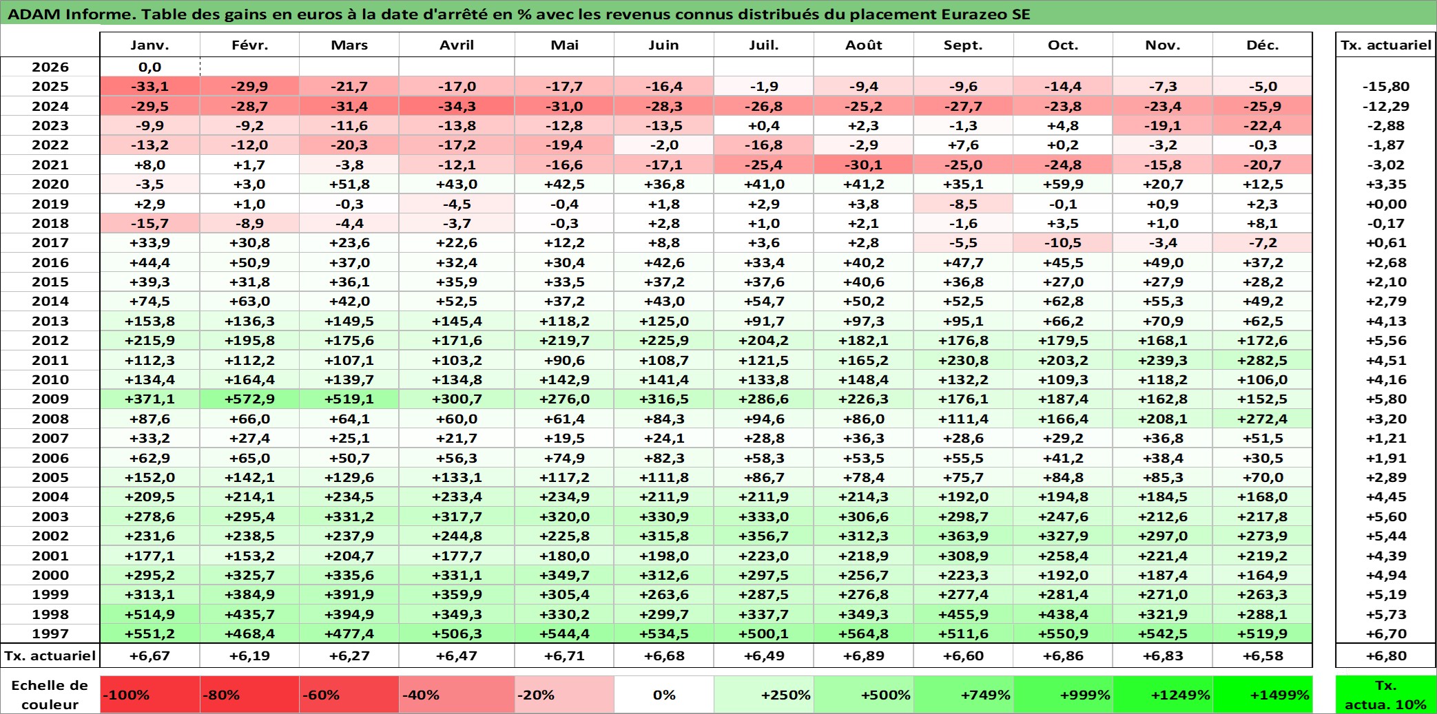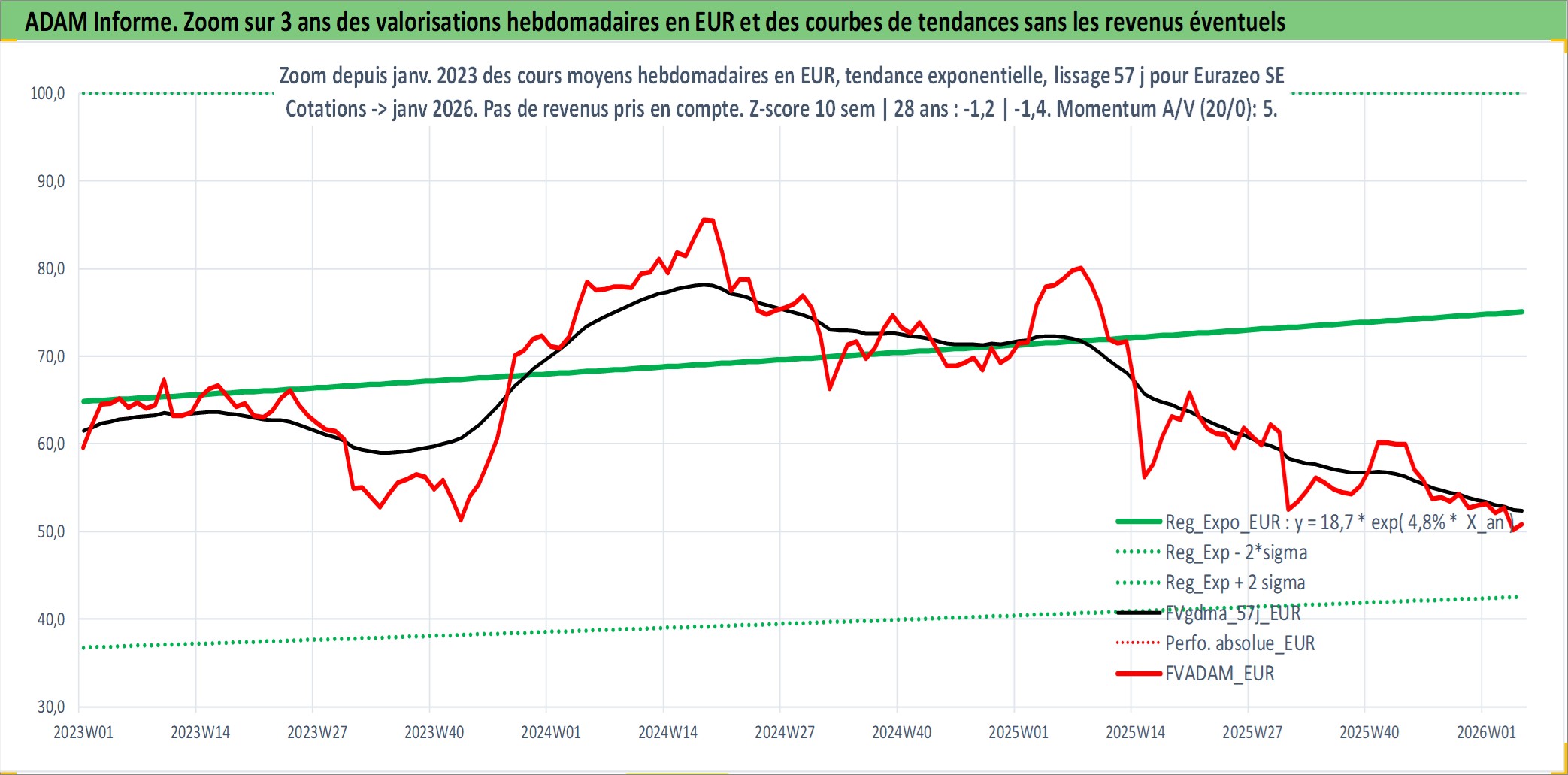 Site dédié aux investisseursPage dédiée sur site financeAnalyse des valorisations hebdomadaires de l'action Eurazeo SE. Cet actif est cote en EUR. Les valorisations couvrent les semaines 1997W01 a 2026W05. Les revenus de cet actif financier sont pris en compte depuis la semaine 1997W51. La note ESG de cet actif n'est pas connue.