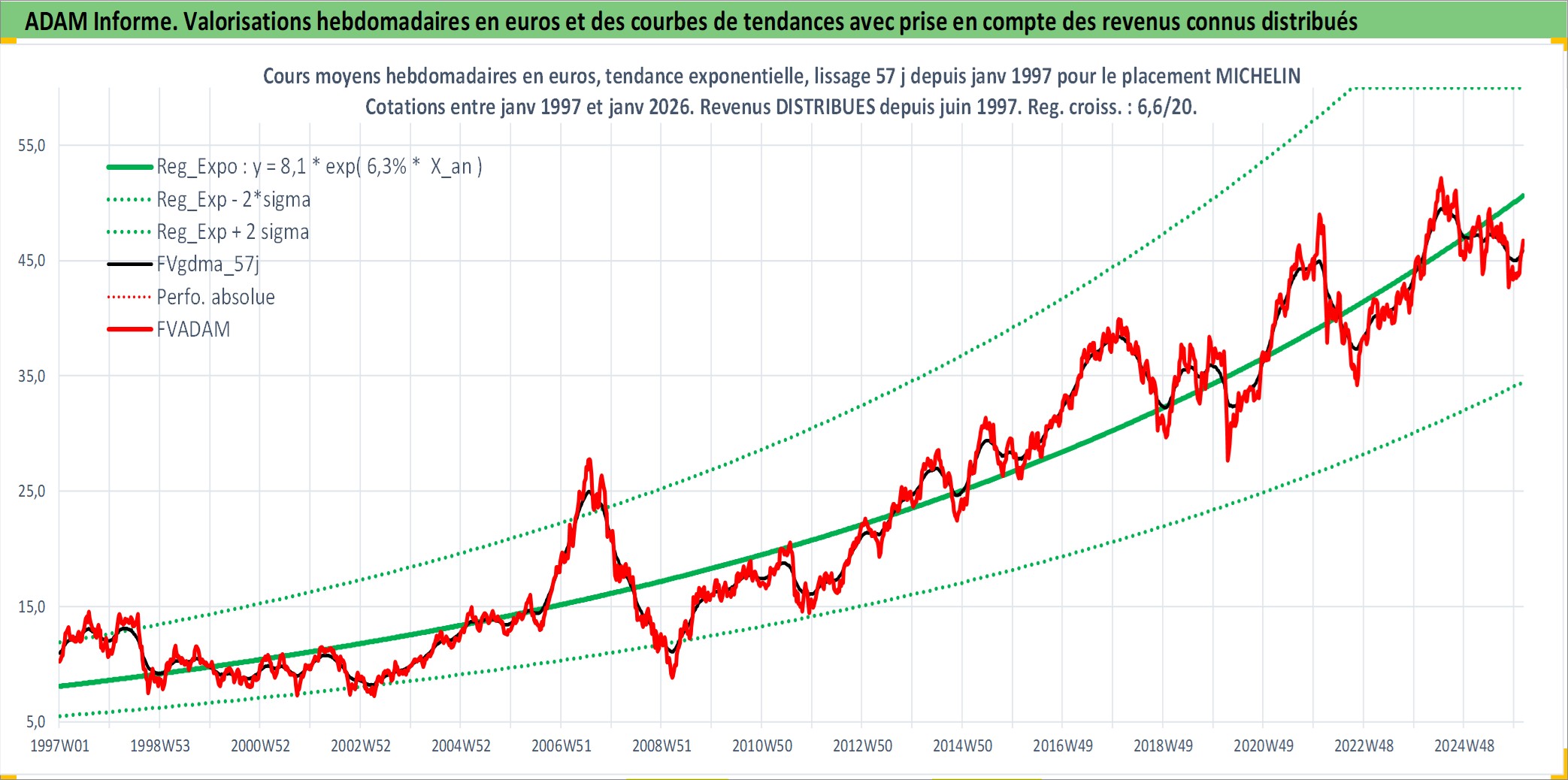 Site dédié aux investisseursPage dédiée sur site financeAnalyse des valorisations hebdomadaires de l'action MICHELIN. Cet actif est cote en EUR. Les valorisations couvrent les semaines 1997W01 a 2026W05. Les revenus de cet actif financier sont pris en compte depuis la semaine 1997W25. La note globale ESG de cet actif est estimee a 15.0 (apres rebasage entre 0 et 20).
