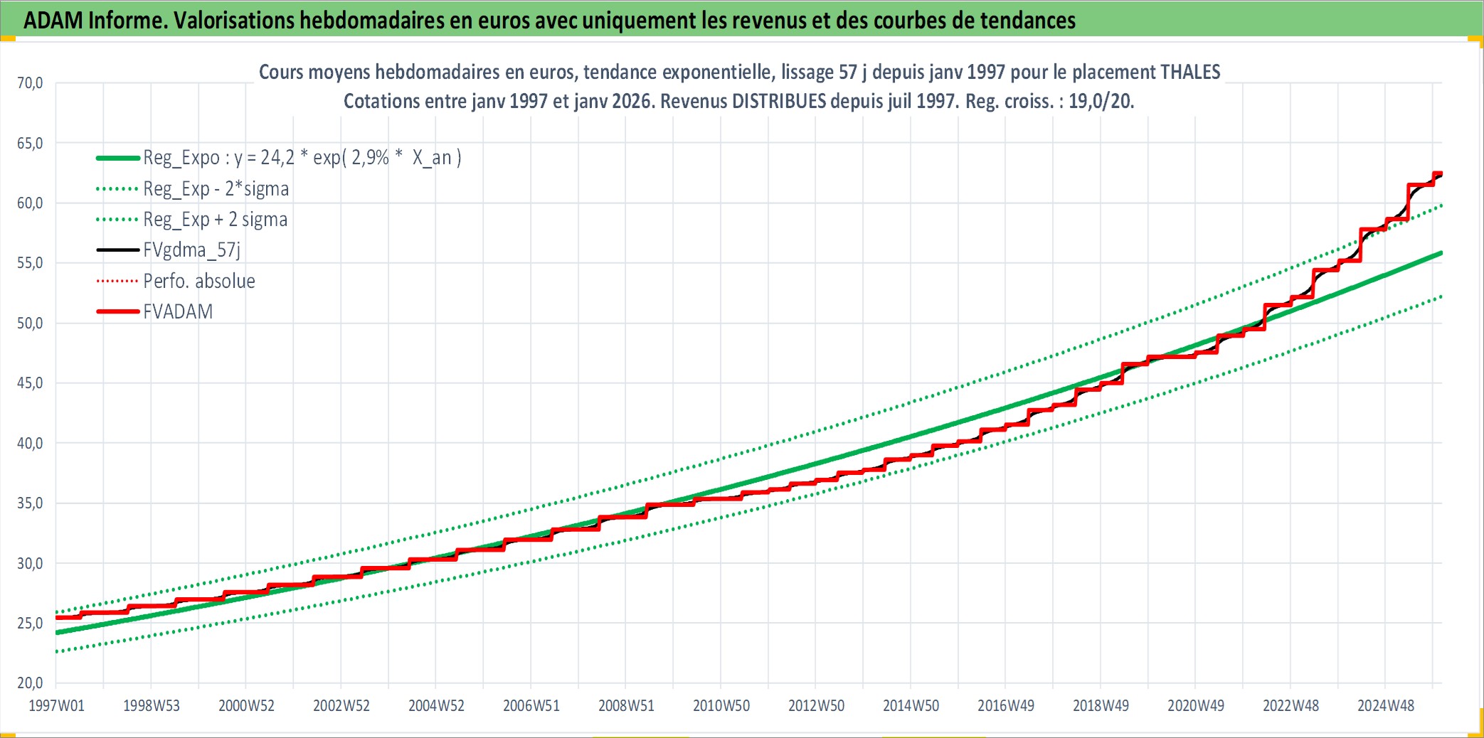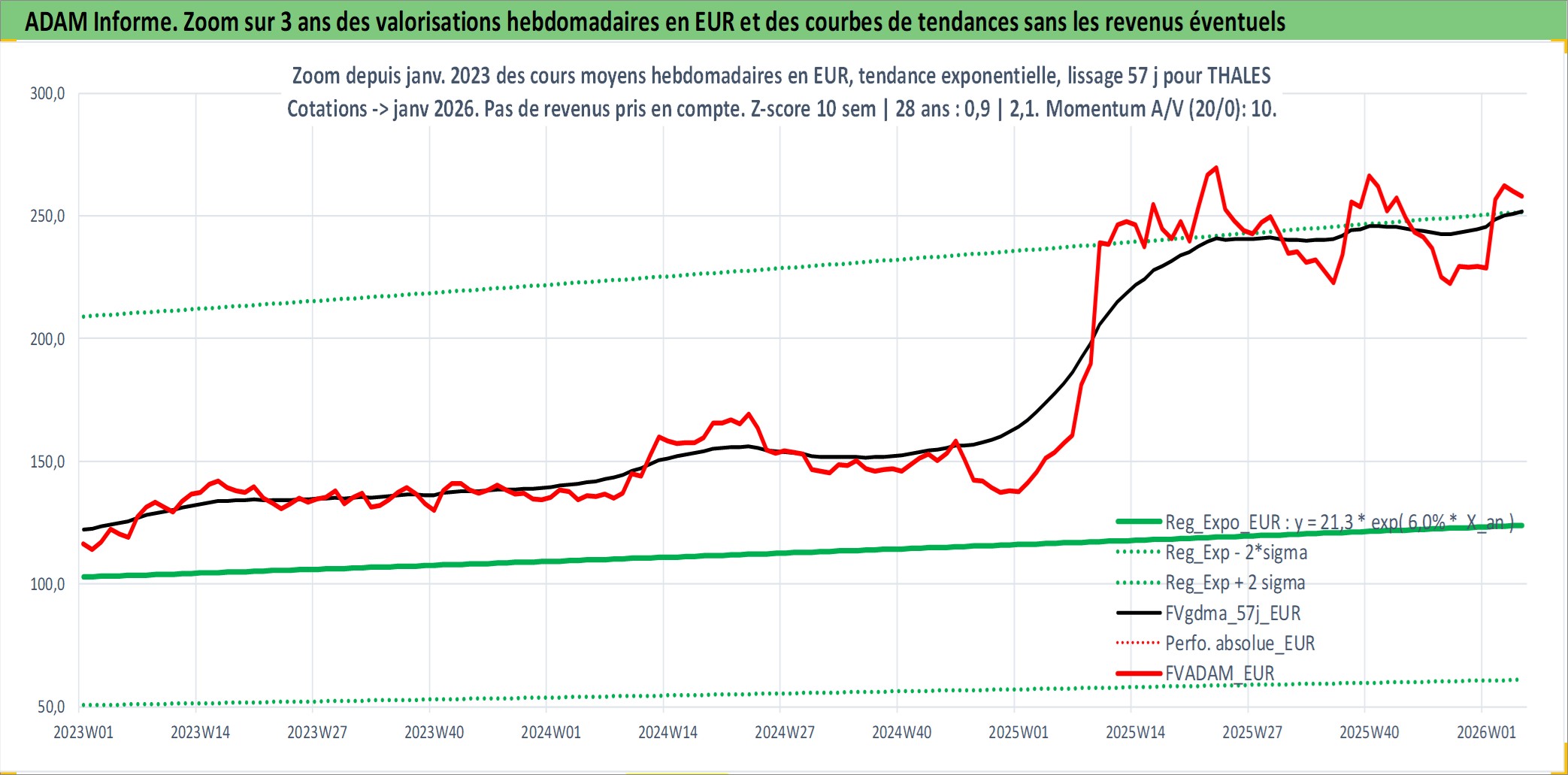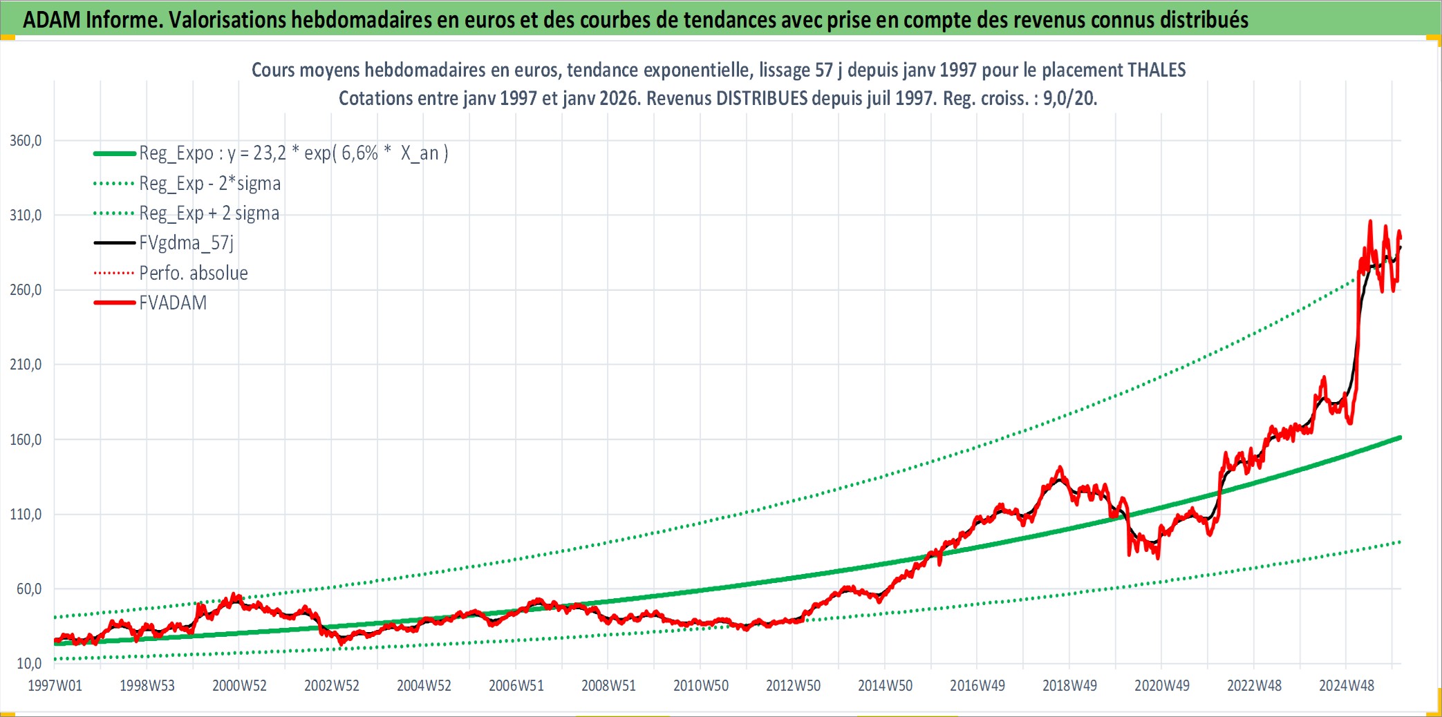 Site dédié aux investisseursPage dédiée sur site financeAnalyse des valorisations hebdomadaires de l'action THALES. Cet actif est cote en EUR. Les valorisations couvrent les semaines 1997W01 a 2026W05. Les revenus de cet actif financier sont pris en compte depuis la semaine 1997W28. La note globale ESG de cet actif est estimee a 6.0 (apres rebasage entre 0 et 20).