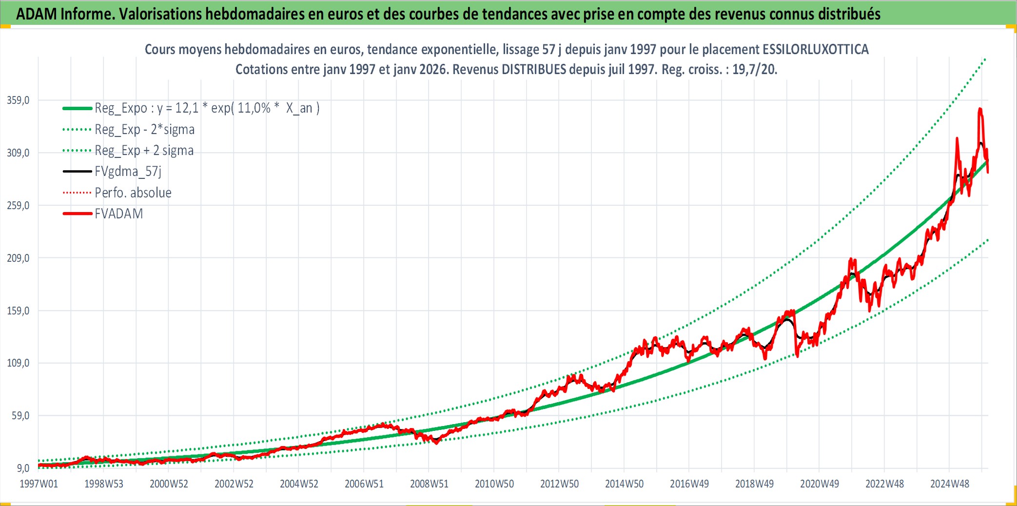 Site dédié aux investisseursPage dédiée sur site financeAnalyse des valorisations hebdomadaires de l'action ESSILORLUXOTTICA. Cet actif est cote en EUR. Les valorisations couvrent les semaines 1997W01 a 2026W05. Les revenus de cet actif financier sont pris en compte depuis la semaine 1997W27. La note globale ESG de cet actif est estimee a 10.0 (apres rebasage entre 0 et 20).