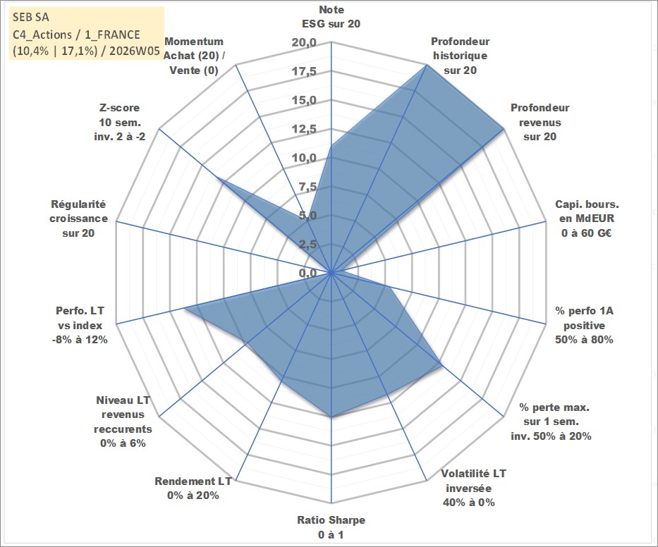 Site dédié aux investisseursPage dédiée sur site financeAnalyse des valorisations hebdomadaires de l'action SEB SA. Cet actif est cote en EUR. Les valorisations couvrent les semaines 1997W01 a 2026W05. Les revenus de cet actif financier sont pris en compte depuis la semaine 1997W24. La note globale ESG de cet actif est estimee a 11.0 (apres rebasage entre 0 et 20).